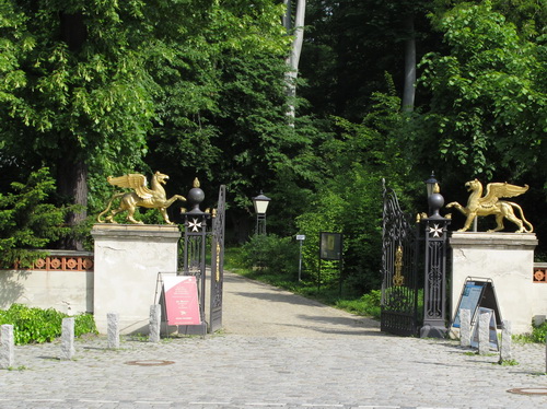 Über den Teltowkanal erreichen wir eine kleine Wohnsiedlung (Klein Glienicke, km 8). Für nur ein ganz kurzes Stück sind wir im Berliner Bezirk Wannsee, werden aber mit Sehenswürdigkeiten überschüttet. Leider kann man von dem Jagdschloss (um 1682 erbaut) hinter der hohen Schutzmauer kaum was sehen. Auch vom Schloss Glienicke (km 9) sieht man nicht viel mehr als den von zwei goldenen geflügelten Löwen bewachten Zugang an der Berliner Straße.