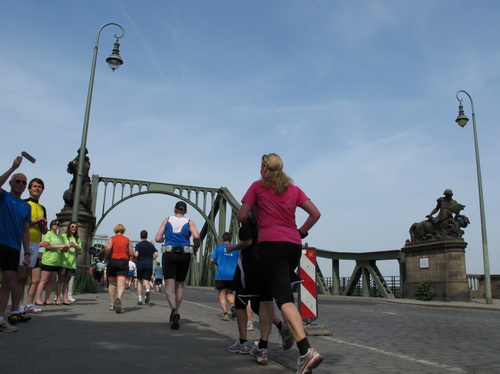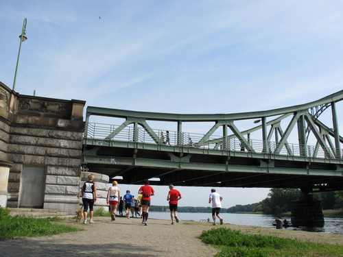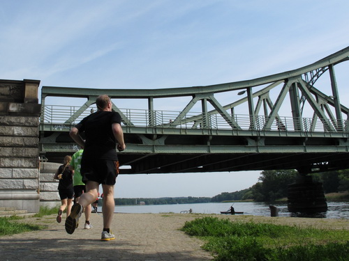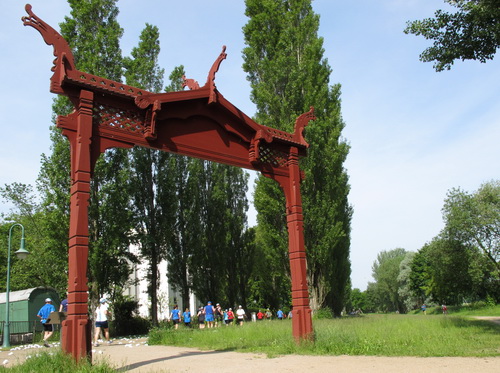 Nach 5 Kilometern sind wir auf der Humboldtbrücke und gleich darauf im Grünen im Park Babelsberg am Havelufer. Aufmerksamen Beobachtern entgeht der markante, mit Zinnen verzierte Flatowturm (1856) nicht. Und fleißige Marathonläufer erkennen auch sofort, dass es sich um eine „Kopie“ des Eschenheimer Turms in Frankfurt handelt. Aus neuerer Zeit, aber ebenfalls das Zeug zum Evergreen hat das Hans-Otto-Theater am anderen Ufer des Tiefen Sees. Ist die Ähnlichkeit mit der Oper in Sidney Zufall, oder setzen die modernen Baumeister die Tradition des „Abkupferns“ fort?