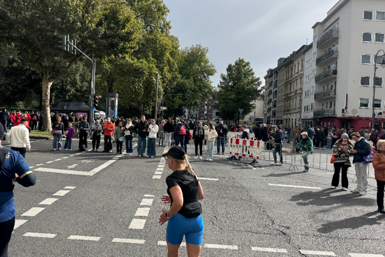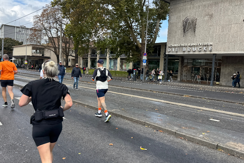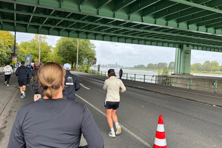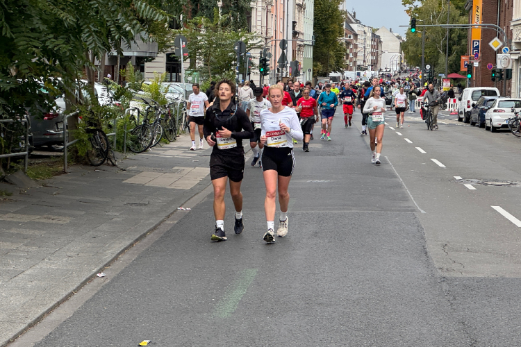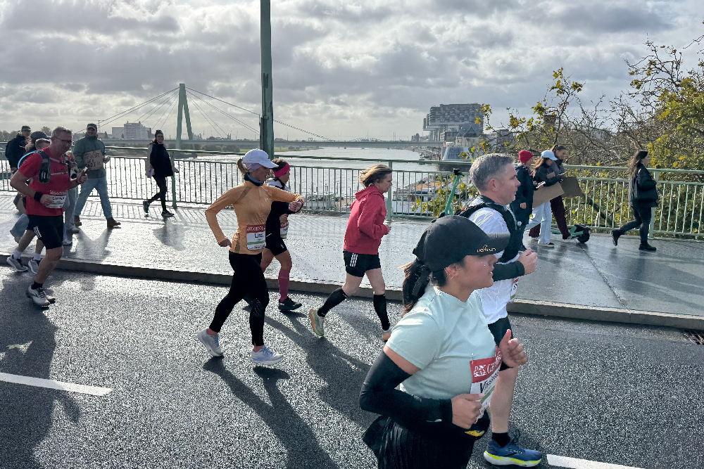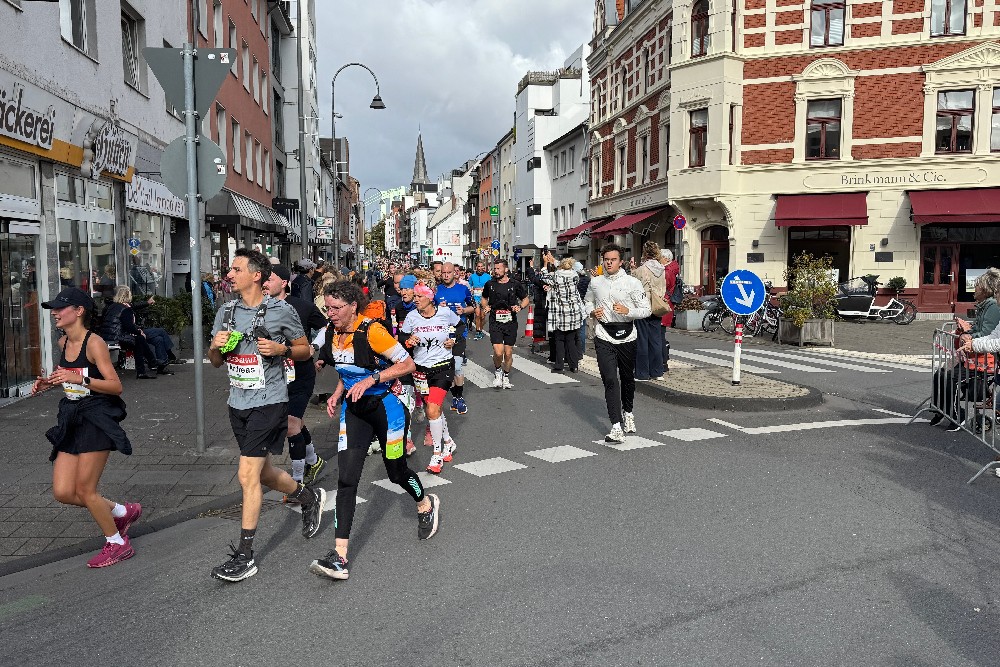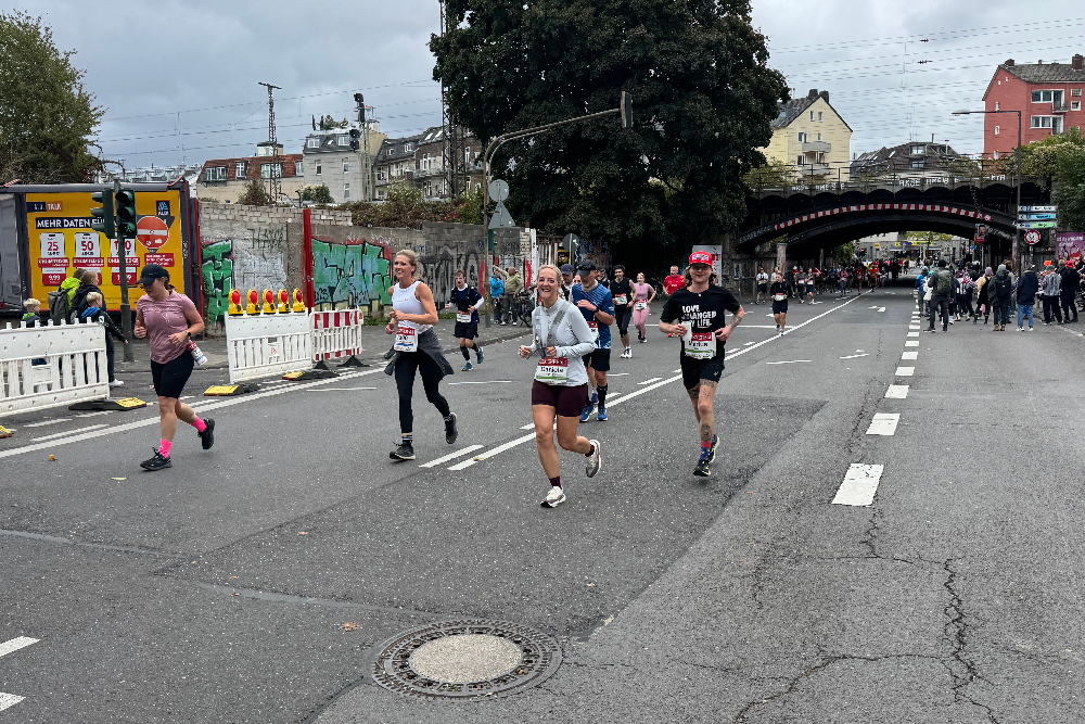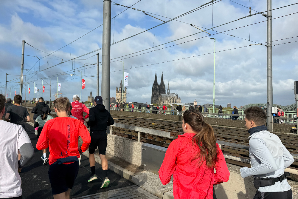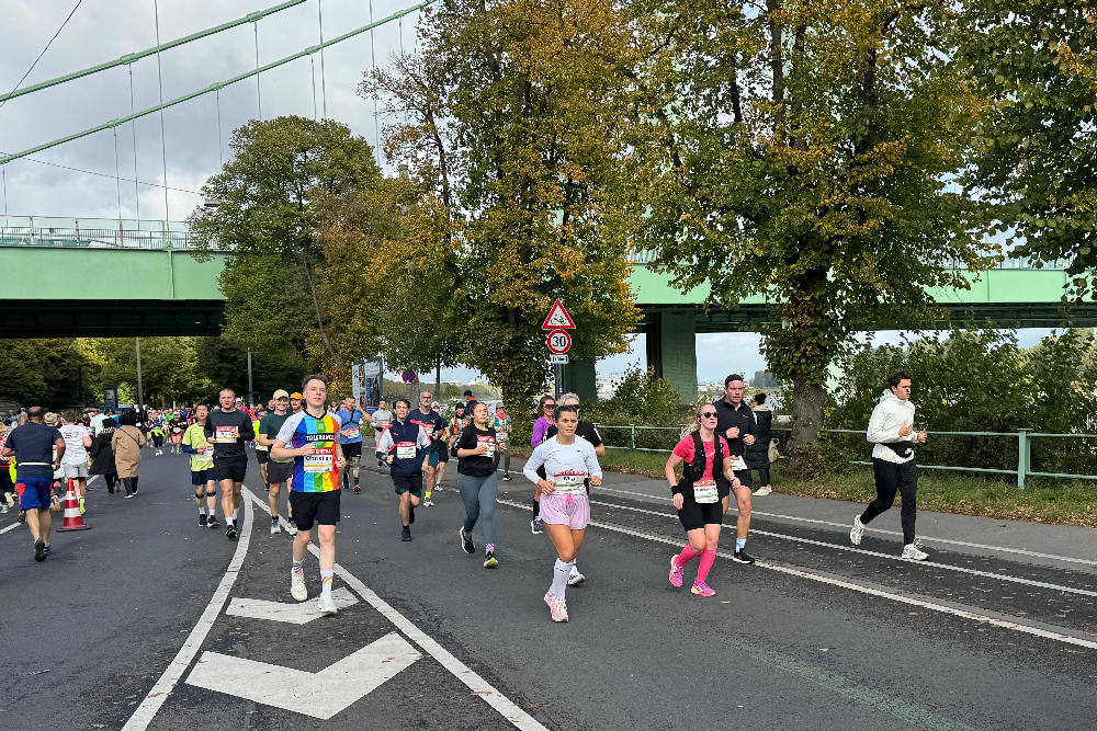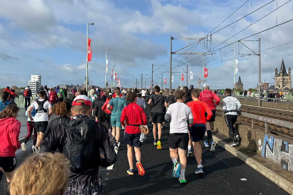 10:50 Uhr - der Sprecher ist ganz wehmütig: „Der letzte Start des Tages“ - und endlich geht es auf die Strecke. Die Straße ist breit und man merkt, dass die Laufenden sich richtig eingeschätzt haben. Gedränge wird es vorerst nicht geben. Wir werden weniger als einen Kilometer auf der sogenannten „Schäl Sick“, der „schlechten“ Rheinseite von Köln, bleiben. Highlight ist der frische Teerbelag der Deutzer Brücke oder doch eher noch der Ausblick auf den Rhein. Links die sogenannten Kranhäuser, rechts die Silhouette der Altstadt von Köln mit dem Dom.