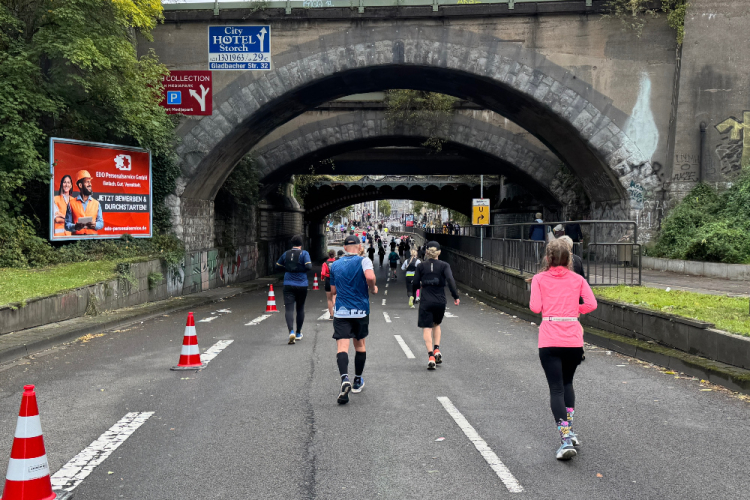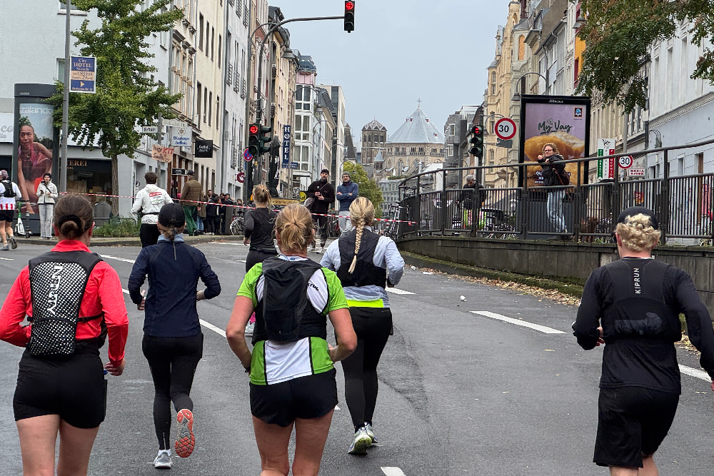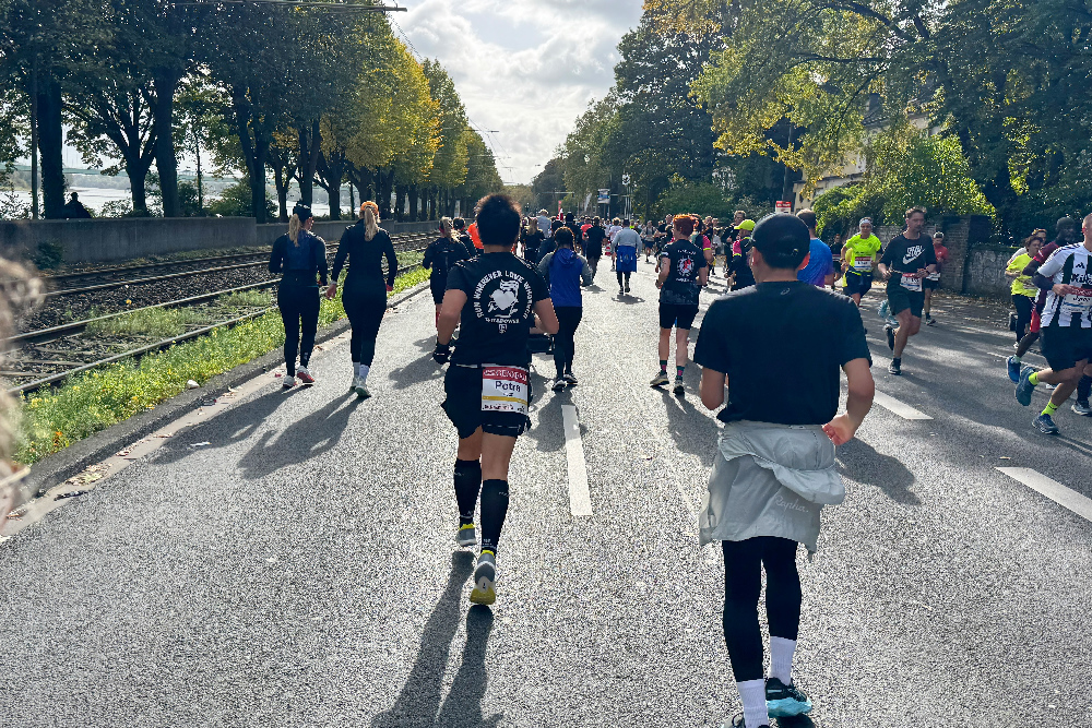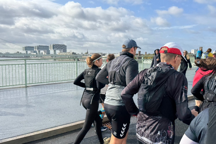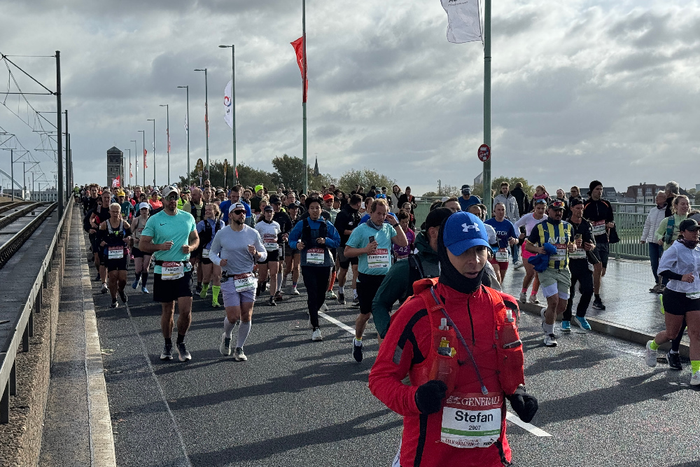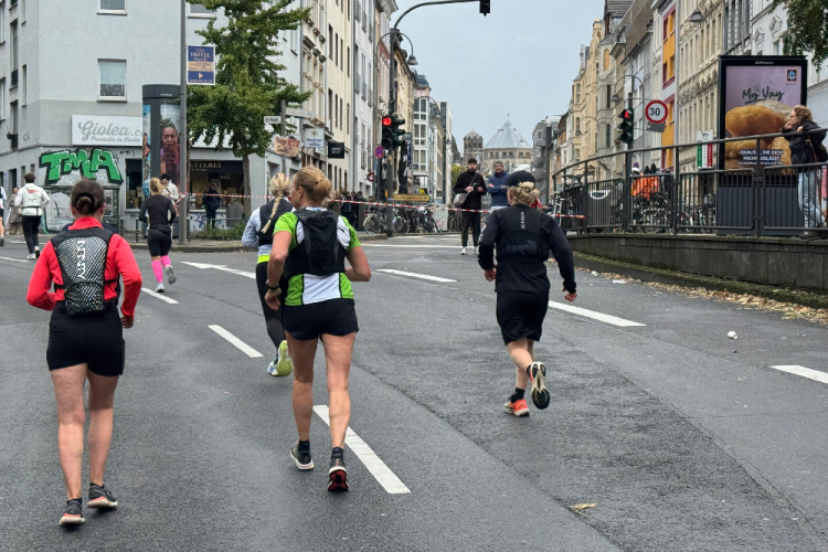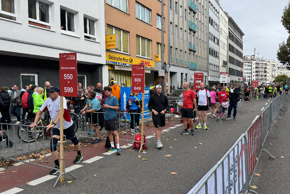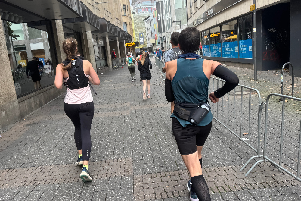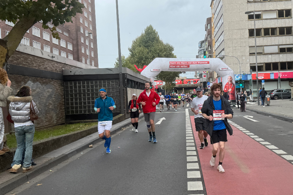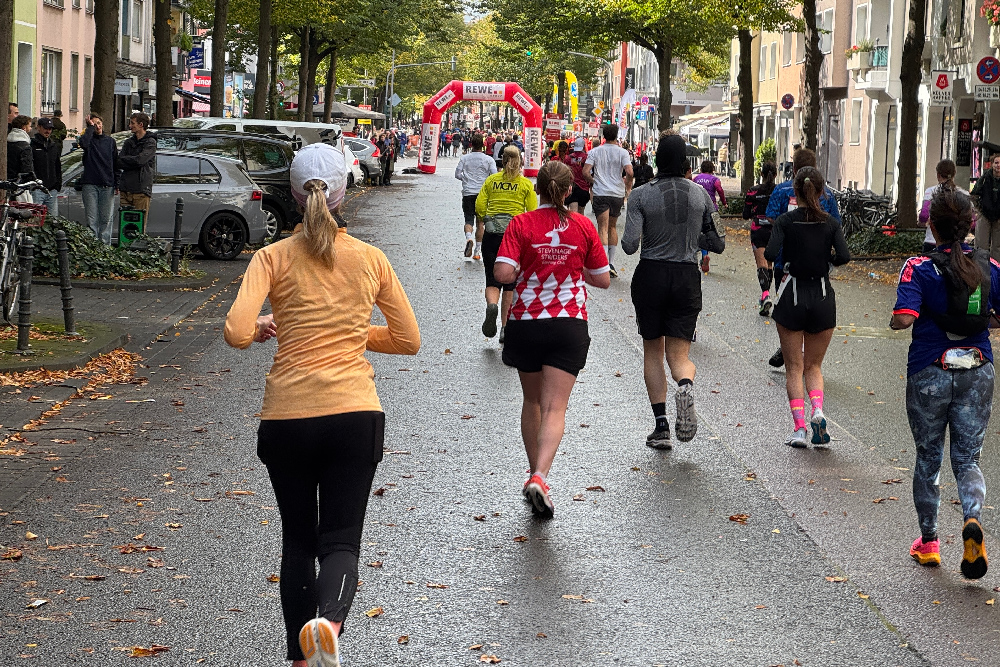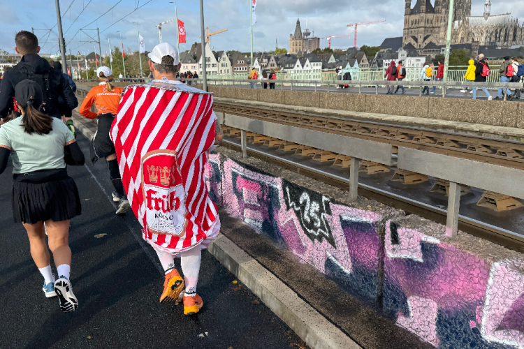 10:50 Uhr - der Sprecher ist ganz wehmütig: „Der letzte Start des Tages“ - und endlich geht es auf die Strecke. Die Straße ist breit und man merkt, dass die Laufenden sich richtig eingeschätzt haben. Gedränge wird es vorerst nicht geben. Wir werden weniger als einen Kilometer auf der sogenannten „Schäl Sick“, der „schlechten“ Rheinseite von Köln, bleiben. Highlight ist der frische Teerbelag der Deutzer Brücke oder doch eher noch der Ausblick auf den Rhein. Links die sogenannten Kranhäuser, rechts die Silhouette der Altstadt von Köln mit dem Dom.