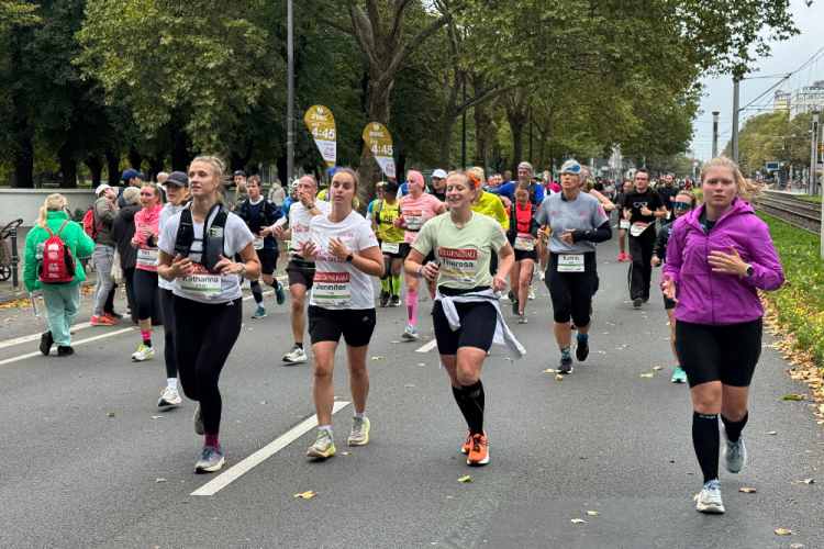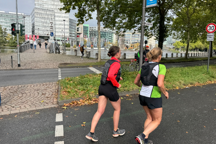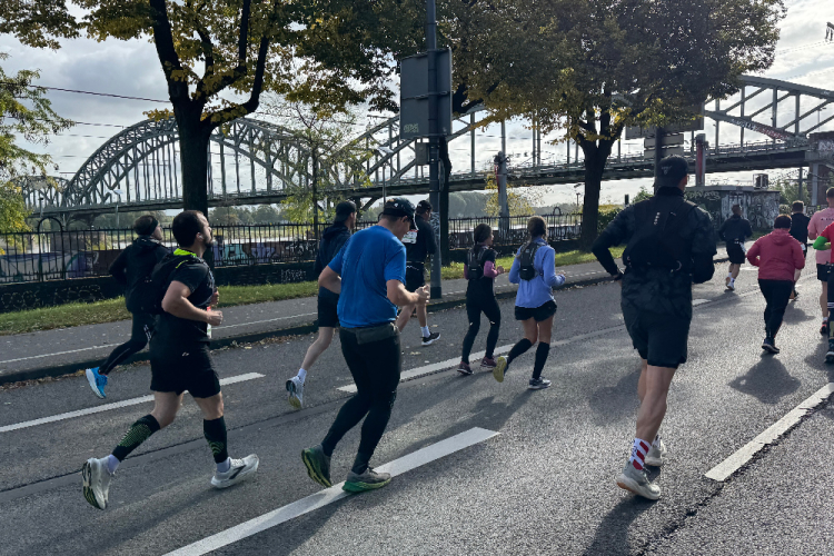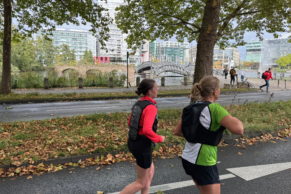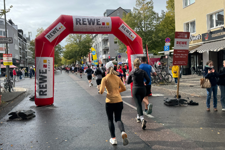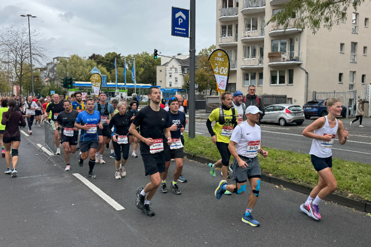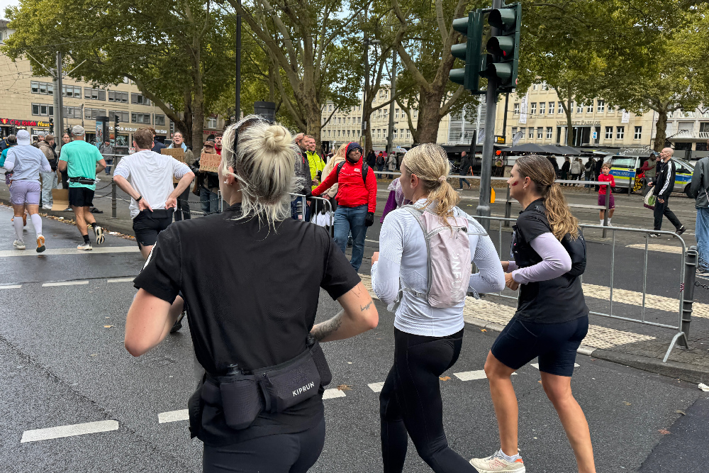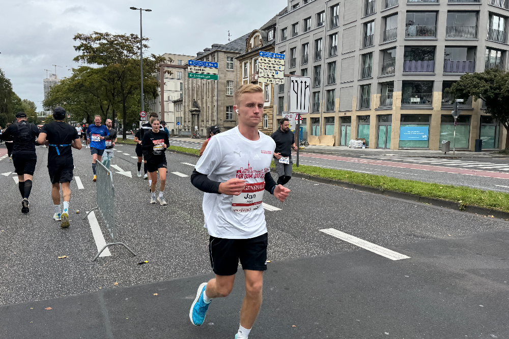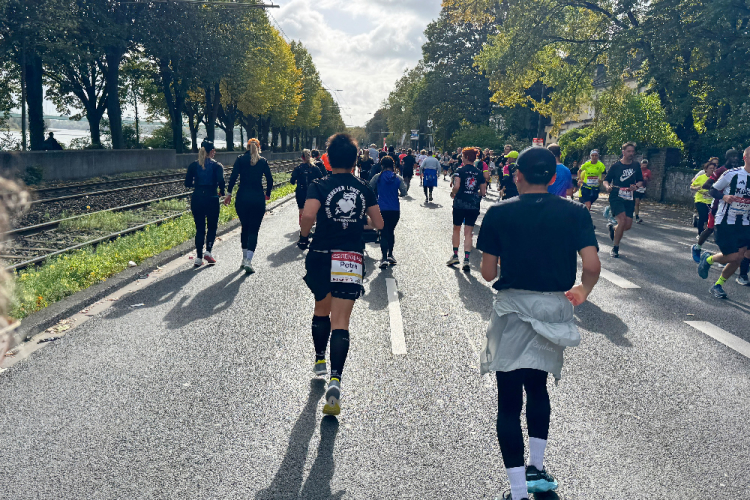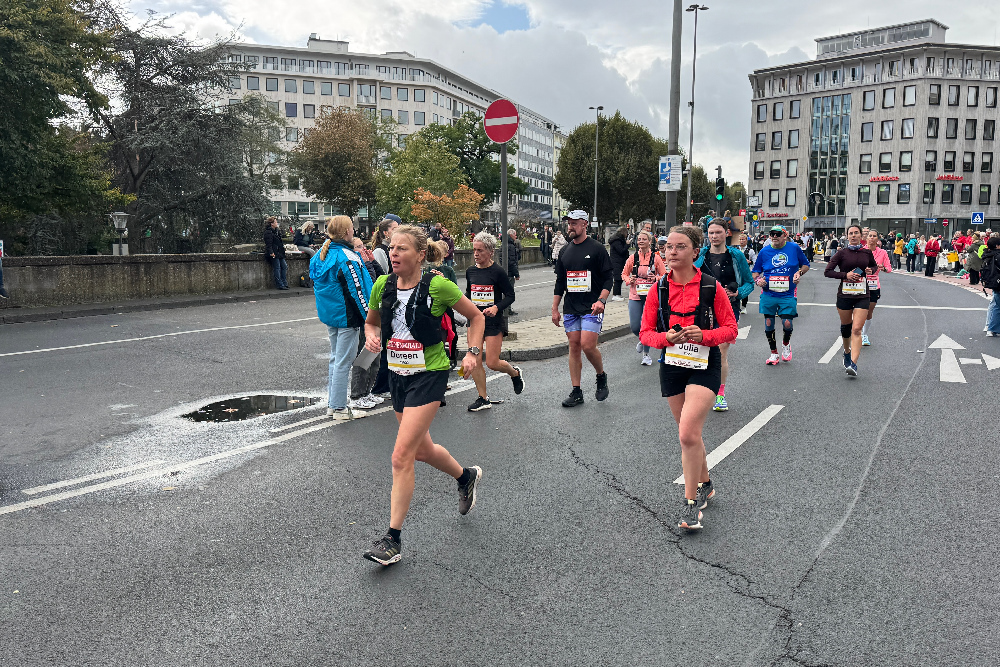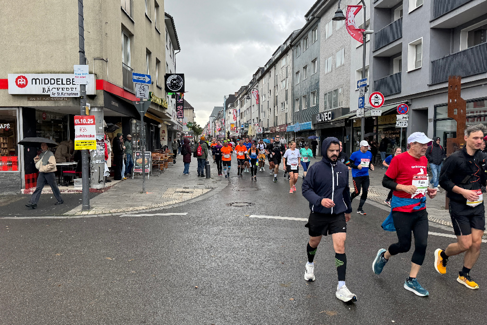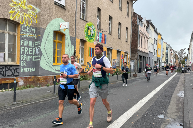 10:50 Uhr - der Sprecher ist ganz wehmütig: „Der letzte Start des Tages“ - und endlich geht es auf die Strecke. Die Straße ist breit und man merkt, dass die Laufenden sich richtig eingeschätzt haben. Gedränge wird es vorerst nicht geben. Wir werden weniger als einen Kilometer auf der sogenannten „Schäl Sick“, der „schlechten“ Rheinseite von Köln, bleiben. Highlight ist der frische Teerbelag der Deutzer Brücke oder doch eher noch der Ausblick auf den Rhein. Links die sogenannten Kranhäuser, rechts die Silhouette der Altstadt von Köln mit dem Dom.