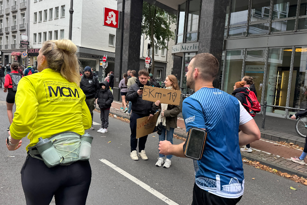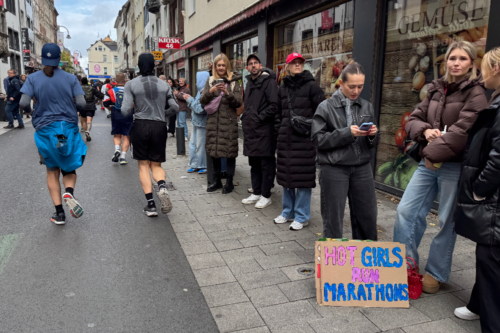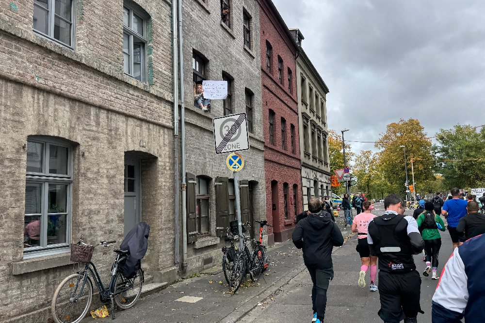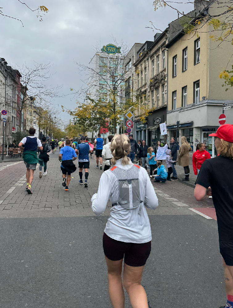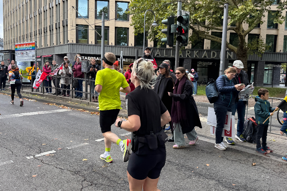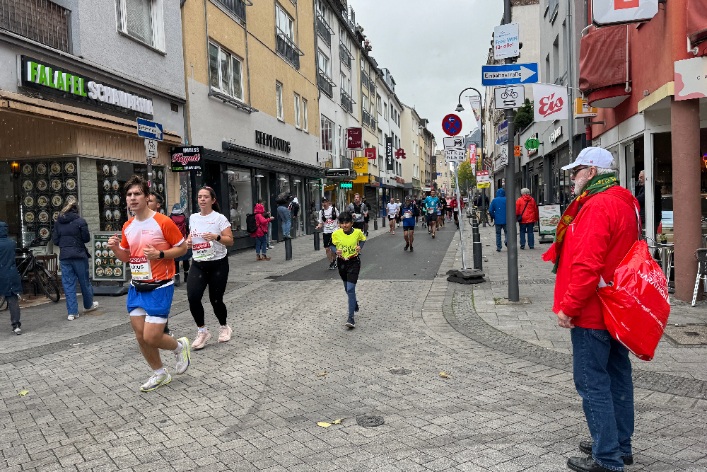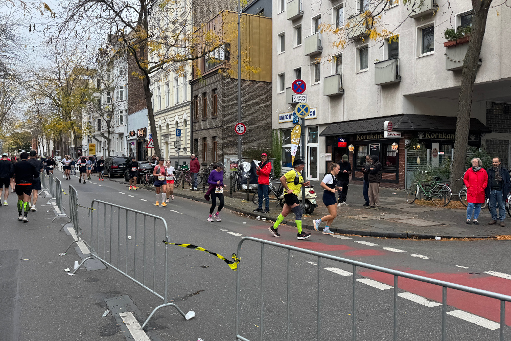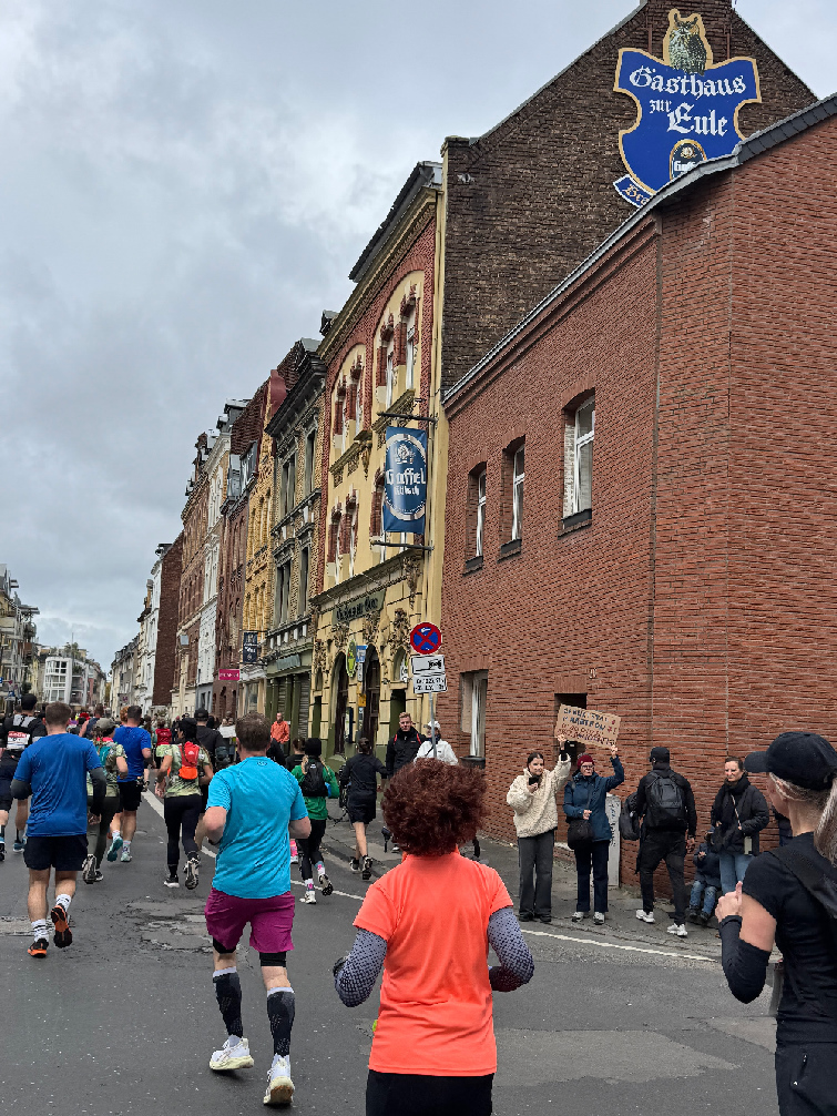 Die Strecke? Zunächst eine 13 km lange Schleife rheinauf- und dann rheinabwärts, dann kreuz und quer durch die Kölner Viertel (Veedel). Perfekt für einen Stadtmarathon, der diesen Namen wirklich verdient. An der großen Straße steht deshalb auch „Köln Marathon - die Innenstadt bitte meiden“. Gilt aber nicht für uns.