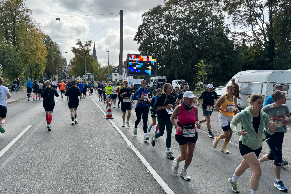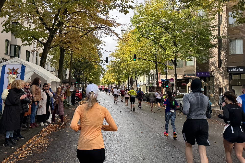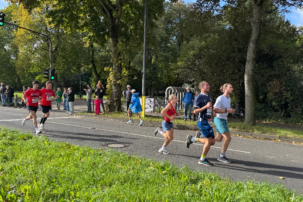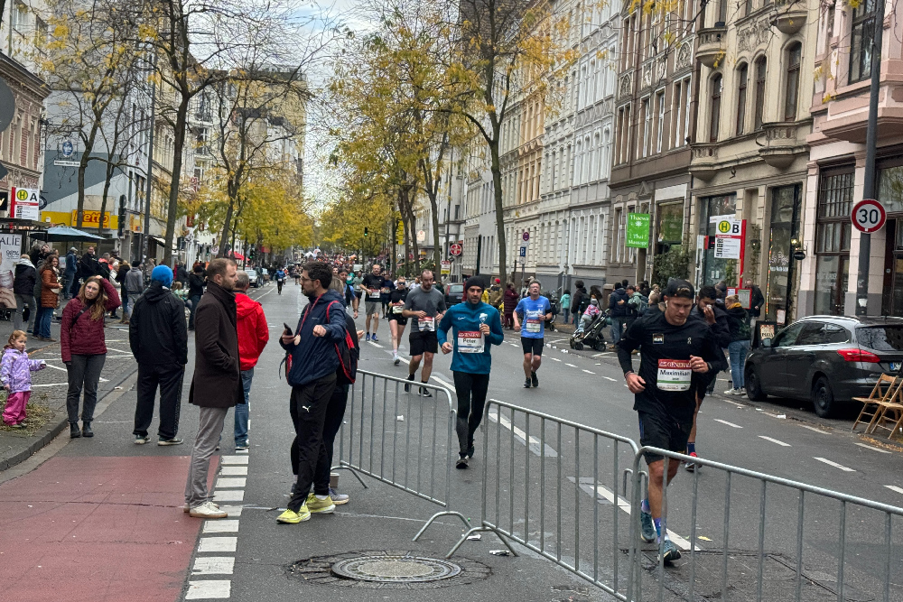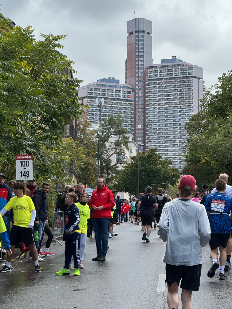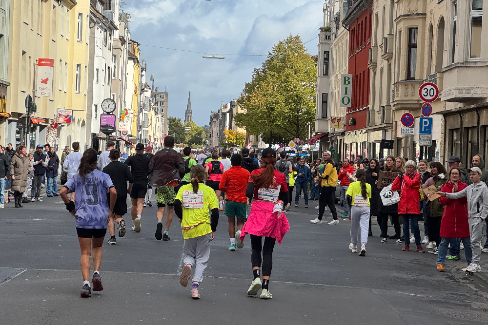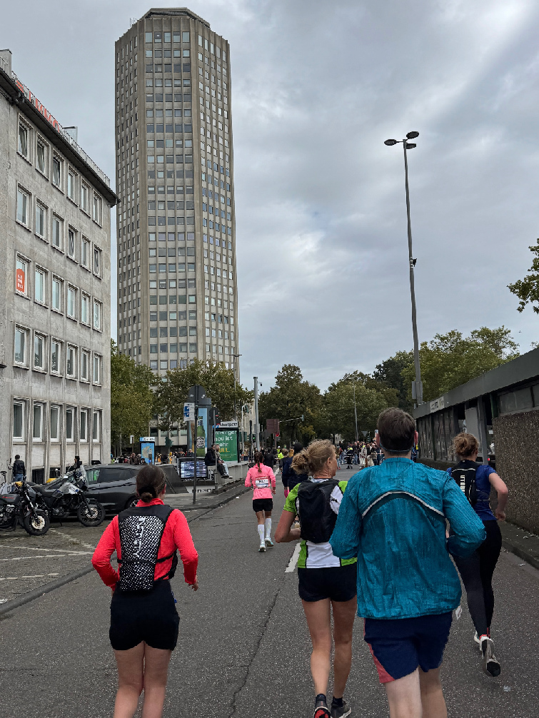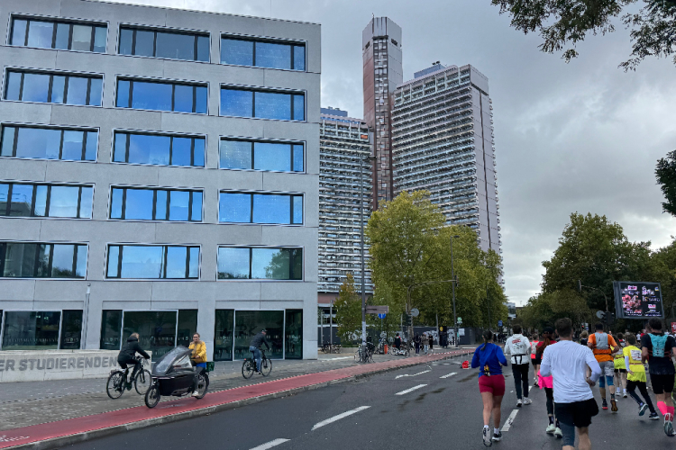 Wir sind aktuell am Barbarossaplatz. Bahndamm, Unterführung, weiter ins Uni-Viertel. Oben brummen die Bässe. Ansonsten ist der Kurs sehr flach. Vor uns ein riesiges Haus. Das Uni-Center, 1973 fertiggestellt, gehört mit 968 Einheiten zu den größten Wohnhäusern Europas. Ein Teil des Y-förmigen Gebäudes wird vom Studentenwerk vermietet. Gefühlt alle paar Kilometer eine Trommelgruppe. Dann Szenenwechsel. Pappelallee mit Trambahn dazwischen. Erinnert mich irgendwie an Mailand. Aber aufgemerkt: Dort sind eher keine Zuschauer an der Strecke. Also ist es doch besser hier.