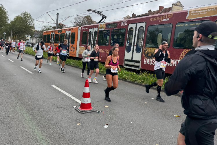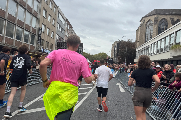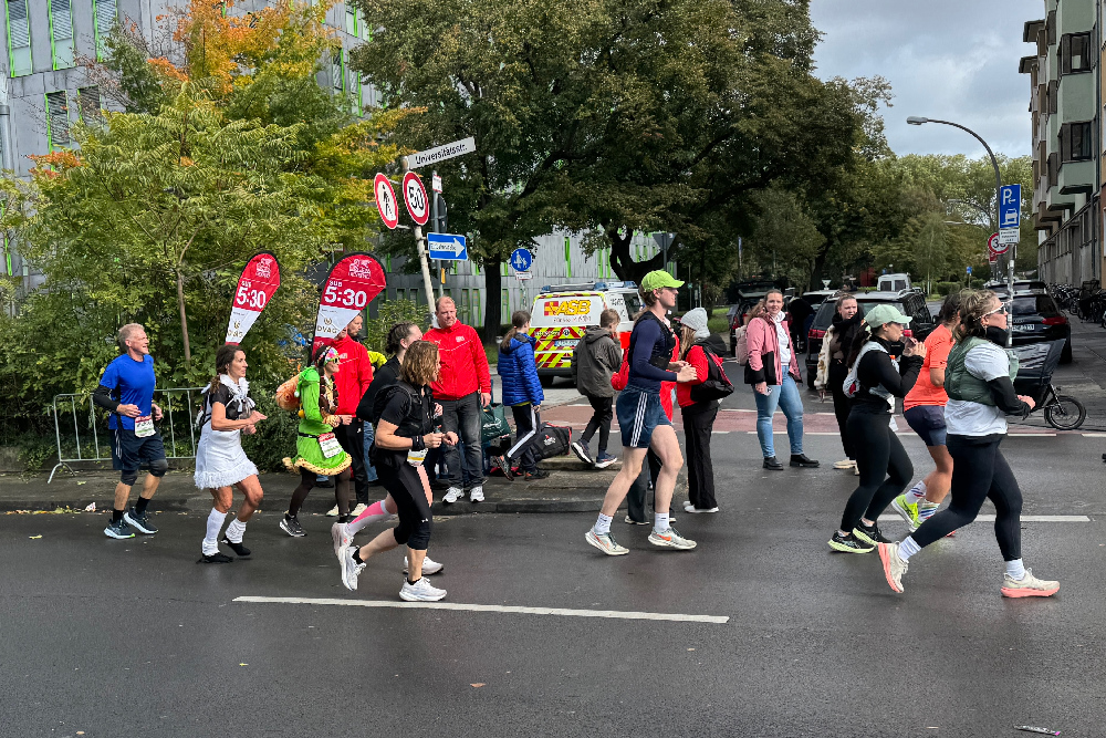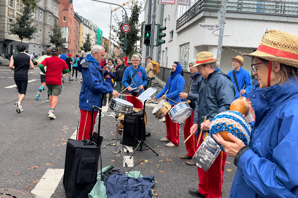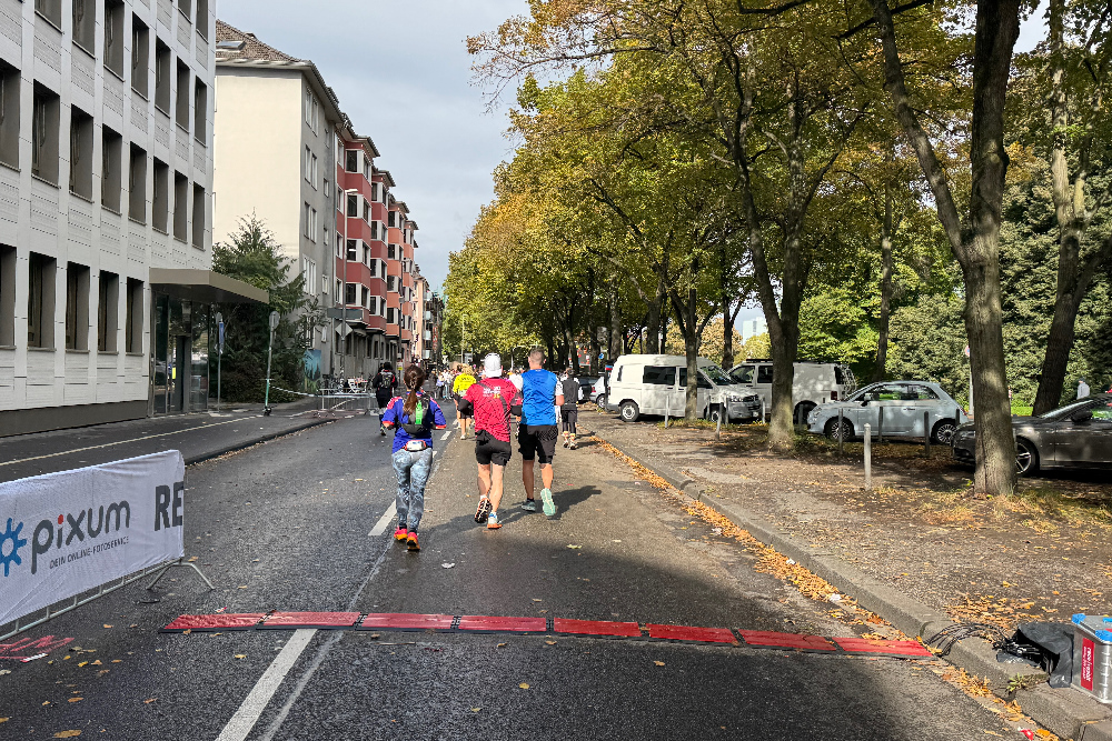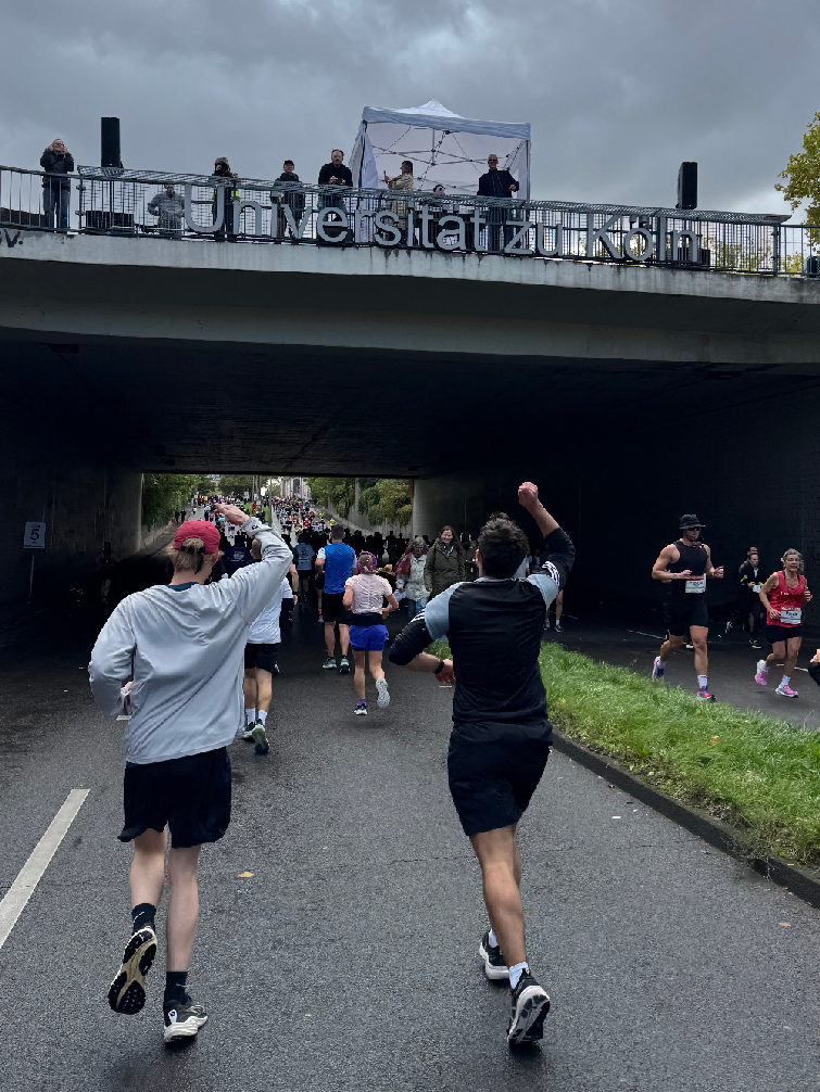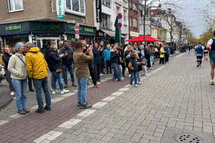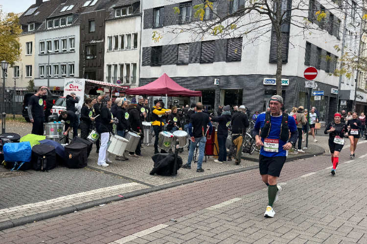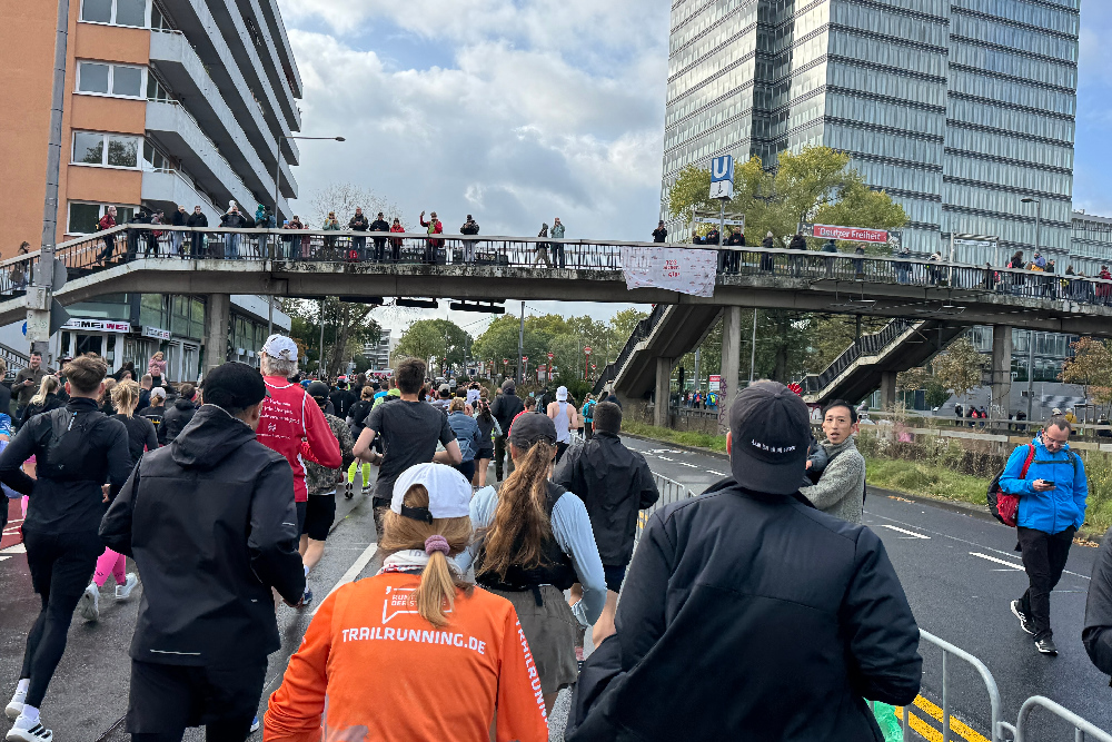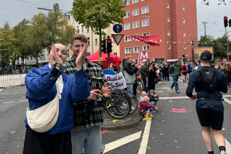 Wir sind aktuell am Barbarossaplatz. Bahndamm, Unterführung, weiter ins Uni-Viertel. Oben brummen die Bässe. Ansonsten ist der Kurs sehr flach. Vor uns ein riesiges Haus. Das Uni-Center, 1973 fertiggestellt, gehört mit 968 Einheiten zu den größten Wohnhäusern Europas. Ein Teil des Y-förmigen Gebäudes wird vom Studentenwerk vermietet. Gefühlt alle paar Kilometer eine Trommelgruppe. Dann Szenenwechsel. Pappelallee mit Trambahn dazwischen. Erinnert mich irgendwie an Mailand. Aber aufgemerkt: Dort sind eher keine Zuschauer an der Strecke. Also ist es doch besser hier.