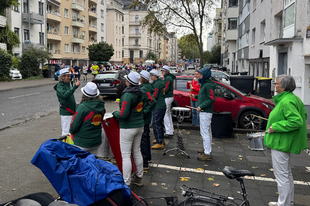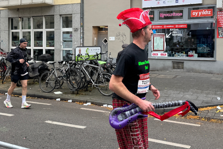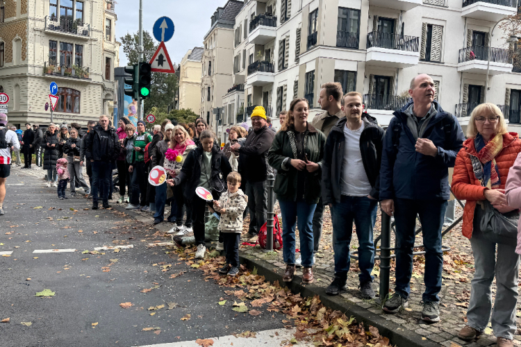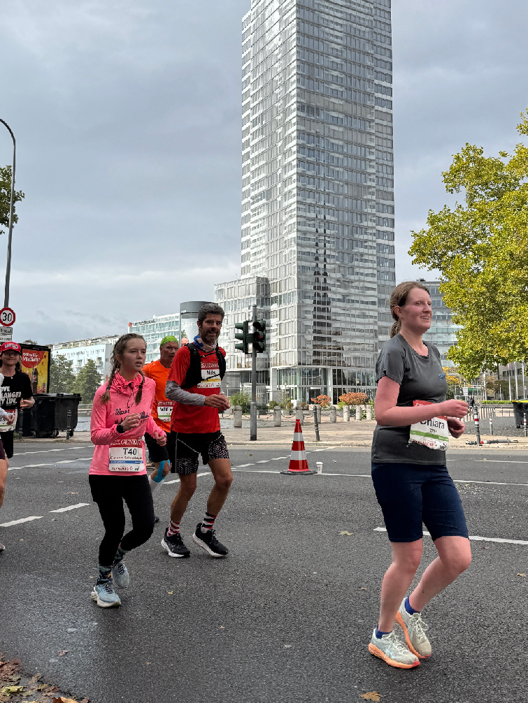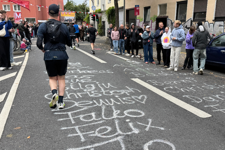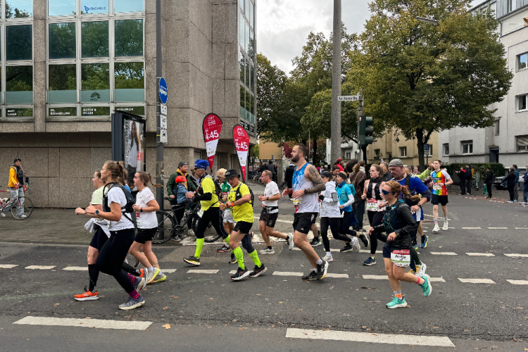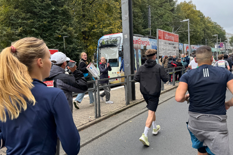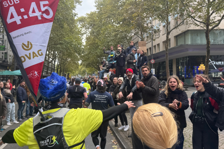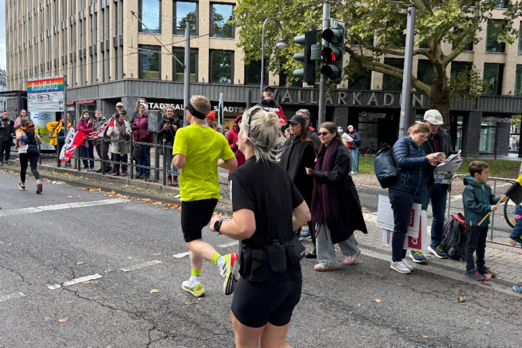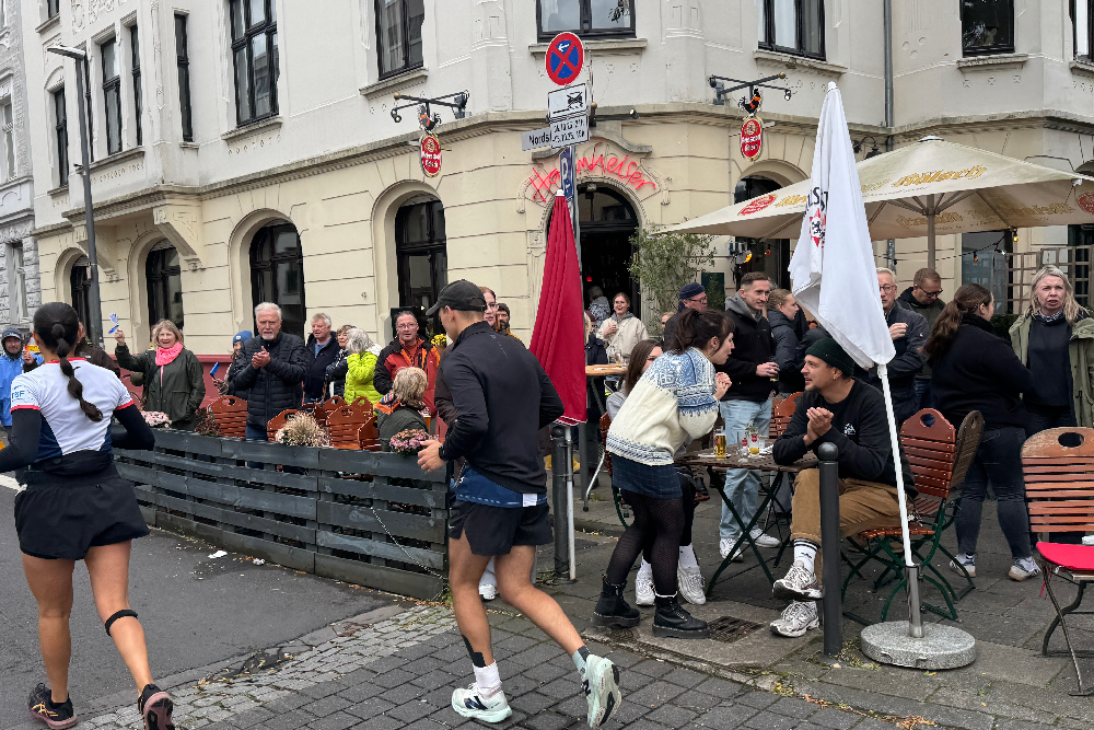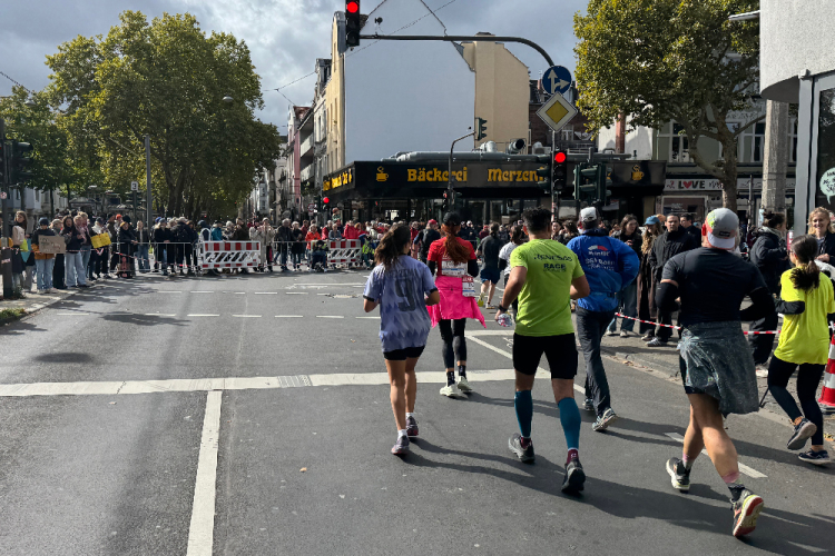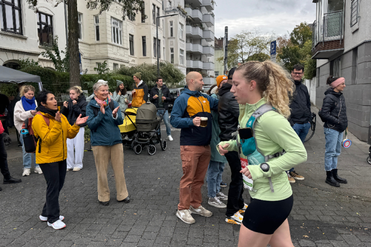 Wir sind aktuell am Barbarossaplatz. Bahndamm, Unterführung, weiter ins Uni-Viertel. Oben brummen die Bässe. Ansonsten ist der Kurs sehr flach. Vor uns ein riesiges Haus. Das Uni-Center, 1973 fertiggestellt, gehört mit 968 Einheiten zu den größten Wohnhäusern Europas. Ein Teil des Y-förmigen Gebäudes wird vom Studentenwerk vermietet. Gefühlt alle paar Kilometer eine Trommelgruppe. Dann Szenenwechsel. Pappelallee mit Trambahn dazwischen. Erinnert mich irgendwie an Mailand. Aber aufgemerkt: Dort sind eher keine Zuschauer an der Strecke. Also ist es doch besser hier.