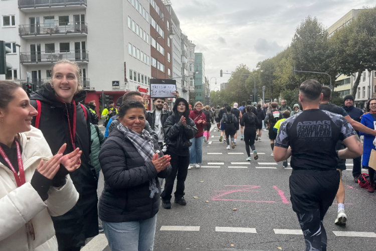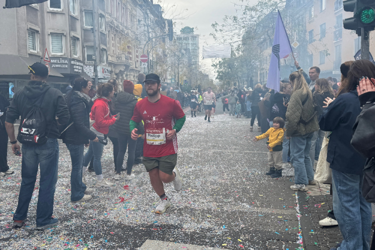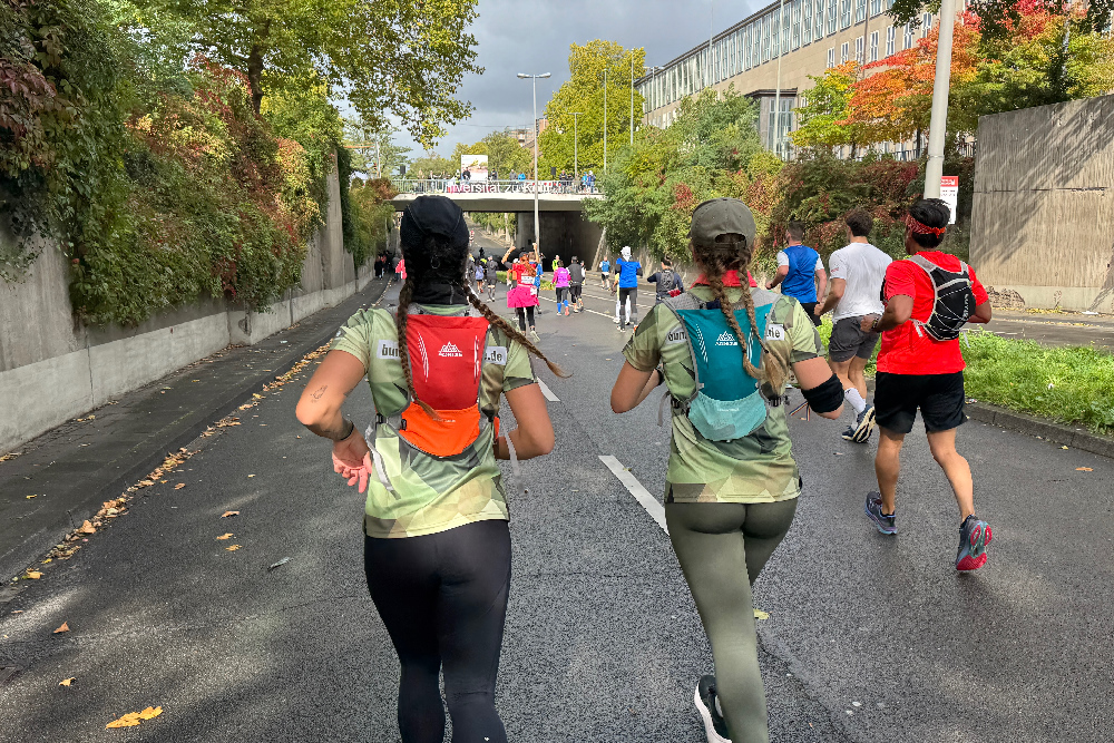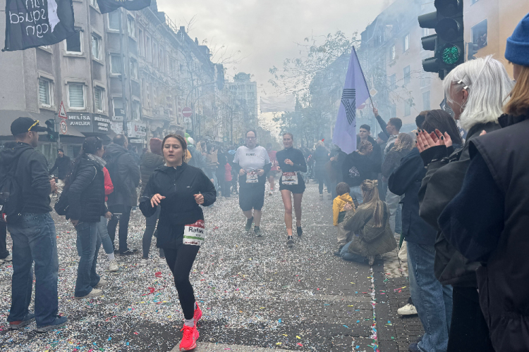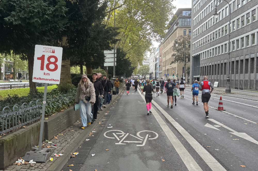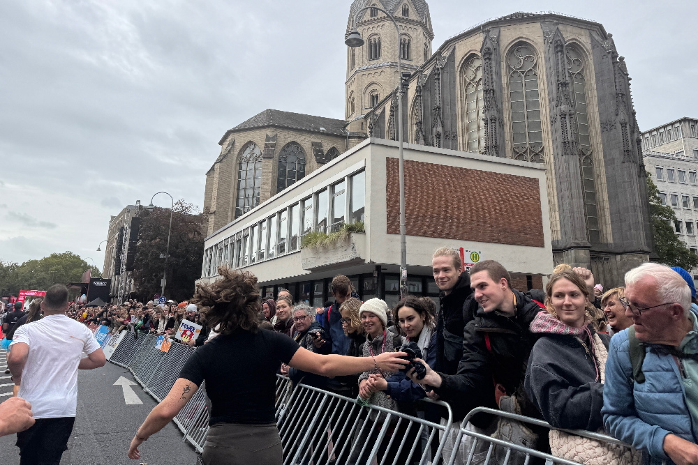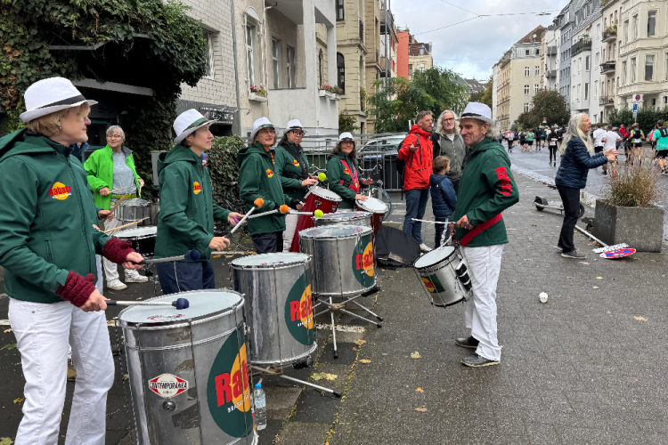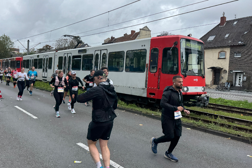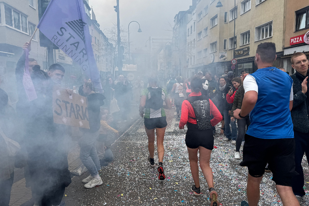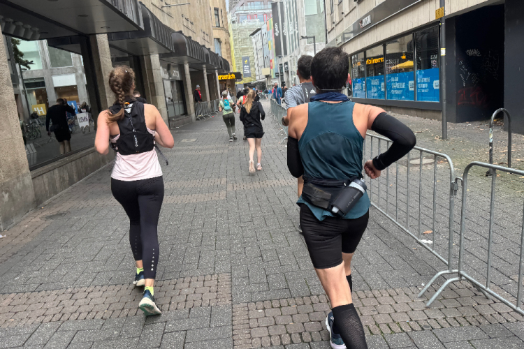 Wir sind aktuell am Barbarossaplatz. Bahndamm, Unterführung, weiter ins Uni-Viertel. Oben brummen die Bässe. Ansonsten ist der Kurs sehr flach. Vor uns ein riesiges Haus. Das Uni-Center, 1973 fertiggestellt, gehört mit 968 Einheiten zu den größten Wohnhäusern Europas. Ein Teil des Y-förmigen Gebäudes wird vom Studentenwerk vermietet. Gefühlt alle paar Kilometer eine Trommelgruppe. Dann Szenenwechsel. Pappelallee mit Trambahn dazwischen. Erinnert mich irgendwie an Mailand. Aber aufgemerkt: Dort sind eher keine Zuschauer an der Strecke. Also ist es doch besser hier.