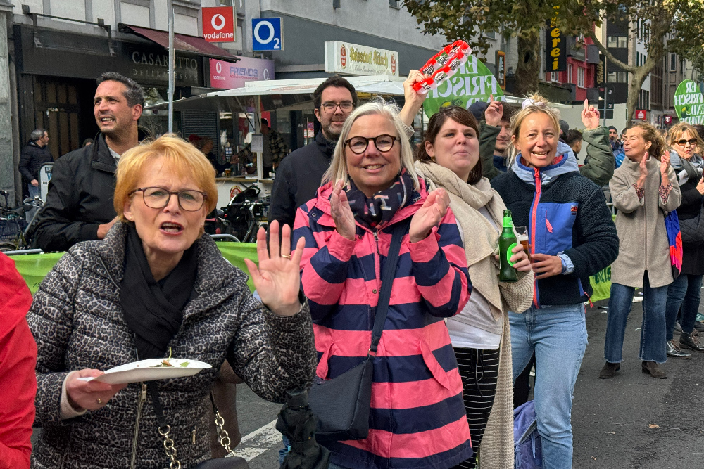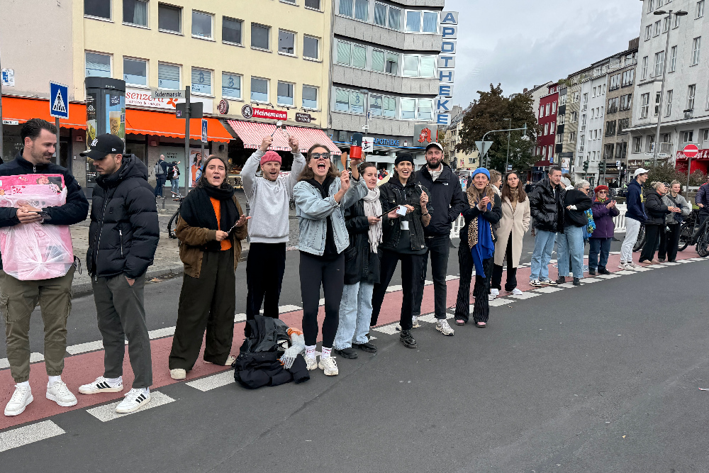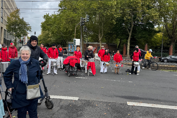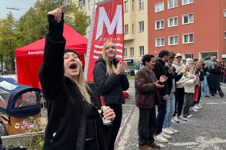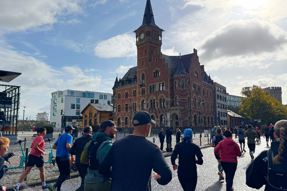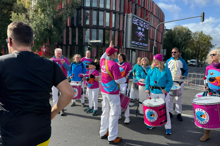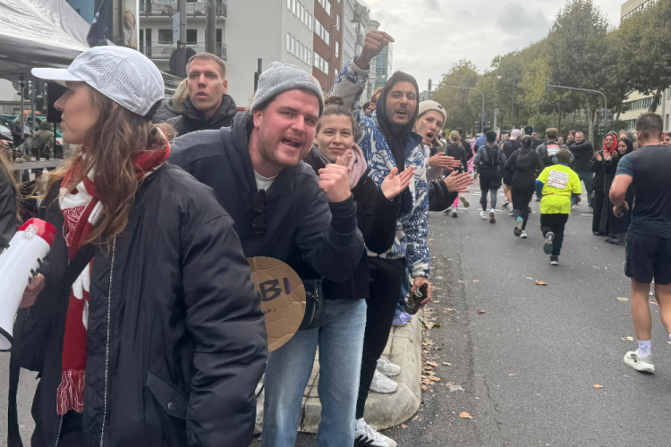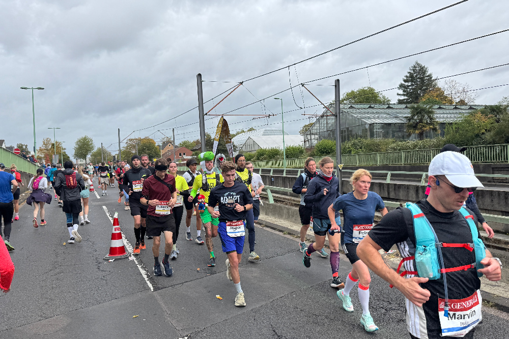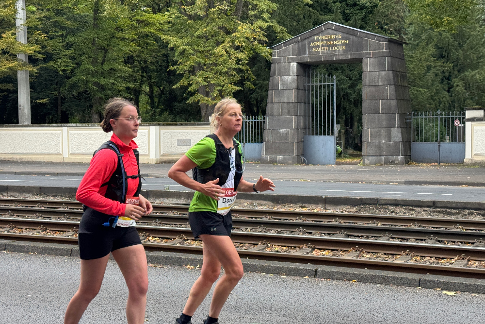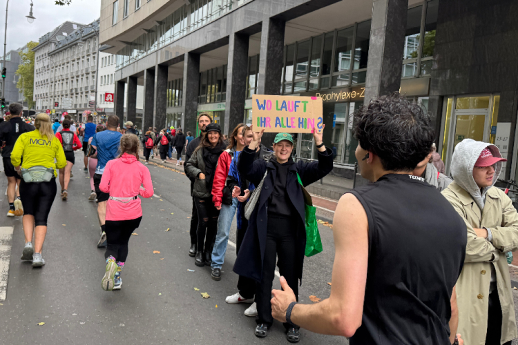 Wir sind aktuell am Barbarossaplatz. Bahndamm, Unterführung, weiter ins Uni-Viertel. Oben brummen die Bässe. Ansonsten ist der Kurs sehr flach. Vor uns ein riesiges Haus. Das Uni-Center, 1973 fertiggestellt, gehört mit 968 Einheiten zu den größten Wohnhäusern Europas. Ein Teil des Y-förmigen Gebäudes wird vom Studentenwerk vermietet. Gefühlt alle paar Kilometer eine Trommelgruppe. Dann Szenenwechsel. Pappelallee mit Trambahn dazwischen. Erinnert mich irgendwie an Mailand. Aber aufgemerkt: Dort sind eher keine Zuschauer an der Strecke. Also ist es doch besser hier.