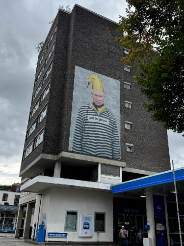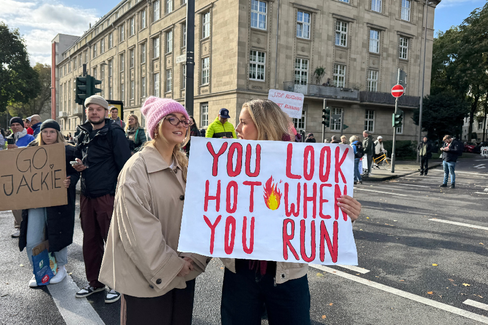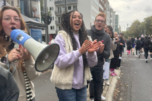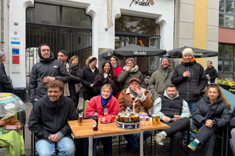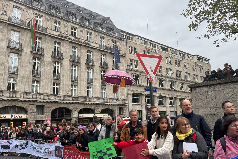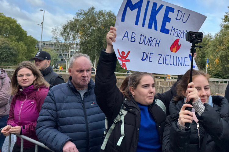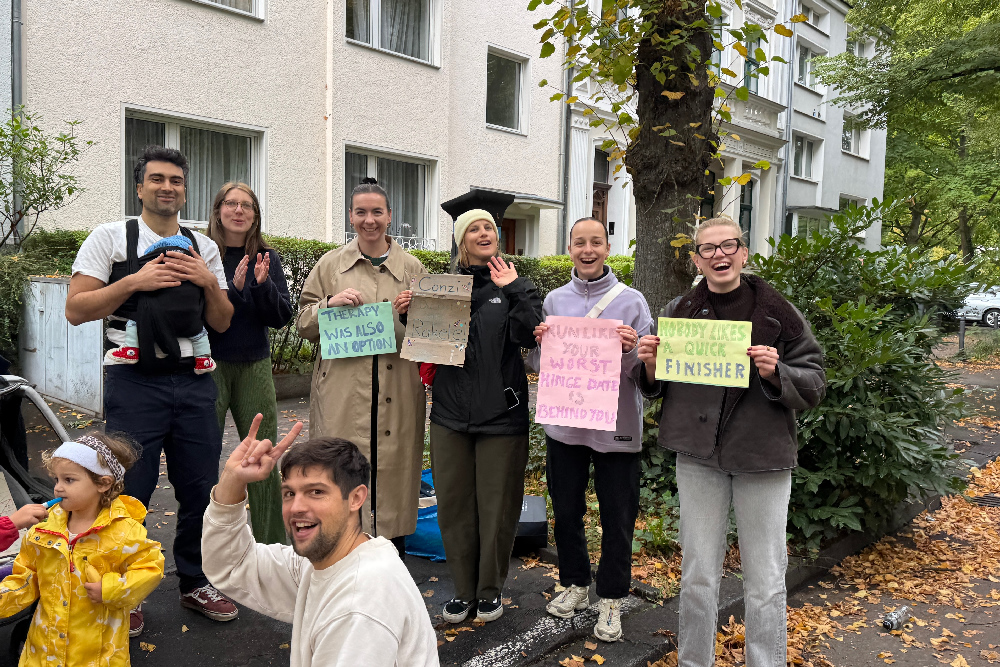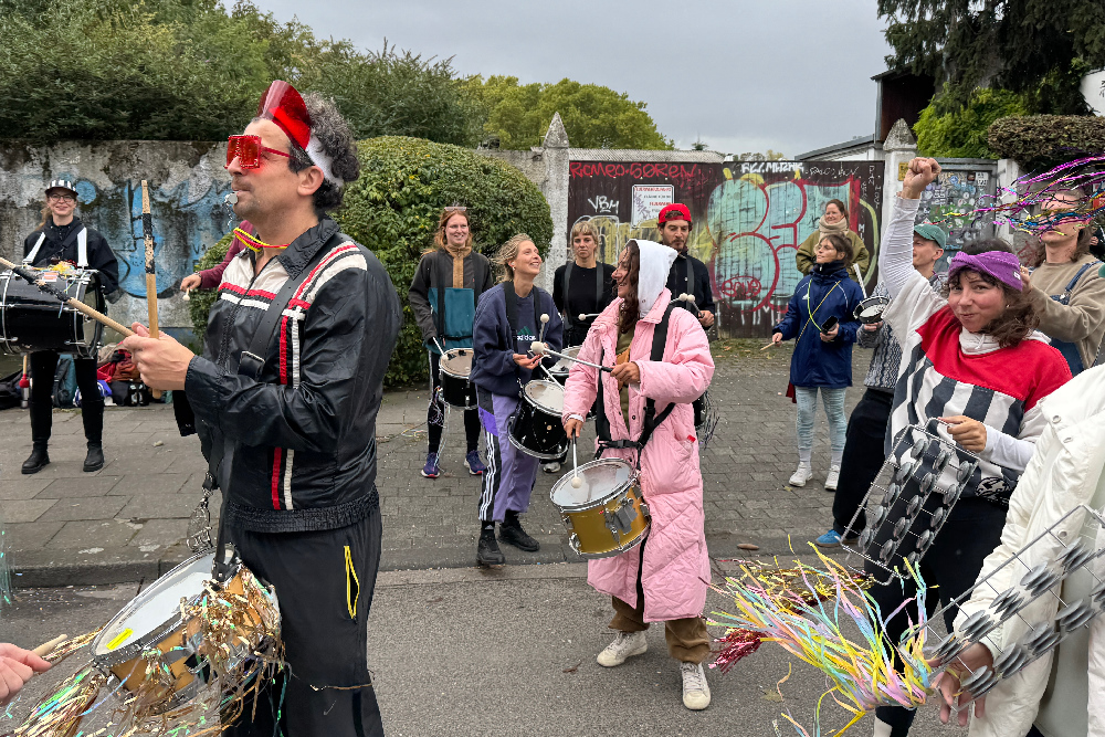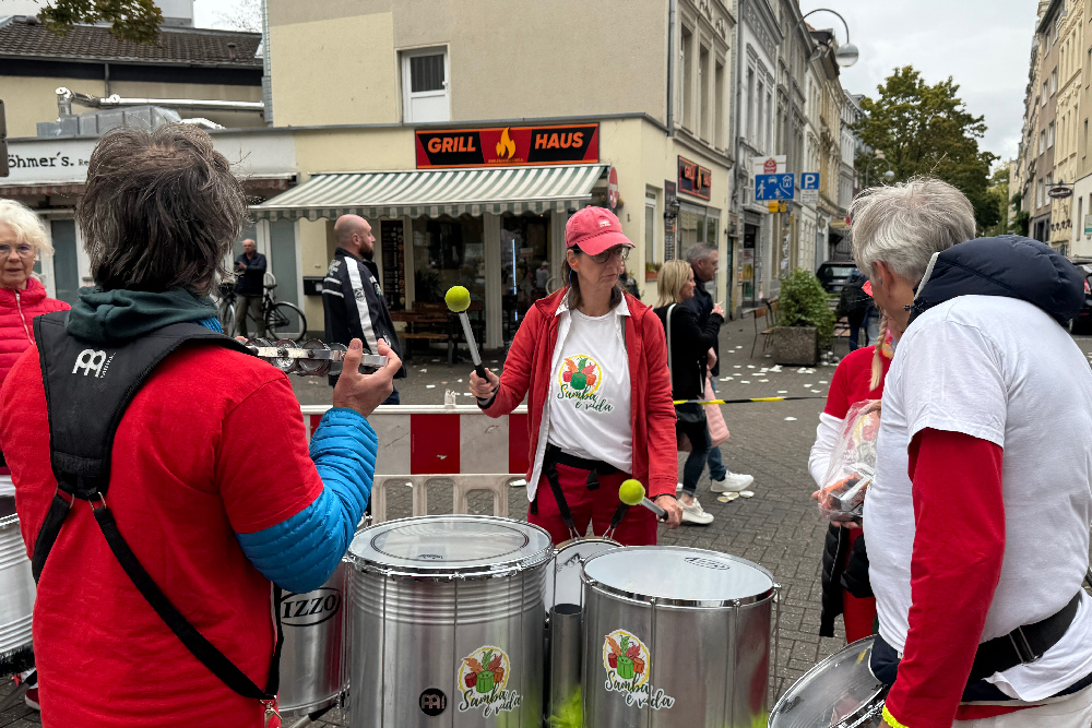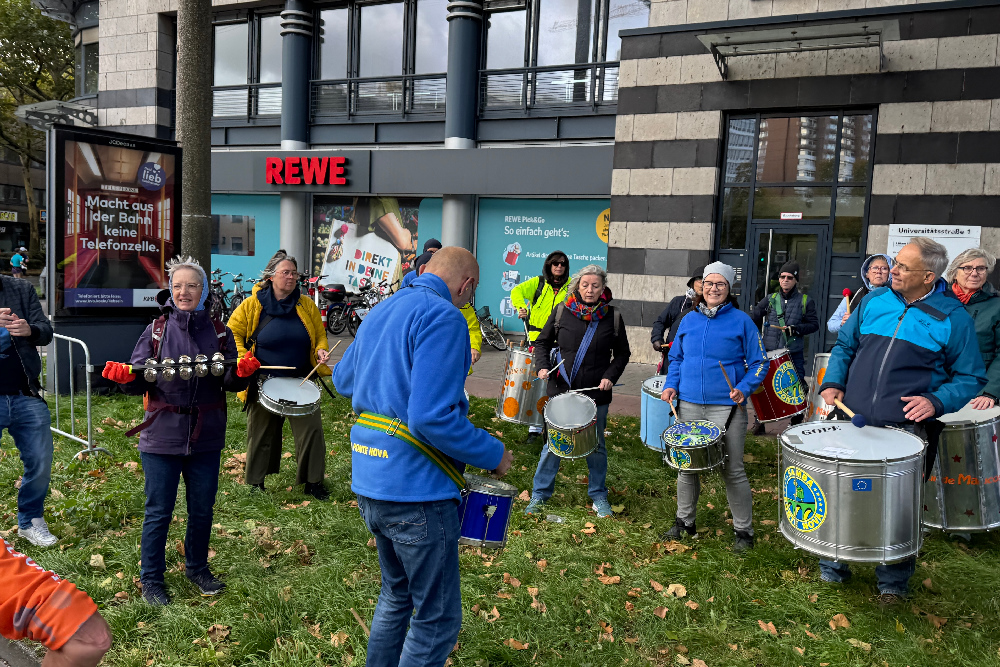 Wir sind aktuell am Barbarossaplatz. Bahndamm, Unterführung, weiter ins Uni-Viertel. Oben brummen die Bässe. Ansonsten ist der Kurs sehr flach. Vor uns ein riesiges Haus. Das Uni-Center, 1973 fertiggestellt, gehört mit 968 Einheiten zu den größten Wohnhäusern Europas. Ein Teil des Y-förmigen Gebäudes wird vom Studentenwerk vermietet. Gefühlt alle paar Kilometer eine Trommelgruppe. Dann Szenenwechsel. Pappelallee mit Trambahn dazwischen. Erinnert mich irgendwie an Mailand. Aber aufgemerkt: Dort sind eher keine Zuschauer an der Strecke. Also ist es doch besser hier.