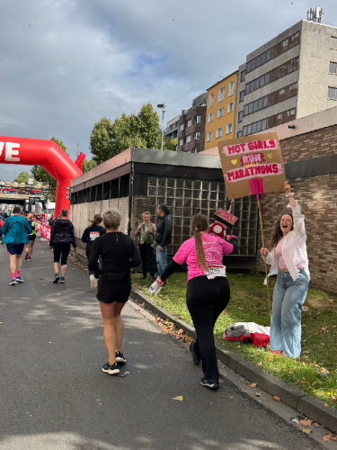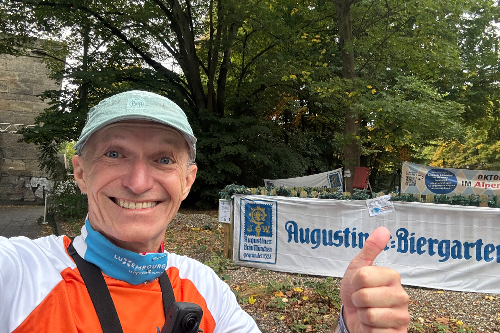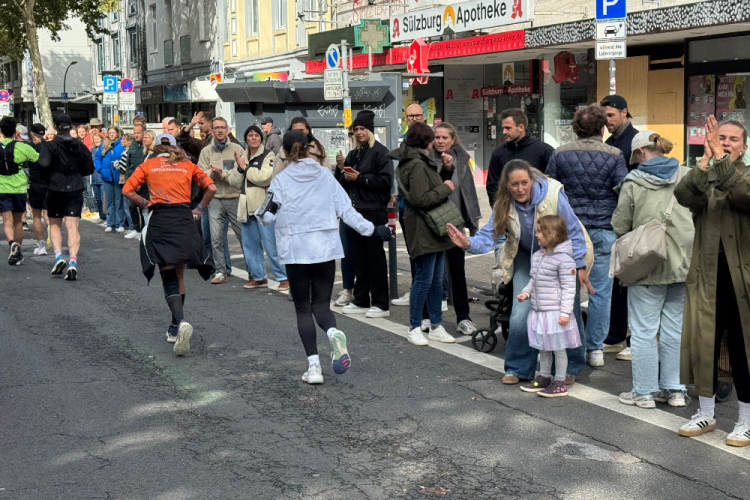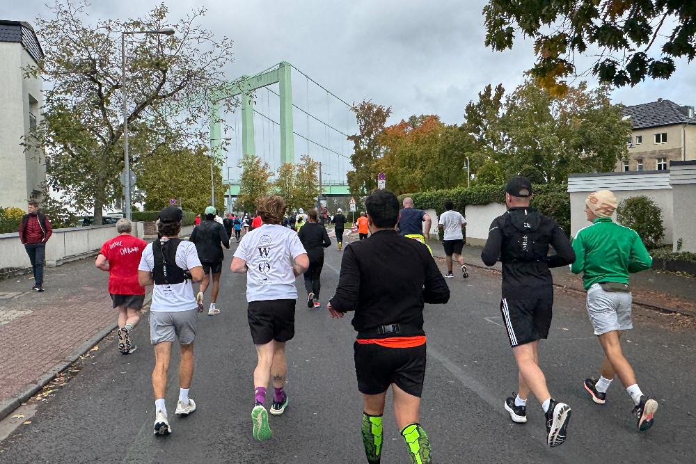 Eine Runde durch Rodenkirchen steht an und man spürt so richtig die Begeisterung, uns über die gesamte Strecke begleiten wird. Menschenmassen am Streckenrand. Auf einem Shirt vor mir lese ich etwas von Guangzhou Marathon. Klaus aus Köln hat in der - früher Kanton genannten - chinesischen Stadt 17 Jahre gewohnt und ist mehrmals mitgelaufen. Vor uns wieder das grüne Brückenwunder, danach sehe ich einen Augustiner-Biergarten. Fast wie zu Hause, wo heute das Oktoberfest zu Ende geht. Ein kleiner Abstecher durch Bayenthal. Dies ist einer der Marathons, bei dem auch das Anfeuern aus den Häusern samt lauter Musik eine wichtige Rolle spielt. Hier wird ein Schild rausgehalten „Laufen in der schönsten Stadt der Welt. Wat gibt’s schöneres“.