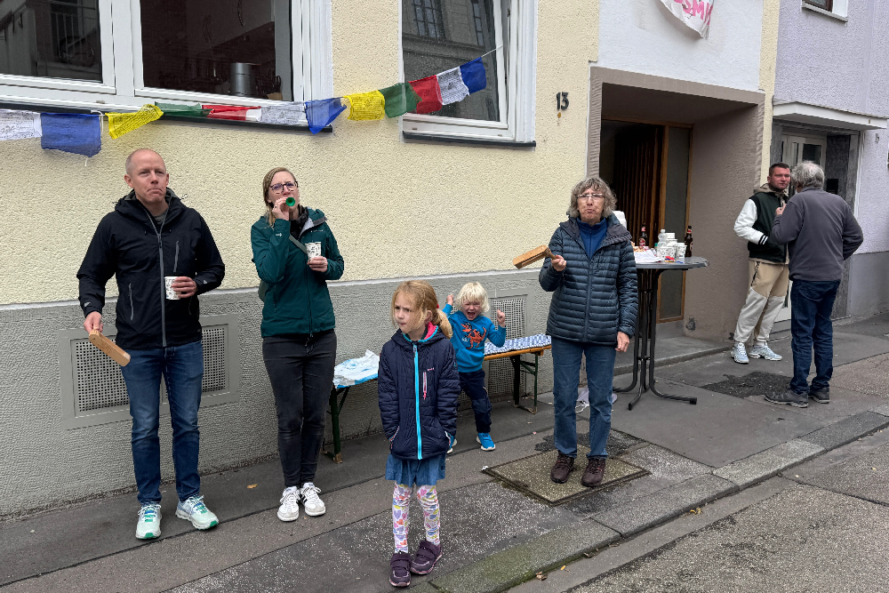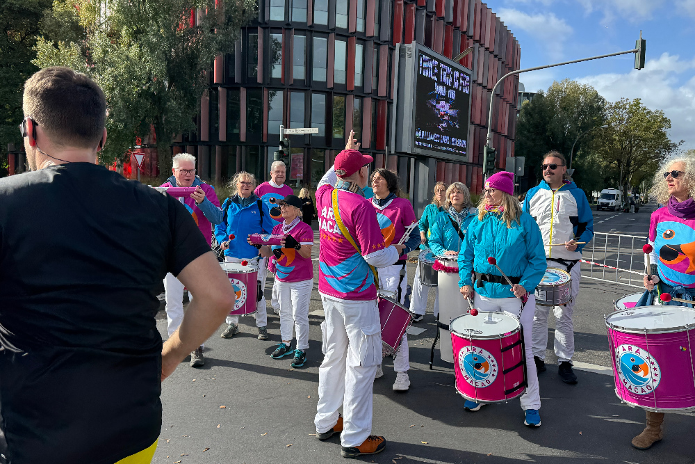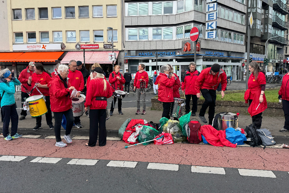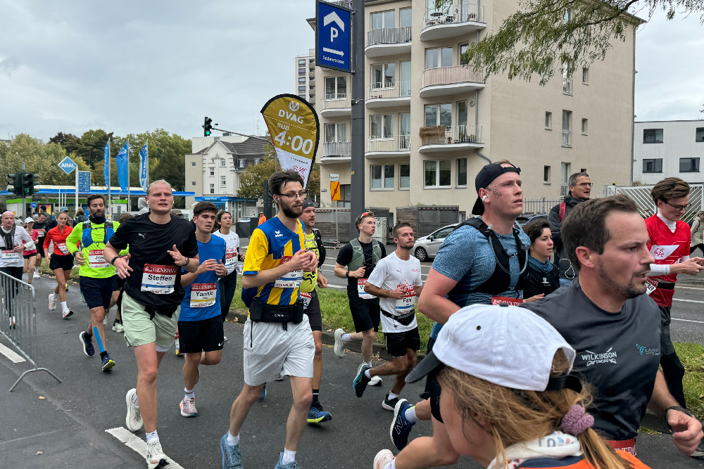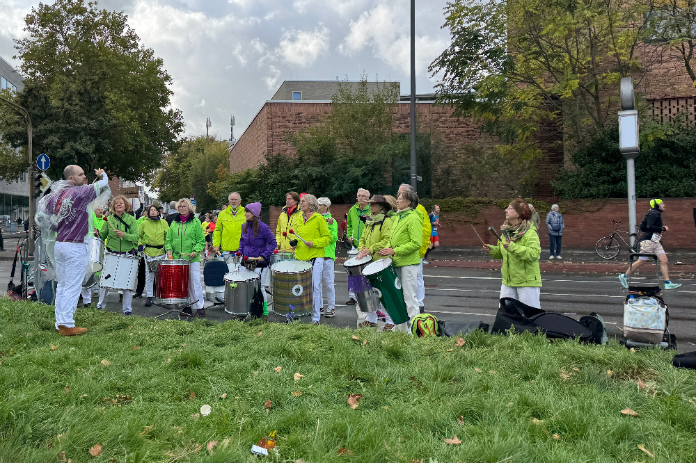 Inzwischen ist der Marathon 3:45 Stunden alt und es erscheint mir so, dass viele Musikanten und Trommler erschöpft sind. Oder habe ich nur gerade wieder die Pausenzeiten erwischt?  Wir sind in der Neustadt Nord und es beginnt eine lange Begegnungsstrecke. Die Vier-Stunden-Pacer kommen uns entgegen. Die liegen etwa sechs Kilometer vor uns. Und es sind wirklich viele. Die auf eine Fahrspur reduzierte Laufbahn ist sichtlich zu eng. Da wird gerne mal in die Gegenrichtung ausgeschwenkt.
