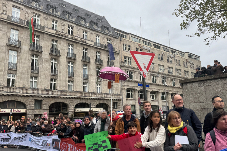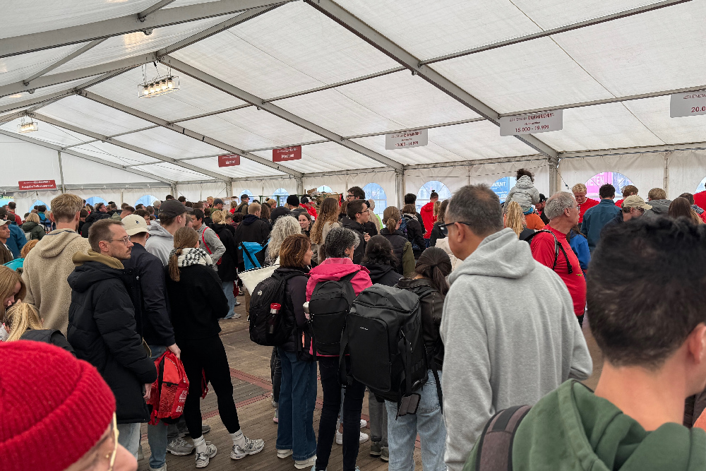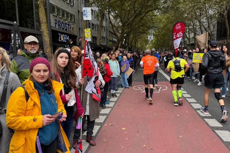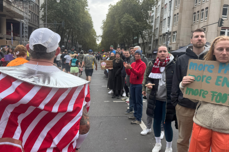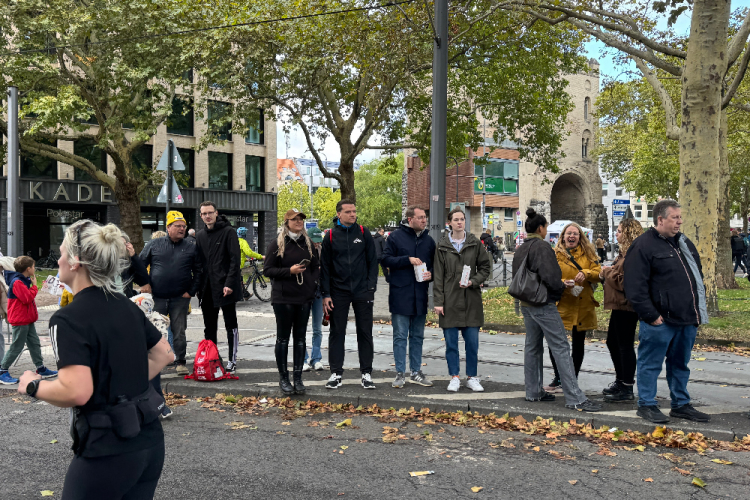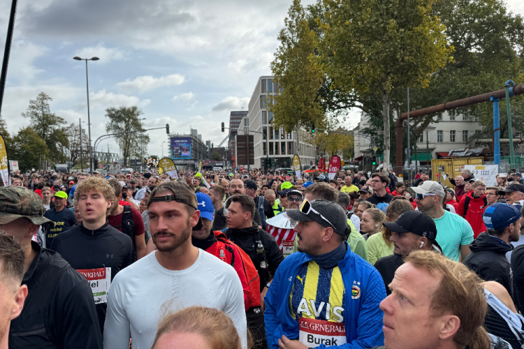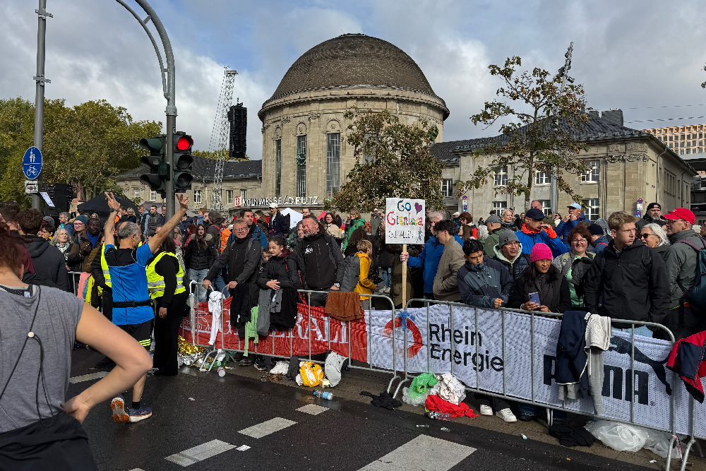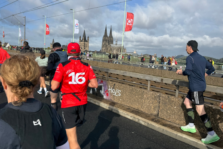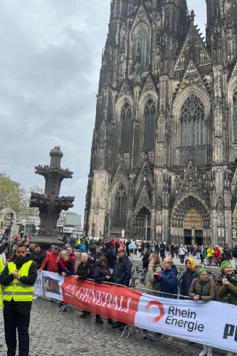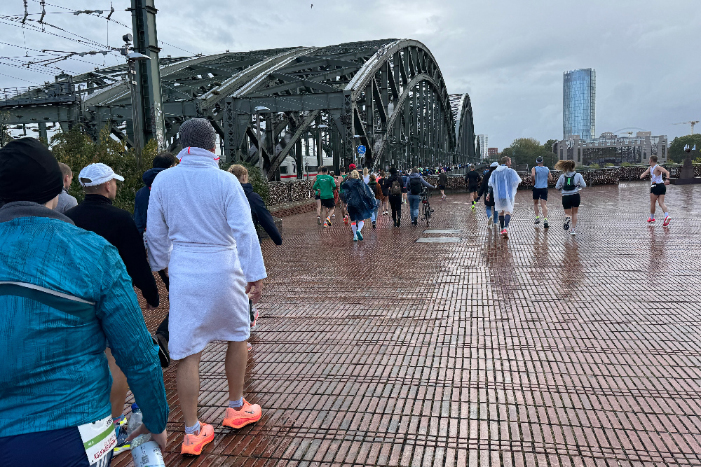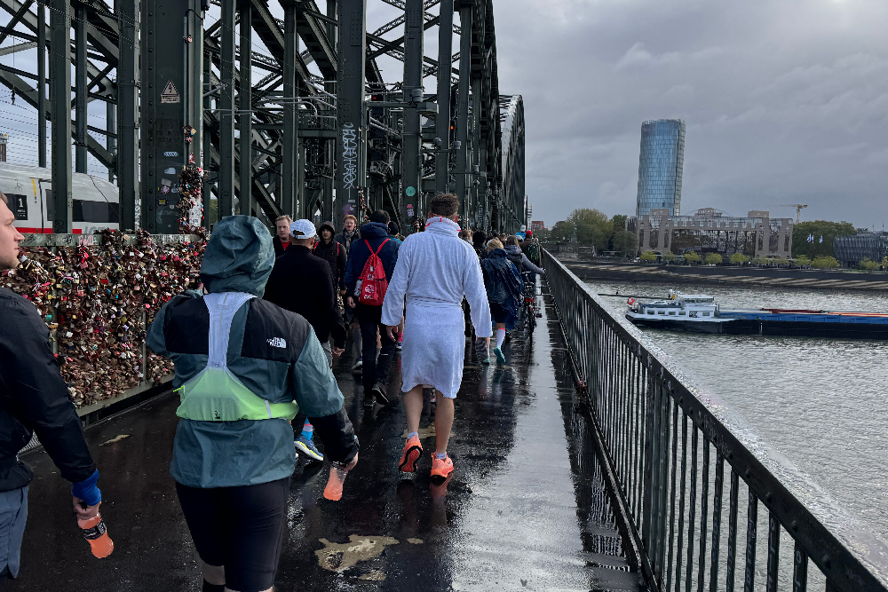Die Fußgängerweiche über die Rennstrecke ist sehr gut organisiert und die Helfer sind engagiert, aber es sind halt zu viele Menschen unterwegs. Da heißt es Ruhe bewahren. Nach vielen Minuten haben wir den Dom passiert und gelangen auf dem Weg über die Hohenzollernbrücke zum Start.
