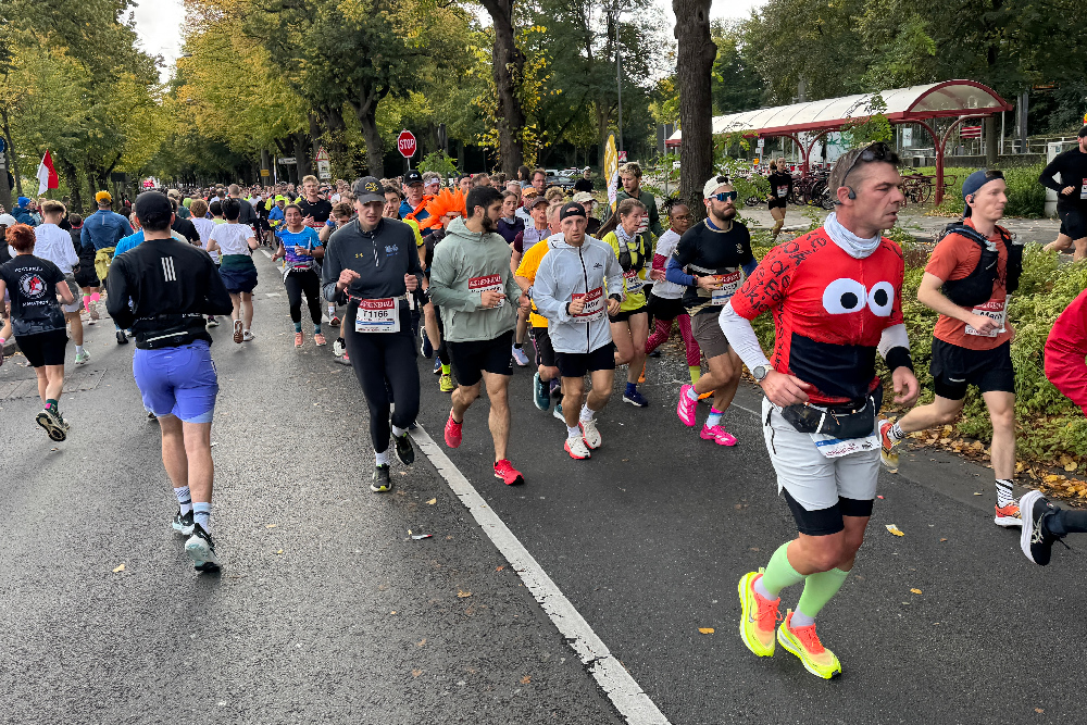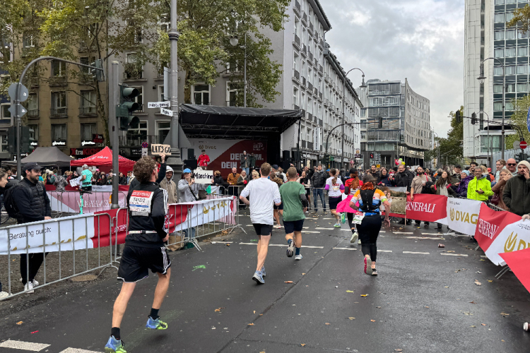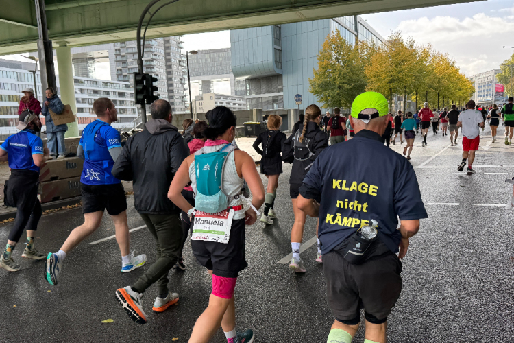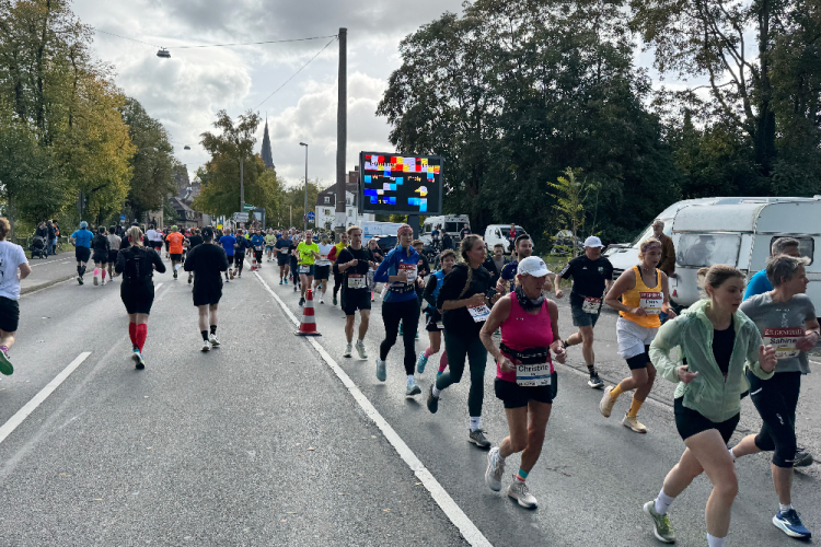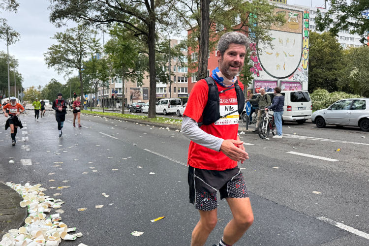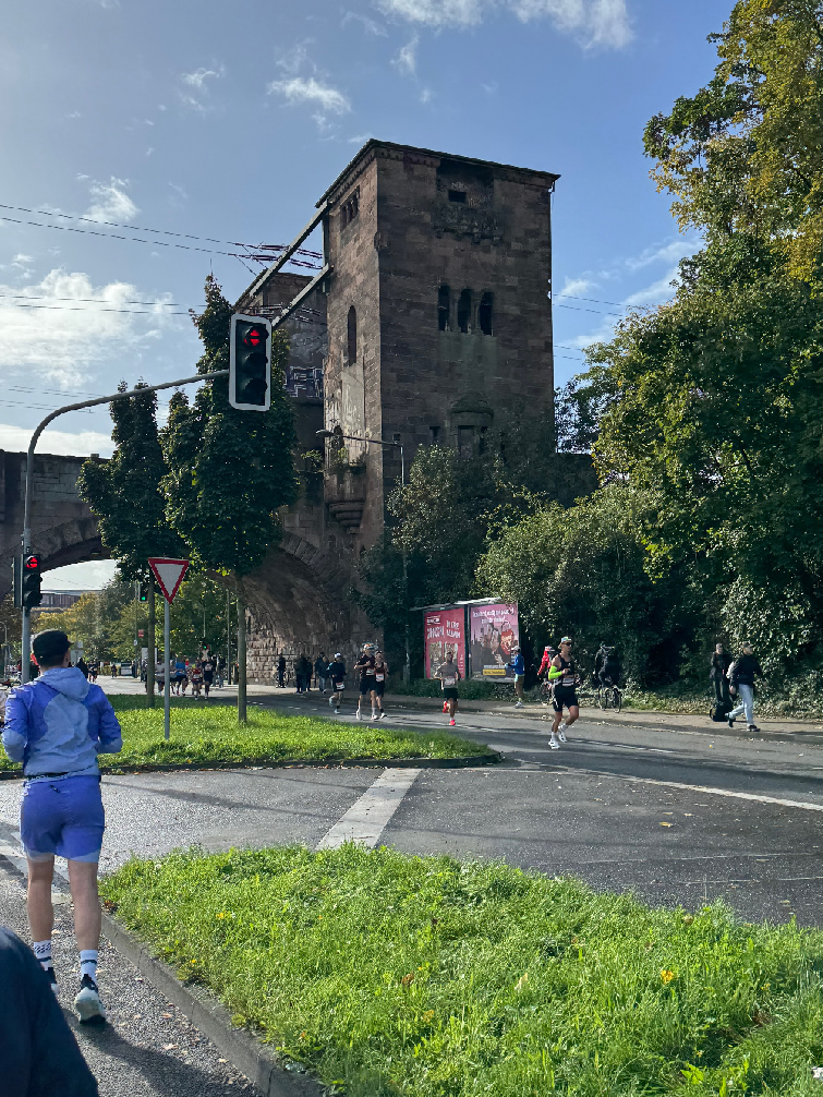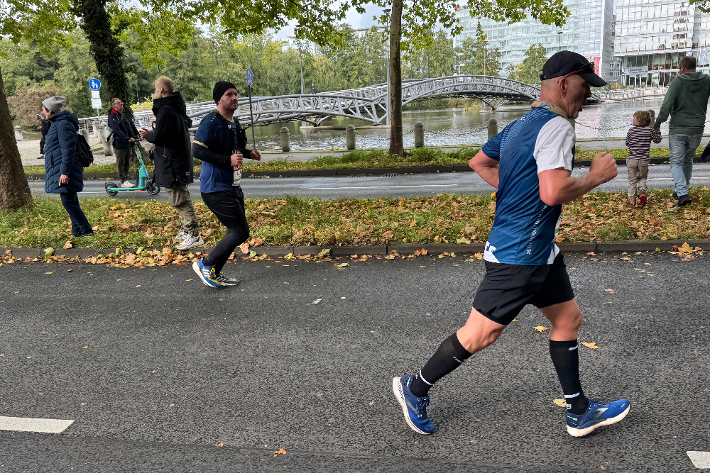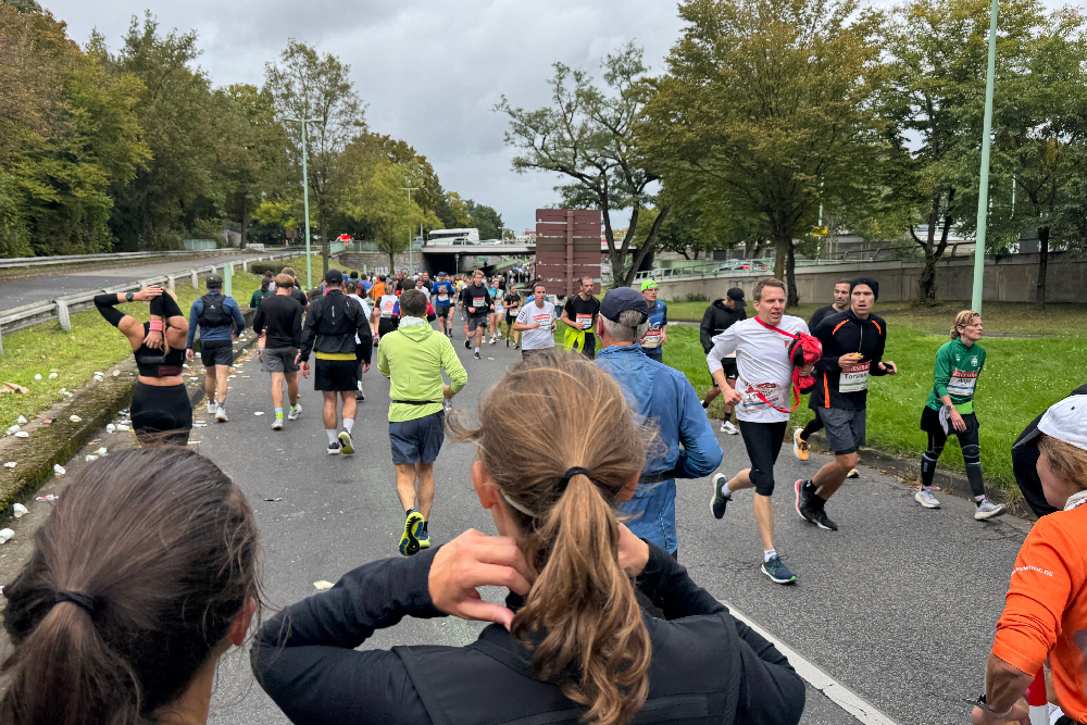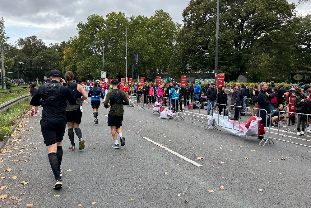 Die Verpflegungsstellen sind groß und die Tische gut beschriftet. Es gibt Wasser, Iso, Bananen, später Cola und Gel. Alles freundlich angereicht. Und Zeitnahmen alle fünf Kilometer, plus einige zusätzliche. Die inzwischen gebräuchlichen flachen roten Plastikplatten gefallen mir ganz gut, während früher die Zeitnahme-Matten oft Stolperstellen waren. Die Startnummer hat zwei Chipstreifen, was die Sache wahrscheinlich ausfallsicherer macht. Da der Name, wie bei den ganz schnellen Laufenden, in riesigen Lettern aufgedruckt ist, wird man immer wieder persönlich angefeuert, sogar aus dem zweiten Stock der Wohnhäuser. Nur die Nationalitätenfähnchen auf der Startnummer vermisse ich.