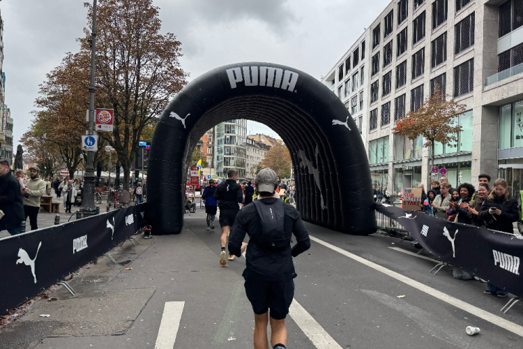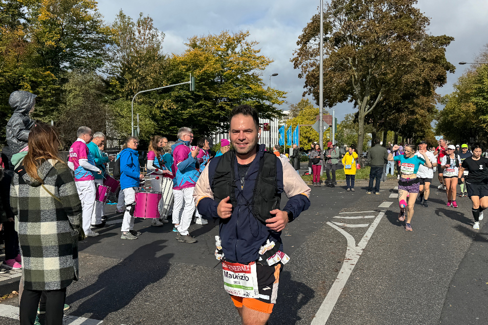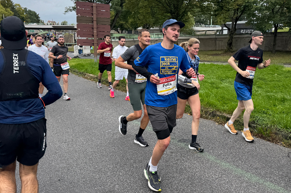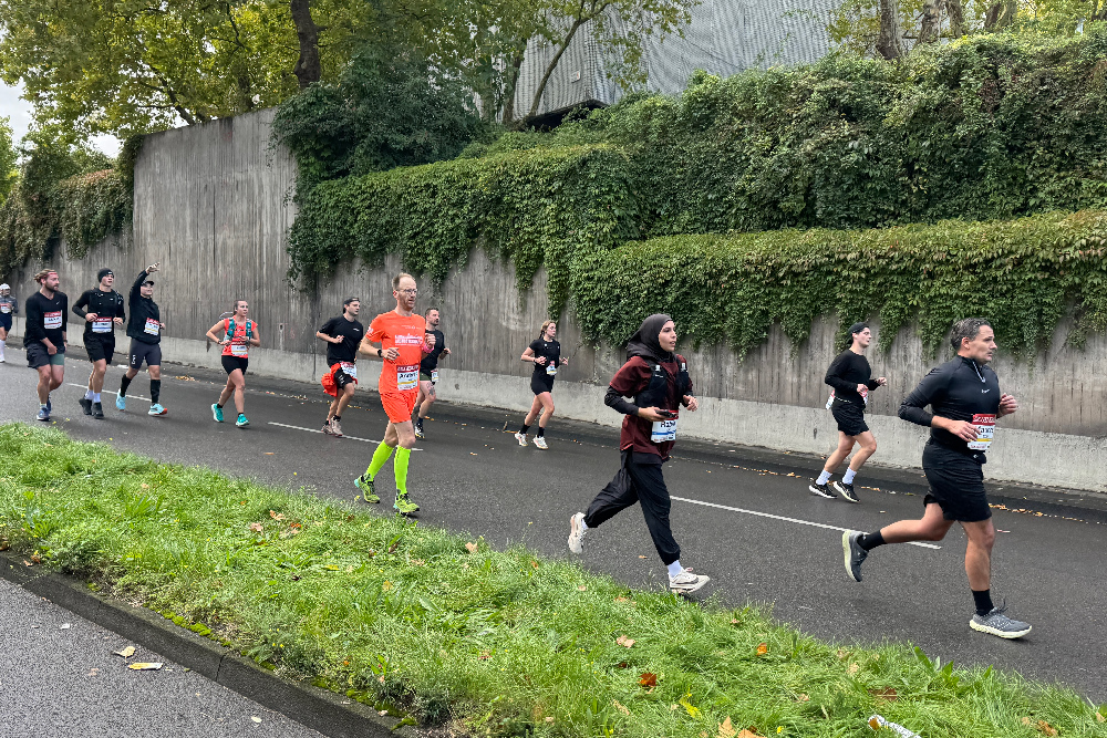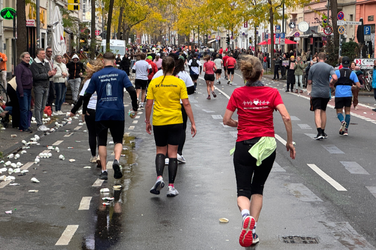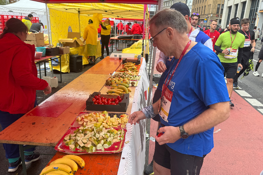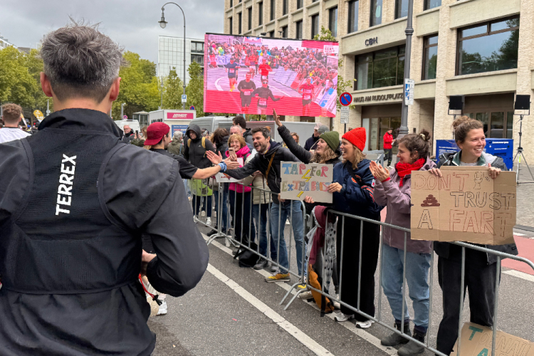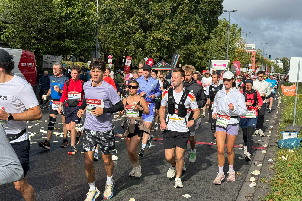 Die Verpflegungsstellen sind groß und die Tische gut beschriftet. Es gibt Wasser, Iso, Bananen, später Cola und Gel. Alles freundlich angereicht. Und Zeitnahmen alle fünf Kilometer, plus einige zusätzliche. Die inzwischen gebräuchlichen flachen roten Plastikplatten gefallen mir ganz gut, während früher die Zeitnahme-Matten oft Stolperstellen waren. Die Startnummer hat zwei Chipstreifen, was die Sache wahrscheinlich ausfallsicherer macht. Da der Name, wie bei den ganz schnellen Laufenden, in riesigen Lettern aufgedruckt ist, wird man immer wieder persönlich angefeuert, sogar aus dem zweiten Stock der Wohnhäuser. Nur die Nationalitätenfähnchen auf der Startnummer vermisse ich.