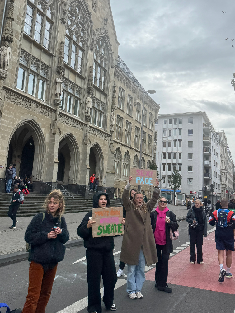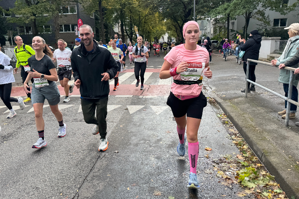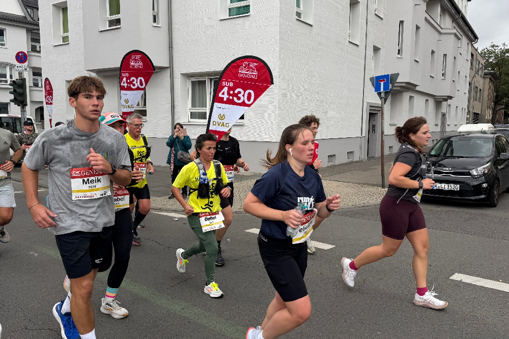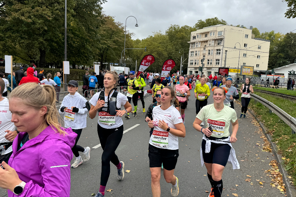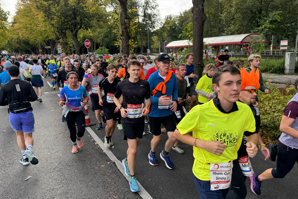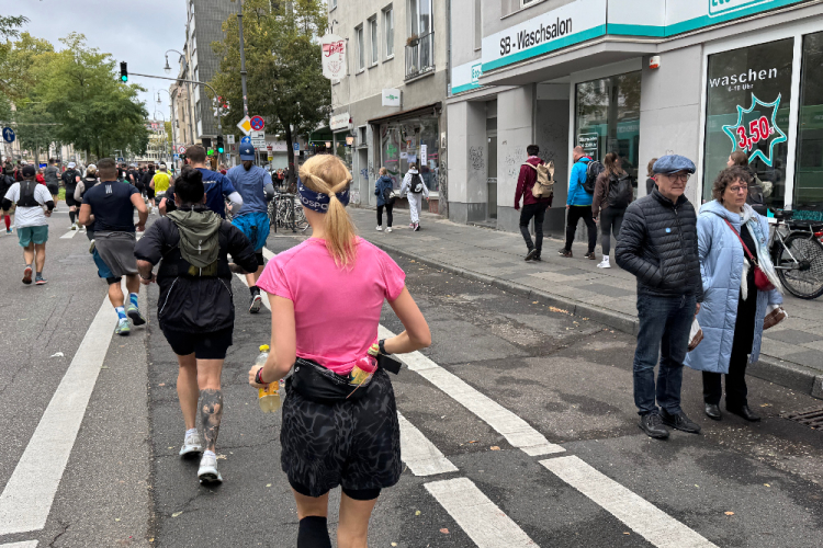 Nippes und die Florastraße erwarten uns nach einem etwas ruhigeren Kilometer mit der nächsten Partystimmung. Immer wieder bin ich von der Vielfalt der Architektur beeindruckt: Wunderschöne Gründerzeithäuser, 50er und 60er-Jahre-Anlagen. Und alles, was dann danach so kam. Ich schließe auf den ersten 4:45-Pacer auf. Ein Prunkbau an der Strecke entpuppt sich als Hansa- Gymnasium. Einige jugendliche Schulstaffelläufer haben eine Gehen-Sprinten-Taktik gewählt. Manche sehen so aus, als warteten sie sehnlich auf Ablösung.