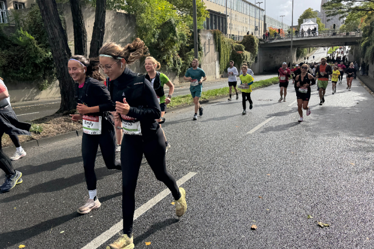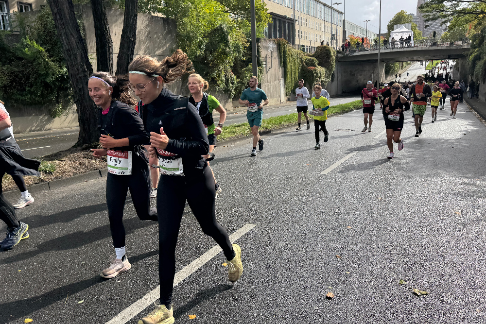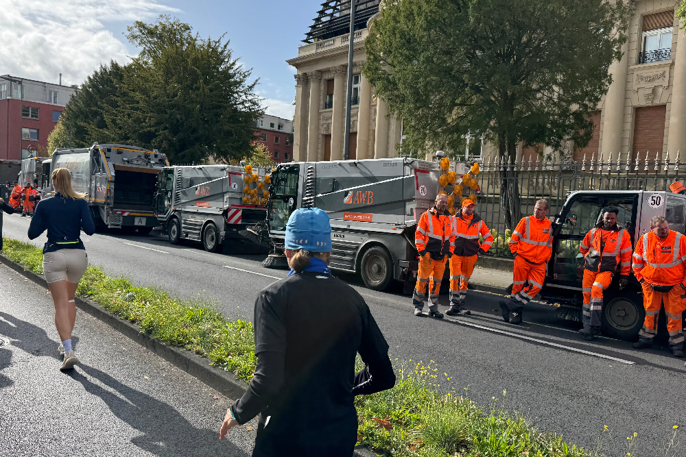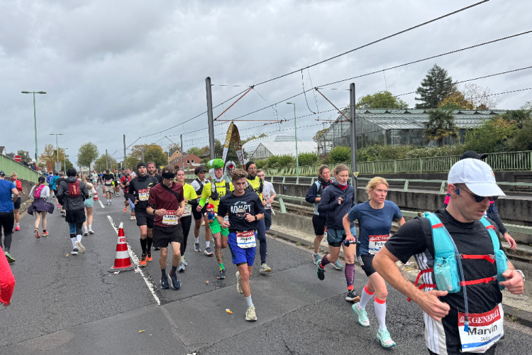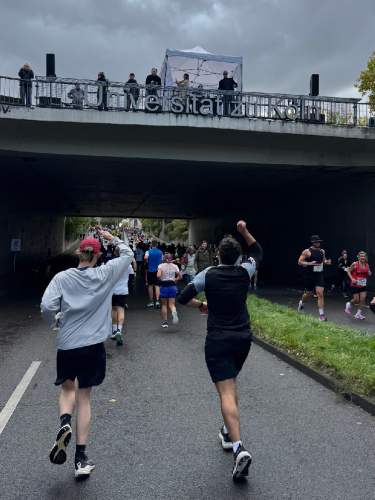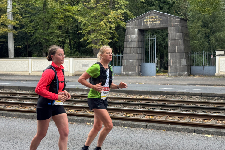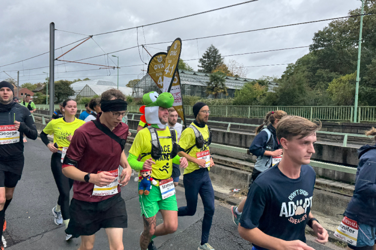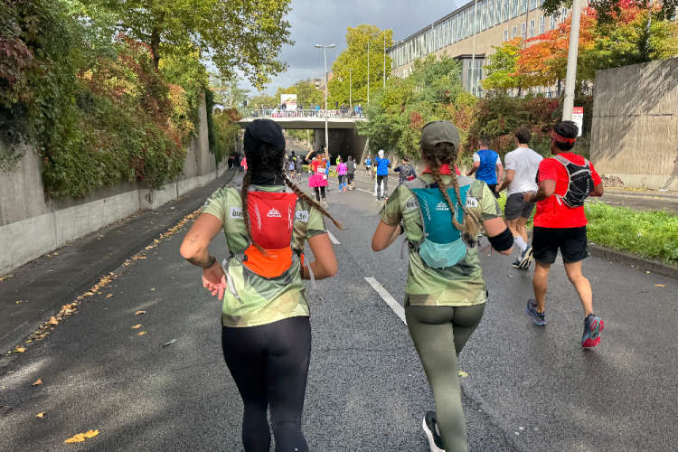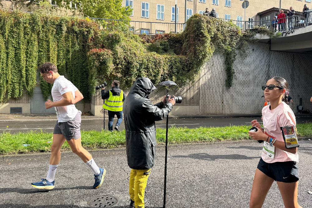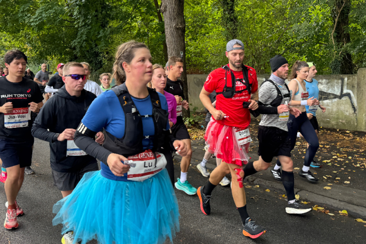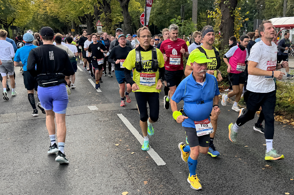 Zwei Staffelwettbewerbe gibt es: Die Teilnehmenden der Schulstaffel sind leicht zu erkennen an den gelben Hemden und der Körpergröße. Für sie gibt es sechs Staffelwechsel, meist am Laufwegrand. Und dann die Viererstaffeln, mit etwa 800 Teams eine gewaltige Menge. Deren Wechsel ist auch super gelöst, entweder in Nebenstraßen oder auf breiten Straßen ohne Behinderung. Dort stehen dann auch Toilettenhäuschen, ebenso an den VPs, Die Laufenden der Staffeln tragen am Rücken Namen, die oft lustig klingen wie „Lost in pace“ oder „Pace not found“.