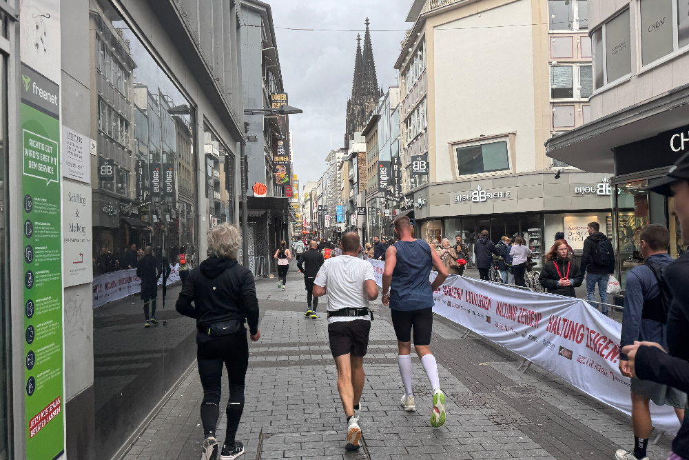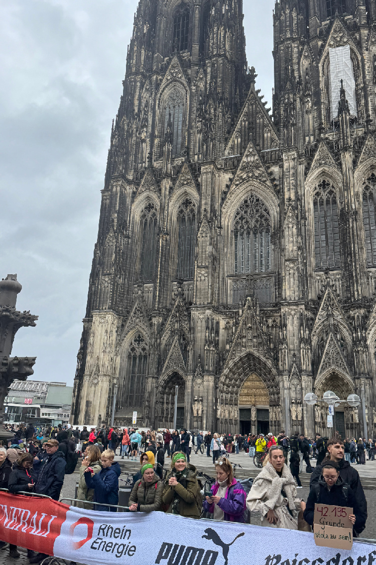 Endlich links in die Hohe Straße, eine Einkaufsstraße in der Altstadt. Immer noch 700 Meter, meint meine Uhr. Vor uns die Türme des Doms. Da müssen wir hin, denn „Der Dom ist das Ziel“, wie der Slogan des Marathons lautet. Kurz davor ein Schlenker. Hier eine Brücke über den Laufweg. Die haben wir heute früh auf dem Weg zum Start übersehen. Dann noch mal rechts das Hauptportal. Am Boden die 42-km-Markierung. Ich bin schneller als erhofft. Womöglich hätte ich sogar noch unter 4:40 h kommen können – wenn ich noch mal Gas gegeben hätte. Rechts die Kirche Sankt Andreas. Zeit für den roten Teppich. Eine Frau hält ein Schild hoch: „Nur noch 0 km. Du hast es geschafft“. Fast … kurz danach bin ich im Ziel.