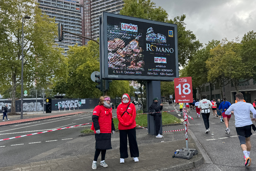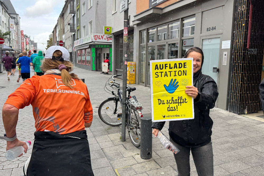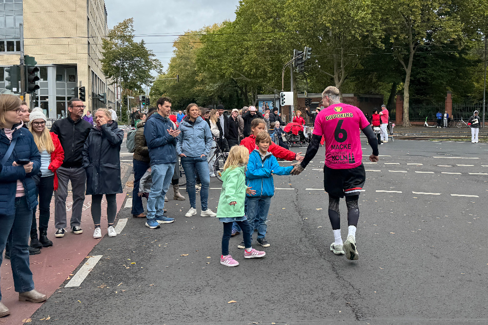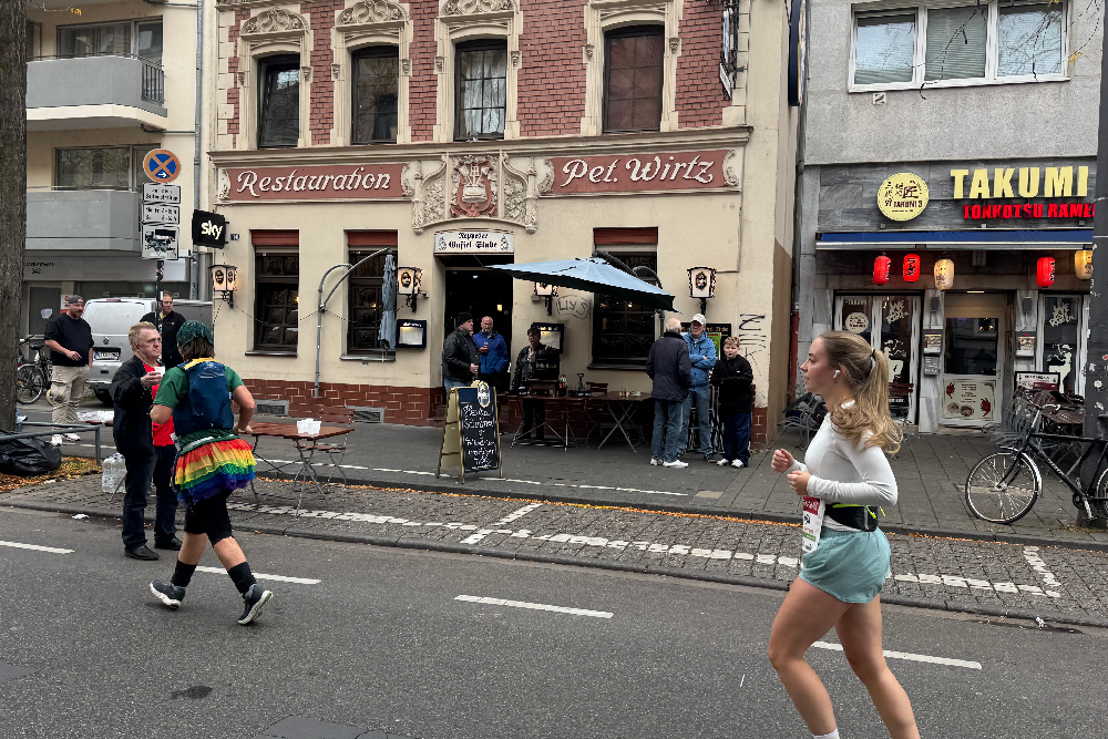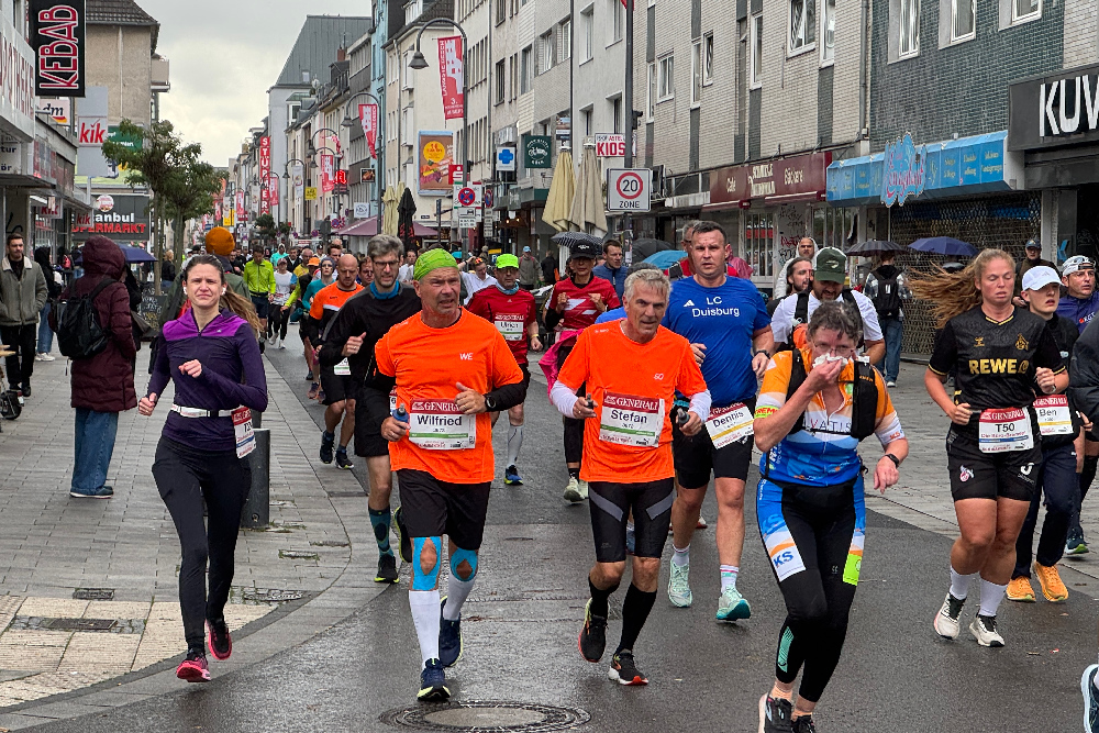 Ich verlasse das Klohäuschen am Staffelwechsel und begebe mich wieder auf die Piste. Der Hohenzollernring ist die zweite große Partyzone, an der wir später noch einmal vorbeikommen. Nun auf einer Schleife durch Ehrenfeld. Die Zuschauerinnen und Zuschauer halten durch. Vor uns ein Hochhaus mit einem 4711-Logo auf dem Dach. Wer mal auf einer Quittung zur Girokarten-Transaktion die „4711“ in der Autorisierungsnummer findet, der weiß, dass sie beim Bank-Verlag in Köln autorisiert wurde. So untrennbar sind diese vier Ziffern mit der Domstadt verbunden. Ursprünglich war 4711 die Nummer eines Hauses in der Glockengasse, wo der Unternehmer Mülhens sein bis heute berühmtes „Kölnisch Wasser“ vertrieb.