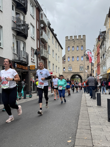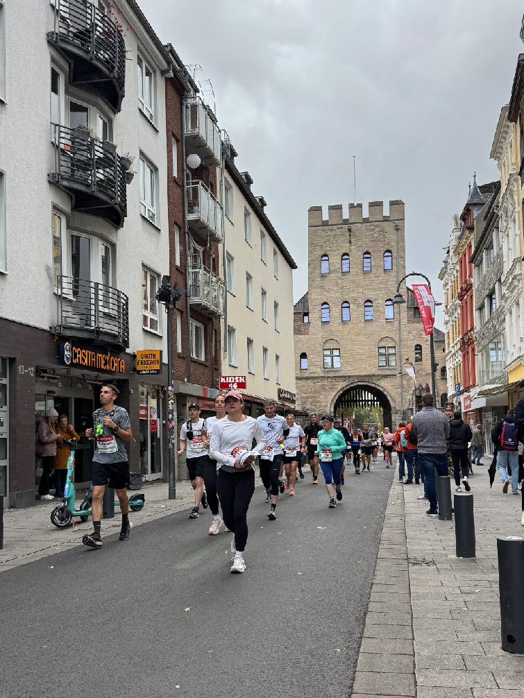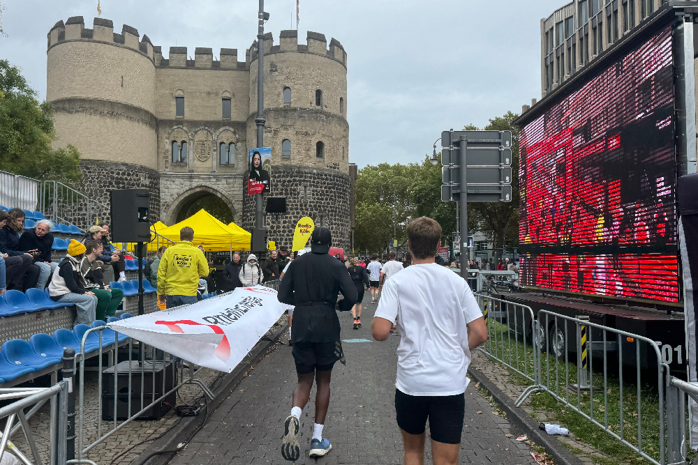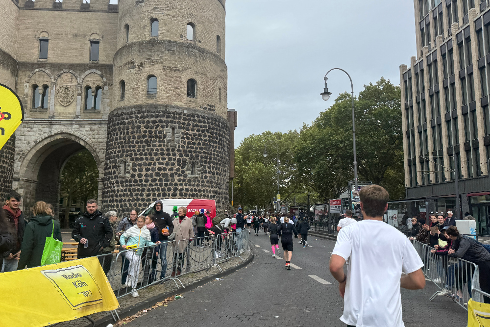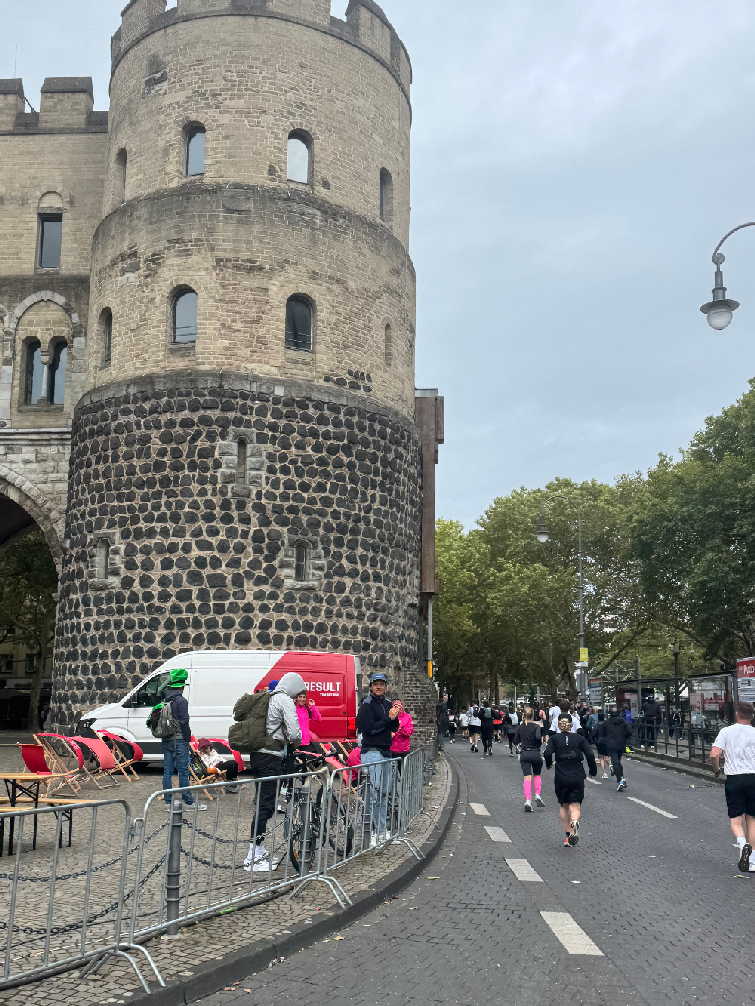 Hier am Hansaplatz beginnt nun die längste Partyzone Kölns. Ich schnappe mir den nächsten 4:45 Pacer. Am Hahnentor oder An d'r Hahnepooz, wie es auf Kölsch heißt, wird auf einer Anzeige schon der Zieleinlauf übertragen. Das Hahnentor aus dem Jahr 1180 ist Teil der Königskrönungsstraße. Aus Aachen pilgerten die frisch gekrönten Kaiser und Könige einst durch dieses Tor in die Stadt zum Dom, um den Heiligen Drei Königen zu huldigen, deren sterbliche Überreste sich im dortigen Goldschrein befinden sollen.