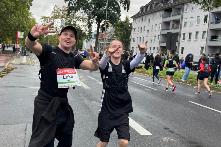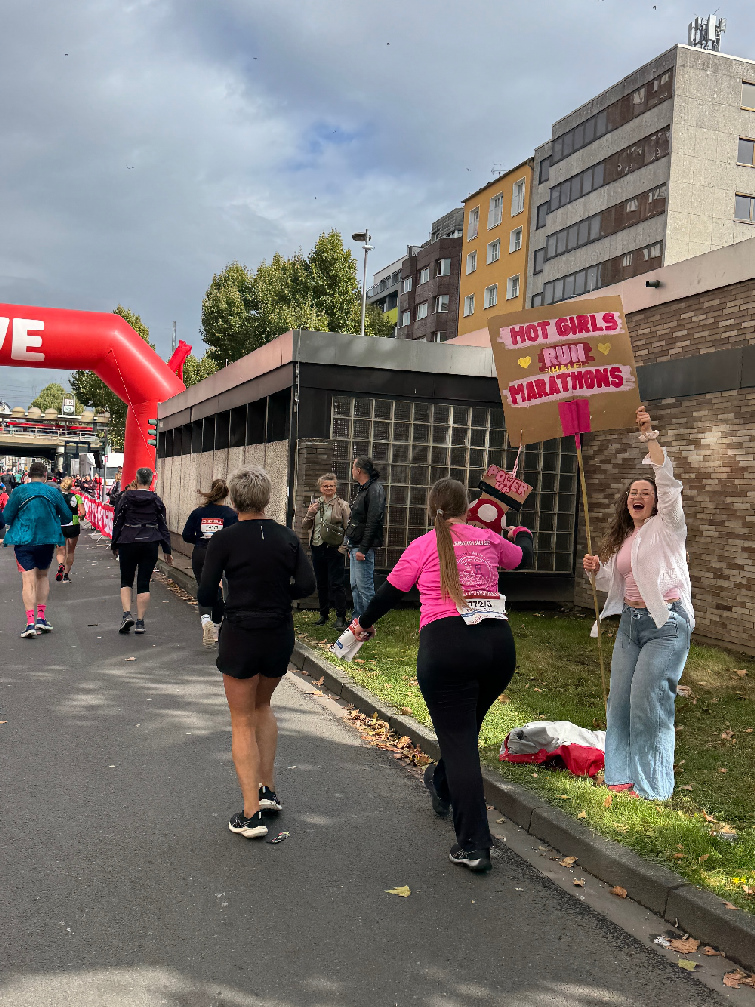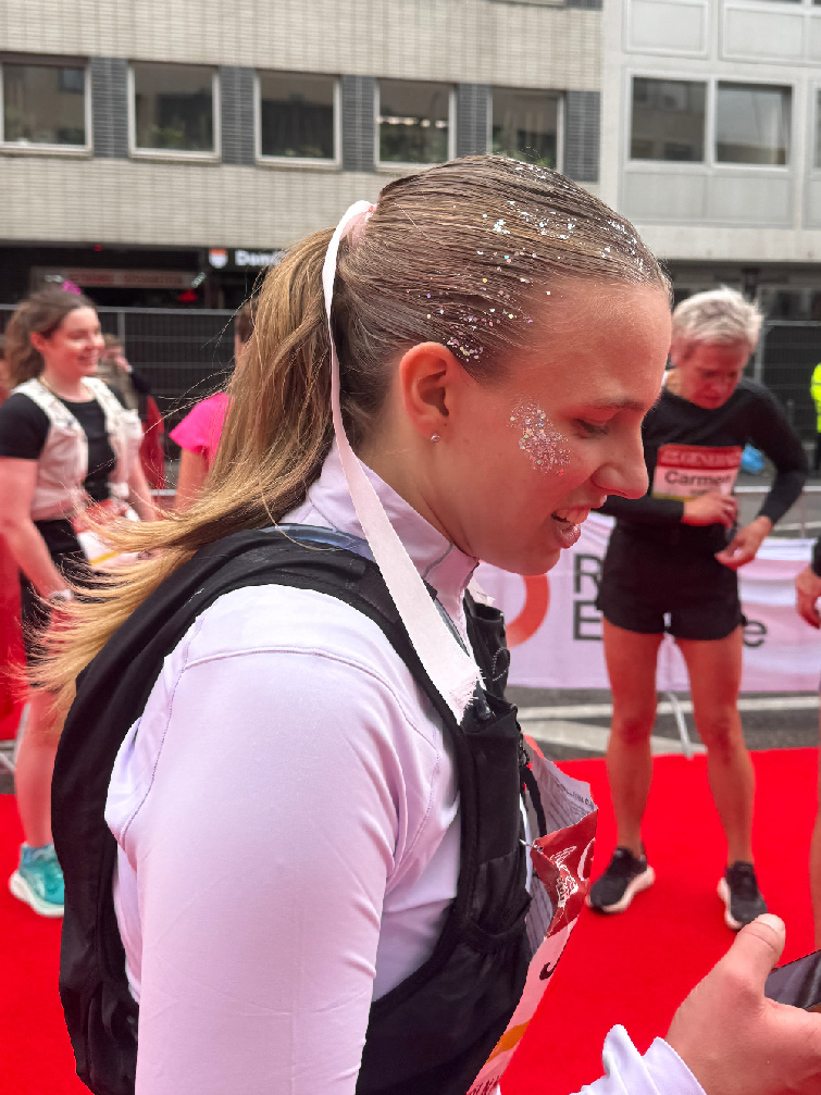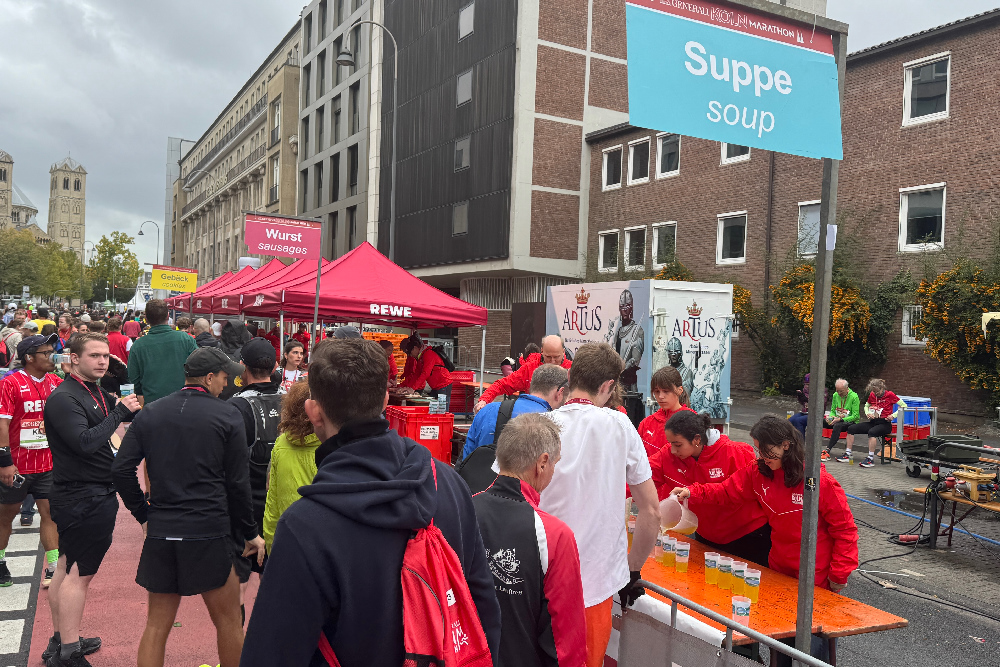 Judith kommt ins Ziel. Wieder mal Jahresbestzeit, aber diesmal leider knapp hinter der AK-Dritten. Die Medaillen sind aus Holz und recht groß. Weiter zum Rewe-Verpflegungsbereich in der nächsten Straße. Es gibt alles, was das Herz begehrt, Getränke, Obst, Gebäck. Wobei mir die warme Suppe besonders schmeckt. Wir treffen Timo, der mich schon als Fan des Marathons in seiner Heimatstadt Duisburg kennt. Ich verspreche, nächstes Jahr wieder dort zu starten. Dann wird es doch zu frisch. Ein kühles Bier reicht. Direkt nach der Verpflegung gibt es die Kleiderbeutel und die Duschtrucks von Grohe mit angenehm warmem Wasser.