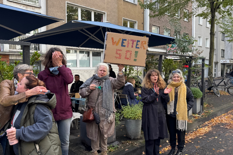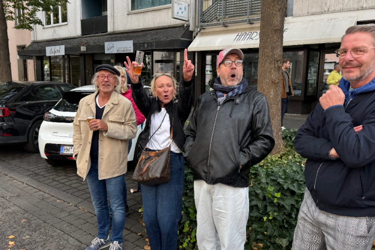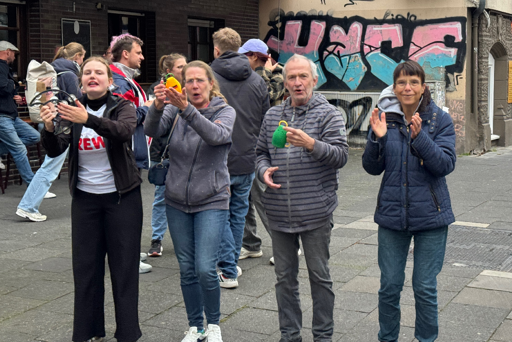 Wir gelangen nun schnell zum Heumarkt, wo die Party-Meile samt Gegenverkehr ihren Anfang hat.. „Lieber blöde Sprüche an der Bahn als in der Bahn“ steht auf einer Stadtbahn. Wenn ich das richtig sehe, hat die Kölschrock-Band „Cat Ballou“, bekannt aus den Karnevalssitzungen im Kölner Gürzenich, die Patenschaft für die Tram übernommen. Aus vielen privaten Lautsprechern wird man heute „kölsche Tön`“ hören. Und damit man auch meine Herkunft erkennt, habe ich die Fahne Bayerns dabei und versuche es mit Jux und Tollerei: Den Zuschauern mit ihren winzigen Biergläschen rufe ich zu, dass bei mir zu Hause Literkrüge die Norm sind. Die Antwort ist trocken: „Dafür schmeckt unser Bier“.