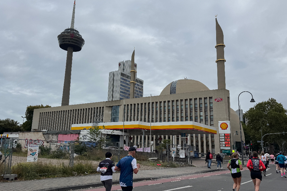 Konfetti und Rauschschwaden am nächsten Hotspot. Kommen die „Runners“, die uns hier anfeuern, aus Hamburg? Ich kann das Schild nicht lesen. Danach die sunnitische DİTİB-Zentralmoschee mit zwei 55 Meter hohen Minaretten, deren Bau für öffentliche Diskussionen sorgte. Ein Bekannter hat mal eine Führung mitgemacht und schwärmte von den Lichtspiegelungen im Inneren. Am Fernsehturm vorbei und weiter zum Mediapark. Früher befand sich hier der „Central-Güter-Bahnhof Köln-Gereon“. Der Köln-Turm ist 145 Meter hoch. Die Oberfläche ist weitgehend autofrei, da es unterirdische Straßen gibt.