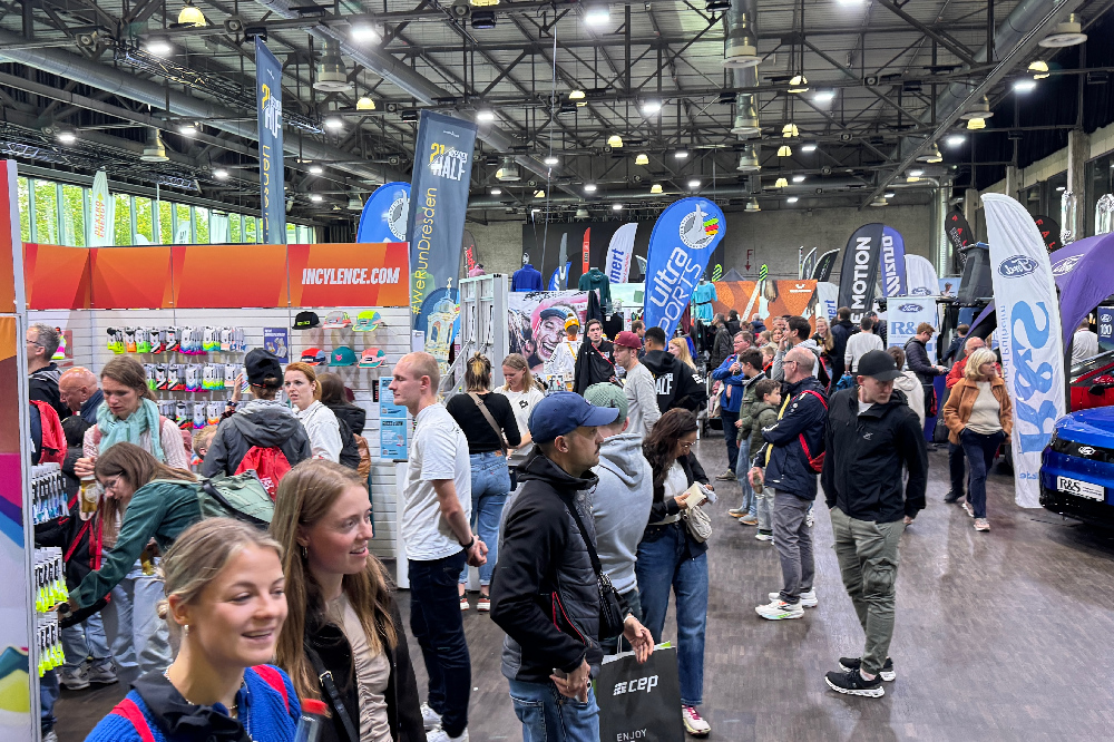 In der Veranstaltungshalle auf dem ehemaligen Flughafen Butzweilerhof ist natürlich viel los. Wir lassen uns durch eine recht große Marathonmesse schieben, um dann festzustellen, dass unsere sechsstelligen Startnummern bei den Halbmarathonis untergebracht sind. Zusätzlich zur Nummer gibt es einen schönen Köln-Marathon-Laufrucksack mit einem Gutschein für ein Spiel der Kölner Haie, einem Antrag für eine Organspendeausweis und einem Tütchen mit Pflanzensamen vom Sponsor Toom. Und als wichtigstes: ein Reissdorf-Kölsch-Sammelglas zur 27. Marathon-Edition mit der Aufschrift: „Er Läuft. Sie läuft. Es läuft“. Auf dem Weg zurück warten wir im Pulk bei regnerischem Wetter erst mal 20 Minuten auf eine Bahn. Da ist wohl heute der Wurm drin.