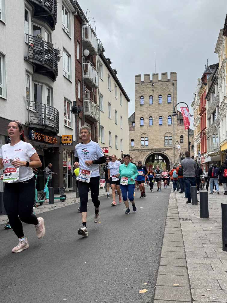 Jetzt muss ich aber endlich mal weiterkommen. Michel, der französische Marathoni, feuert uns an. Links vor uns ein Stadttor. Wir schwenken auf die Severinstraße, eine römische Heeres- und Ausfallstraße nach Bonn. Hinter uns die Severinstorburg. Diese Straße spielt auch eine wichtige Rolle beim jährlichen Karnevalsumzug, da von hier die Fernsehübertragung kommt, die ich mir im fernen München nie entgehen lasse. Seit 2015 kommentiert der Kölner Comedian Guido Cantz den Karnevalsumzug. Als Läufer hat er 2004 den Köln-Marathon bestritten und sich danach auf die Halbmarathonstrecke in der Domstadt festgelegt.