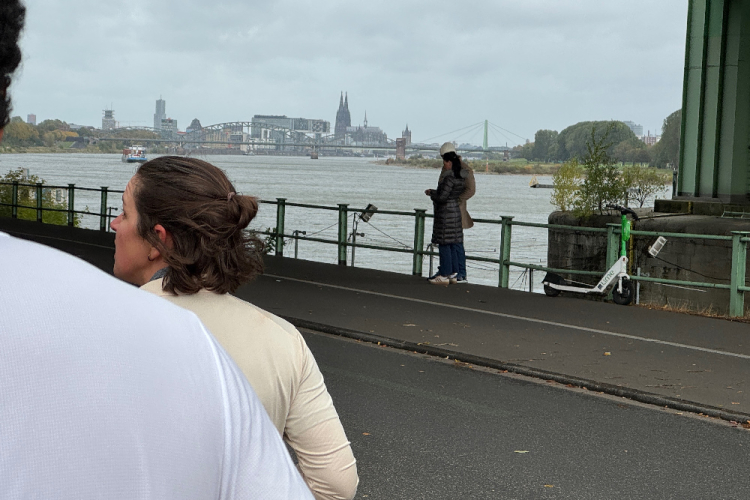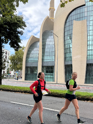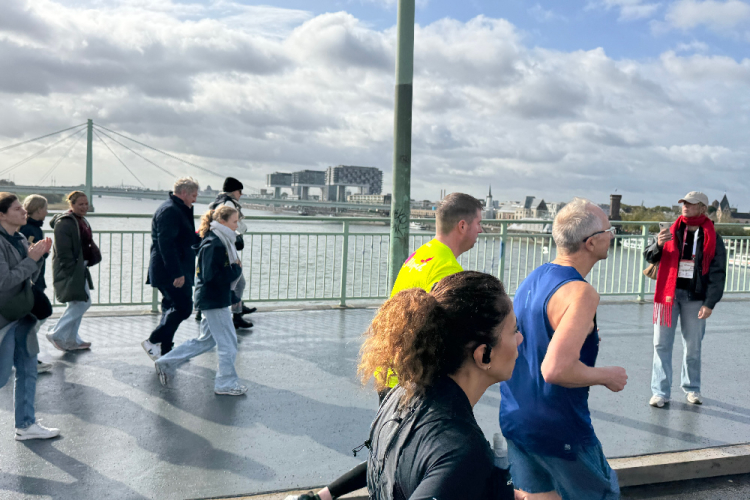 Die nächsten drei Kilometer bleiben wir am Rhein. Links kündigt sich die Rheinauhafen-Halbinsel an. Dort wurde vor einigen Jahren ein großes Wohn- und Bürogebiet angelegt. Hier am Anfang eine historische, stählerne Drehbrücke, dahinter dann das Schokoladenmuseum, gefolgt vom Olympiamuseum. Direkt am Rhein ist das auch eine ideale Trainingsstrecke - oder man läuft einen Marathon am Fluss entlang, wie ihn der ortsansässige „Sammler“ Manfred Steckel mehrmals im Jahr anbietet. Er ist heute auch dabei, wie schon oft, und steht kurz vor seinem 1.000 Marathon. Judith und ich haben am 15. August an einer seiner Veranstaltungen hier teilgenommen. Bei über dreißig Grad eine schweißtreibende Angelegenheit.