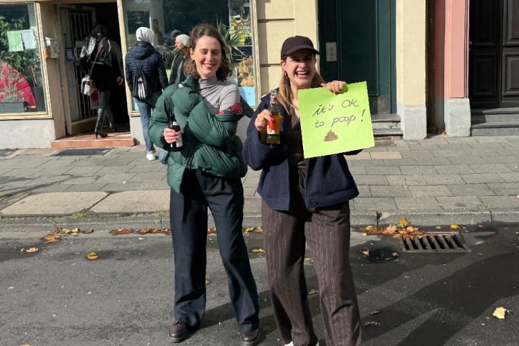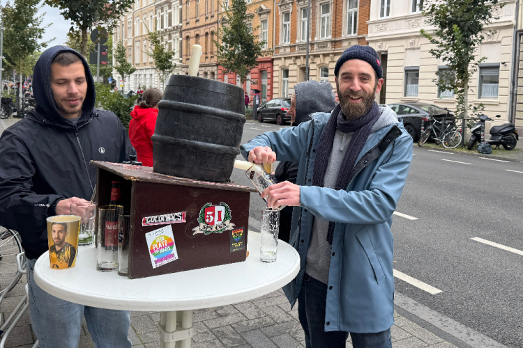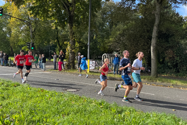 Die Sonne lacht in Sülz und mit ihr viele Marathonis. Nächste Party in Lindenthal. Hier mal Hits, die ich eher auf dem Oktoberfest verorten würde. „Hey Baby“. Ein bisschen ruhiger am Friedhof Melaten vorbei. Dann schöne Fontänen am Aachener Weiher, 1920 vom damaligen Oberbürgermeister Konrad Adenauer in Auftrag gegeben. Dahinter der Hiroshima-Nagasaki-Park, eine Hügellandschaft aus dem Schutt der im Zweiten Weltkrieg zerstörten Häuser. Neben uns eine Staffelwechselstelle.