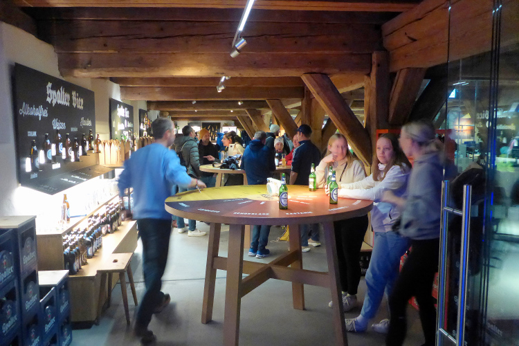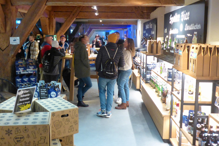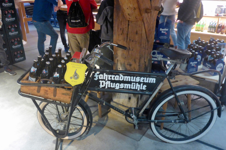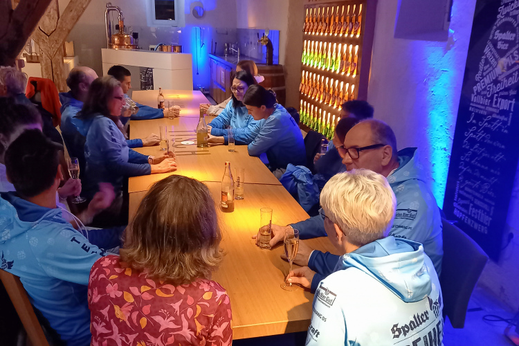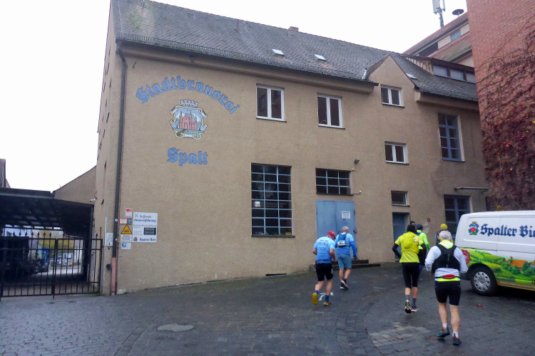 Zwischen den Kirchen St. Niklaus und St. Emmeram führen uns verwinkelte Gassen auf Kopfsteinpflaster bereits leicht aufwärts durch die Altstadt. Noch hat sich das Feld nicht entzerrt, so gibt es an einer Treppe einen kurzen Stau. Nach 300 Metern erreichen wir die Stadtbrauerei Spalt. Mit viel Leidenschaft werden hier 21 Bierspezialitäten vom Diplom-Braumeister komponiert. Malz verwendet man nur aus der Region, dazu besten Spalter Aromahopfen, hauseigenes Quellwasser und feinste Brauhefe. Dafür gibt es auch das Qualitätssiegel „Slow Brewing“. Es ist das härteste Siegel auf dem Markt, dabei wird nicht nur das Bier, sondern auch die Unternehmensführung, Marketing und Energiewirtschaft bewertet.