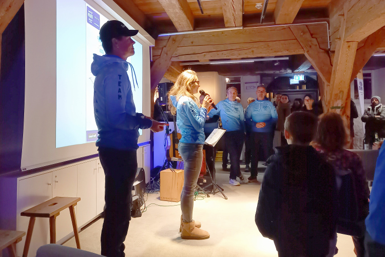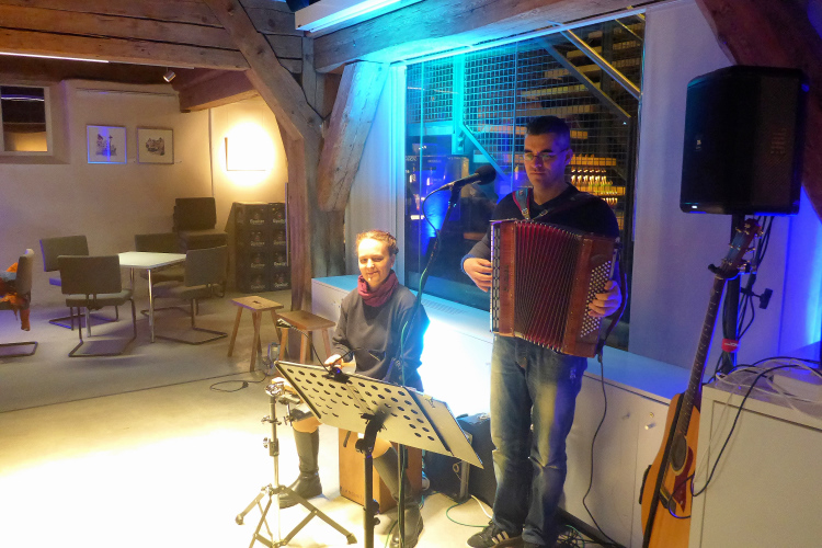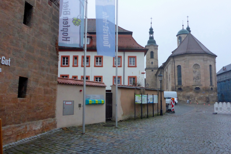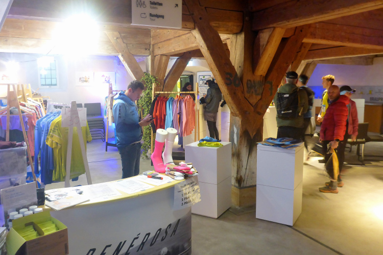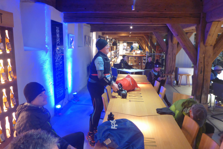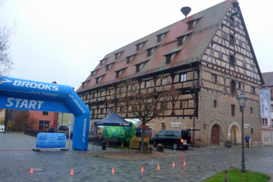 Im Untergeschoß findet um 18 Uhr das Race-Briefing statt. Mit Axel bin ich zu Fuß von unserer Unterkunft hierhergekommen. Natürlich nicht ohne Hintergedanken, wir wollen selbstverständlich auch das vielgepriesene Spalter Bier probieren. Auch für den Hunger ist gesorgt, im Außenbereich befindet sich der Food Court, wo man sich mit fränkischen Spezialitäten stärken kann. Im hinteren Bereich des Untergeschosses, wo das Briefing stattfindet, gibt es gemütliche Tische, dazu spielt ein Duo alte Rockklassiker auf der Quetsche und Percussion. Auch in Verbindung mit dem wirklich süffigen Bier lässt sich hier gut aushalten. Bis auf eine kurzfristige Streckenänderung gibt es dann beim Briefing nur wenige Neuigkeiten, was uns eh nicht schon per Mail mitgeteilt wurde. Aber natürlich können auch Fragen gestellt werden, zu speziellen Themen.