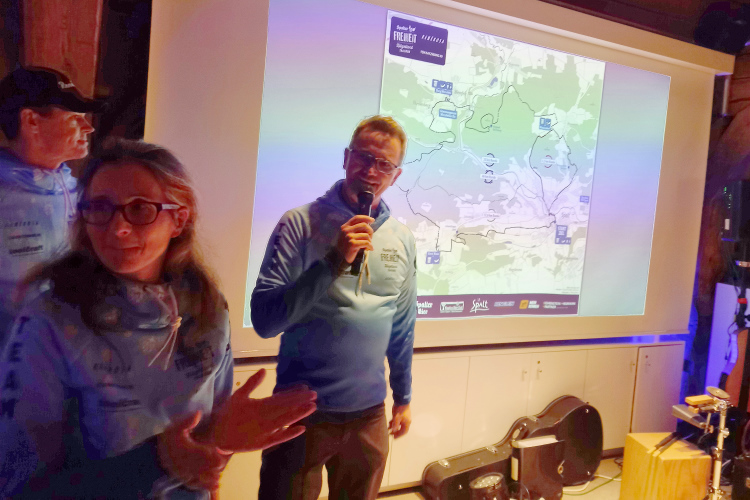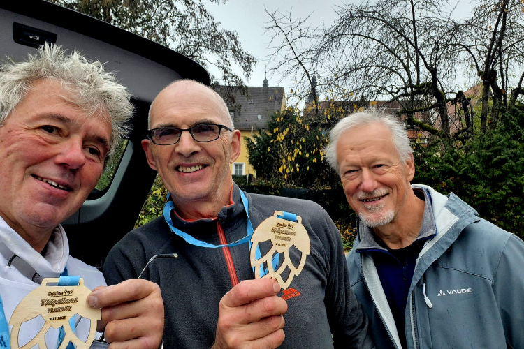 Um zwei Minuten verfehle ich die 7 Stunden, aber die Zeitmessung ist noch aktiv, somit bin ich noch in der Wertung. Florian empfängt mich gleich mit einer Flasche „Spalter Freiheit“, dazu bekomme ich die Hopfenmedaille überreicht. Nach mir kommt niemand mehr, sind alle schon vorher ausgestiegen.