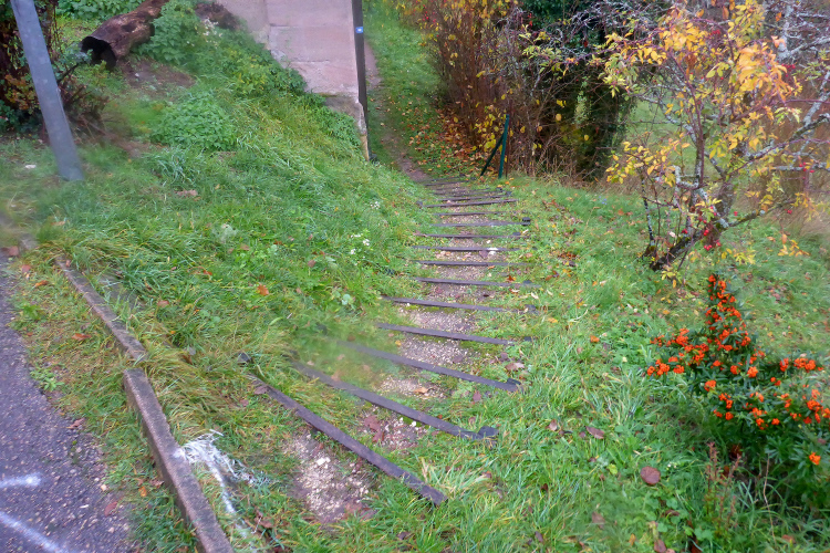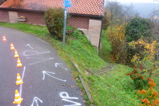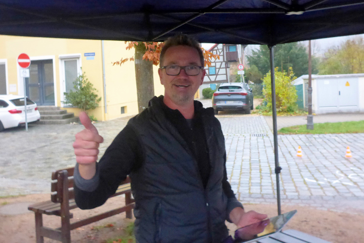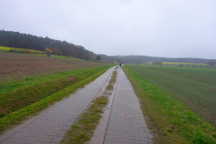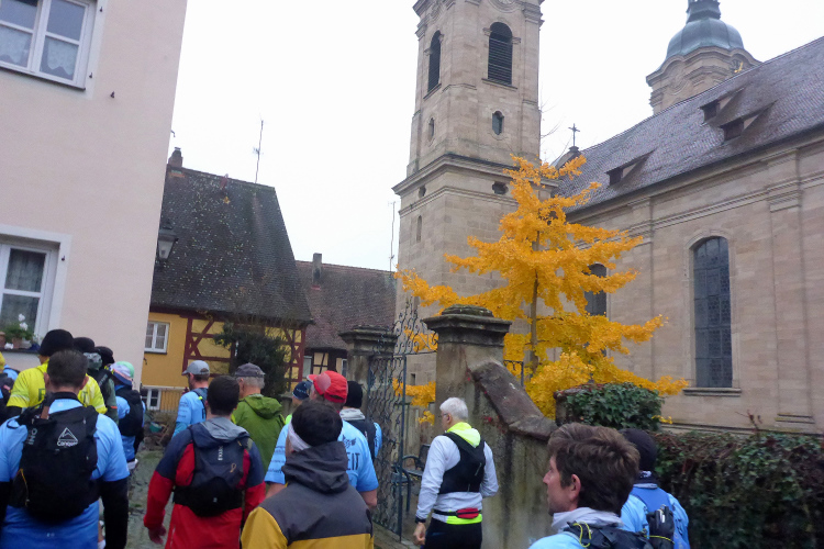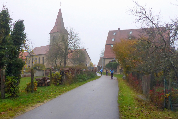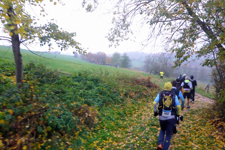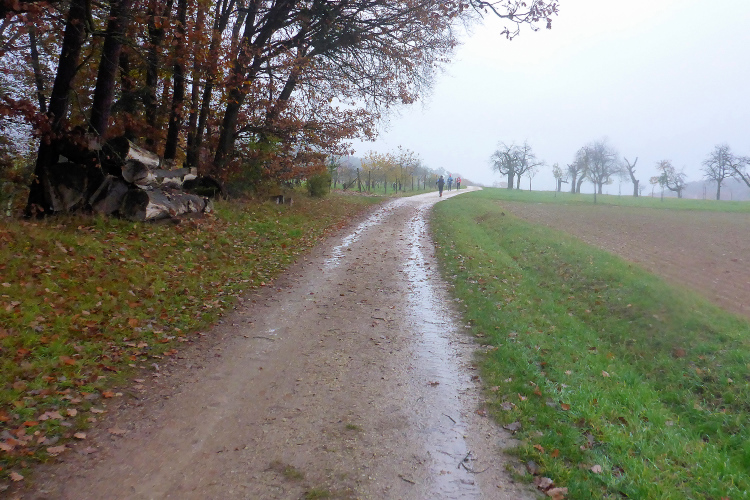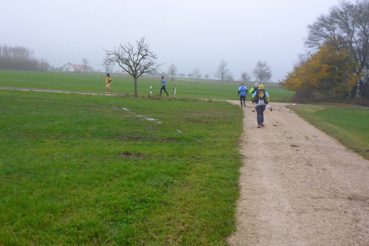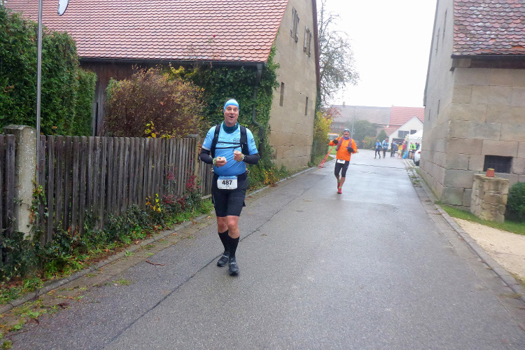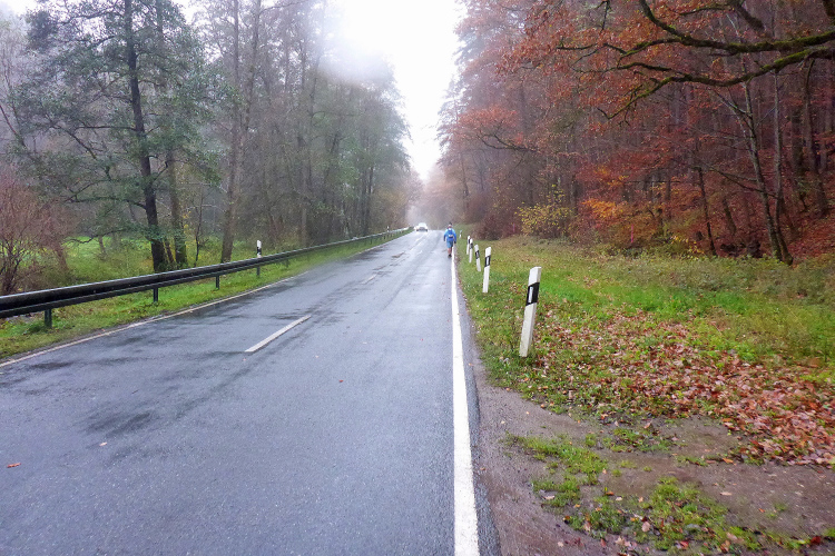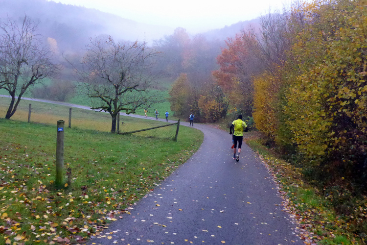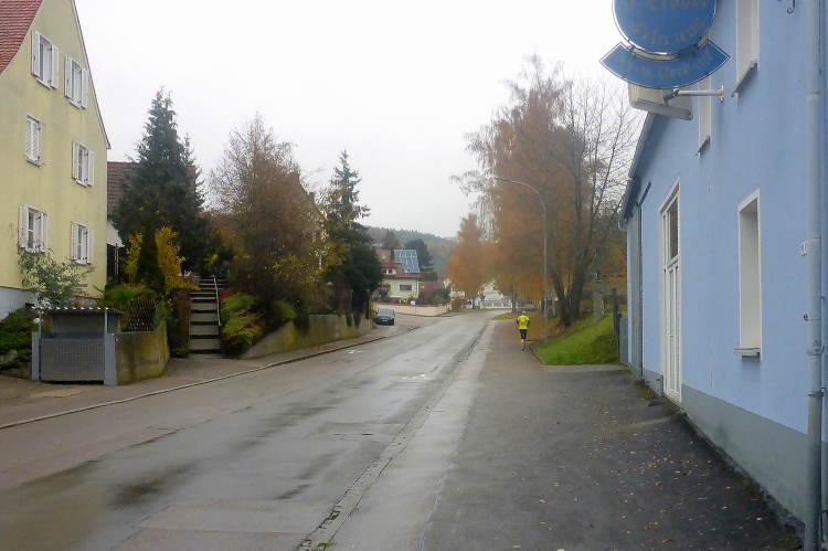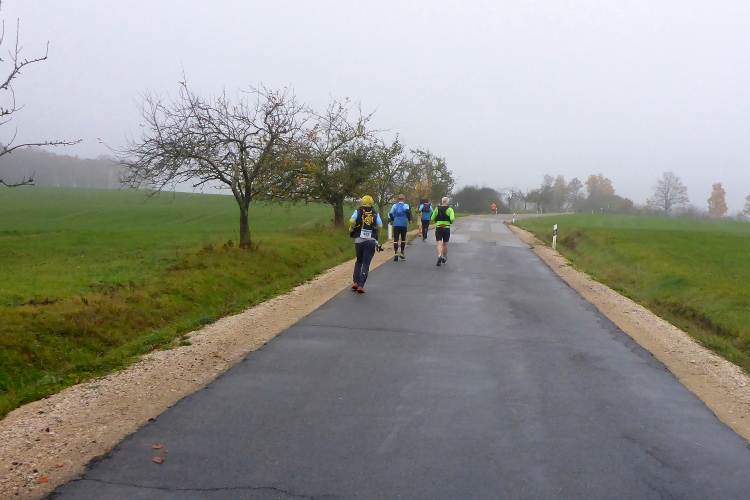 Über die Hauptstraße durchqueren wir den 100-Seelen Ort Theilenberg. Es geht wieder leicht abwärts, aber ich bin mittlerweile im Alarmmodus, wenn ich über 100 Meter keine Streckenmarkierung mehr sehe. Mein inneres Gefühl gibt mir recht, als ich mich umdrehe, winken mir zwei Mitläufer zu, ich solle umkehren. Die Straße ist nass, so habe ich den verwässerten Kreidepfeil übersehen. Heute ist irgendwie der Wurm drin. Mit dem Verläufer übernehme ich auch die Rote Laterne.