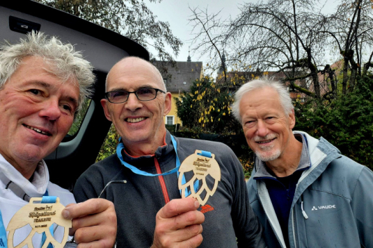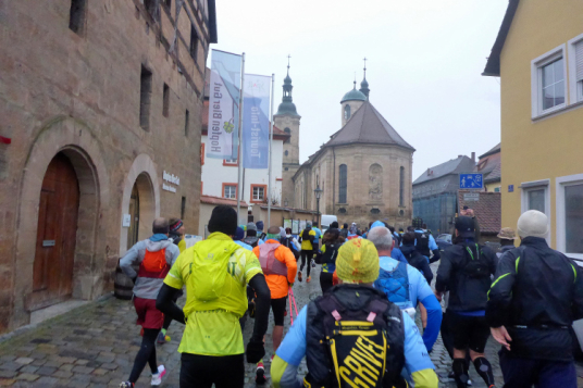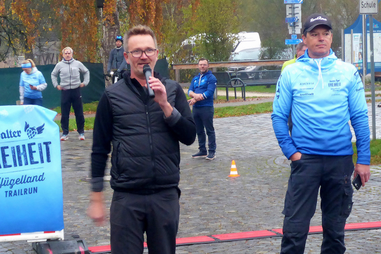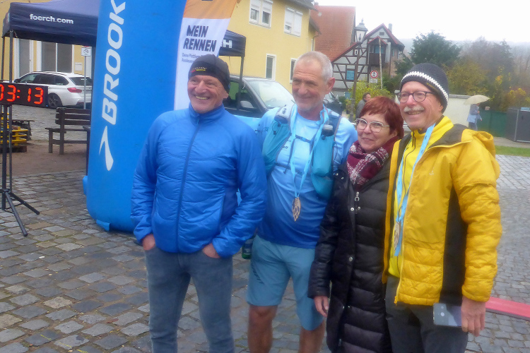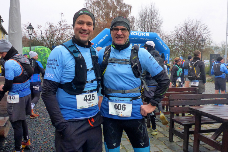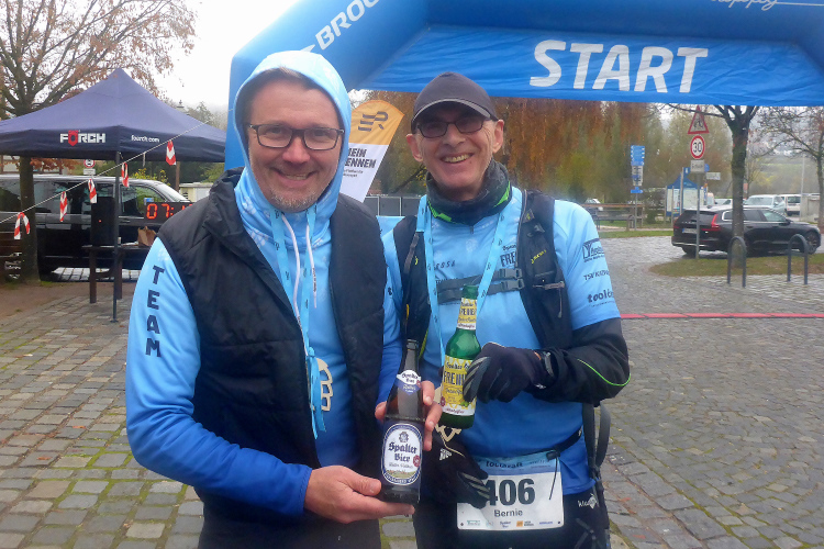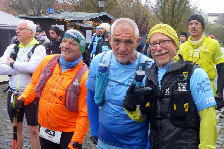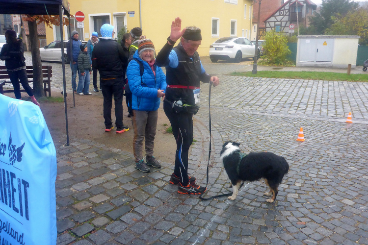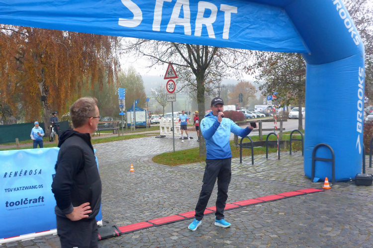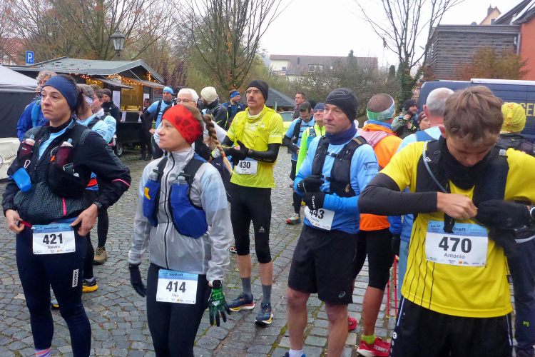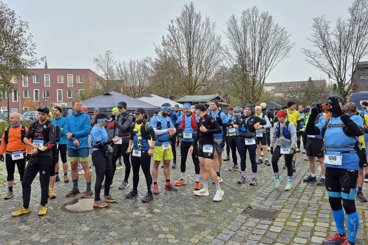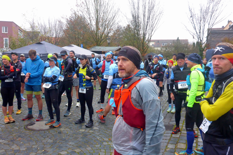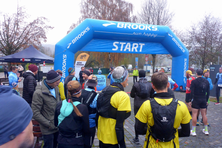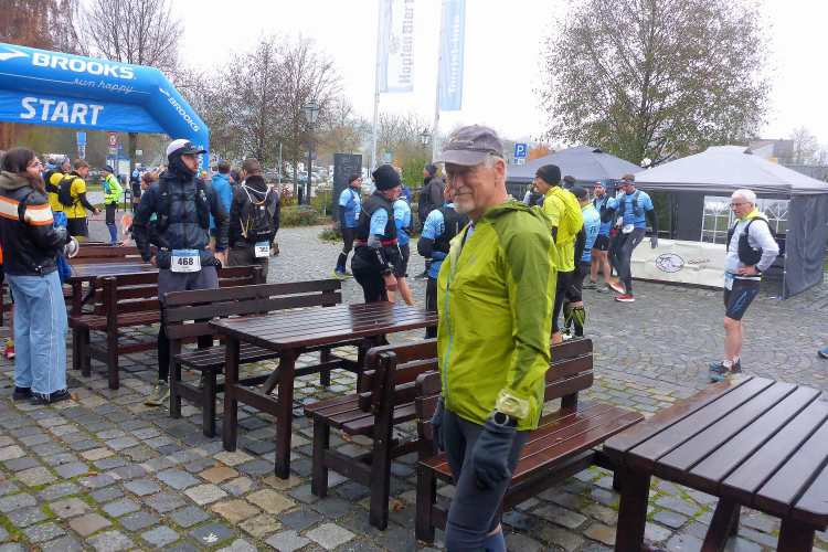 Wettermäßig hat sich leider in der Nacht auch einiges getan. Die Nebelglocke hat sich aufgelöst, dafür sind dichte Wolken aufgezogen, die auch immer wieder Regen mit sich bringen können. Aber immerhin  ist die Temperatur etwas gestiegen. So 7 bis 8 Grad C sind zu erwarten. Viele am Start haben auch wirklich das Läufershirt an, es steht sinnbildlich für die Unterstützung, die man von den drei Partnern erhält. Aber dem Wetter geschuldet, zieht es auch ein Teil vor, mit Regenjacke zu laufen, obwohl es derzeit gerade nicht regnet. Übrig geblieben von 100 Angemeldeten, sind heute noch 8 Frauen und 74 Männer, da haben es wohl einige vorgezogen, bei dem nasskalten Wetter zu Hause zu bleiben.