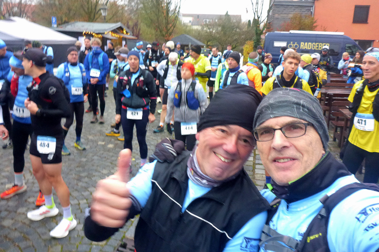 Mit dabei sind wieder einige gute Kumpels oder mir gut Bekannte, darunter auch Gerhard Börner, er erzählt mir, dass er mitverantwortlich für die Streckenausschilderung ist. Sollte ich mich verfranzen, kenn ich jetzt jemand, bei dem ich mich beschweren kann. Als ich kurz vor dem Start mein GPS starte, muss ich feststellen, dass ich vergessen habe, mir den Track auf die Uhr zu laden. Ist mir noch nie passiert, hoffentlich rächt sich das nicht. Pünktlich können wir loslegen.