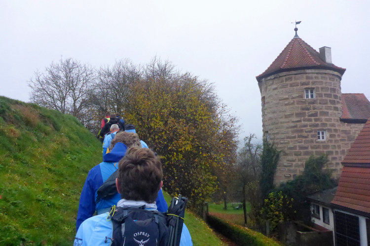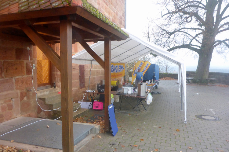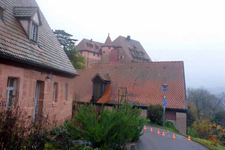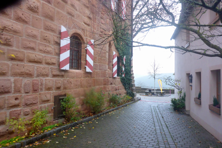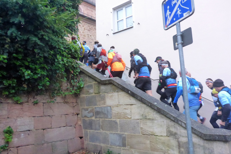 Bis Burg Wernfels sind es 500 m, dort liegt im Innenhof der ehemaligen Ritterburg nach etwa 13 km unsere nächste Labestelle. Den Streckenverlauf habe ich mir im Vorfeld genau angeschaut, ist nicht ganz easy. Auch hier könnte man die VP überspringen und gleich durchlaufen. Aber es gilt dasselbe wie schon an VP 1, im Burghof liegt eine Zeitmessmatte, die muss passiert werden.
