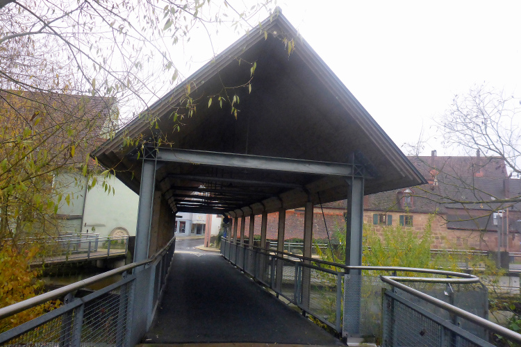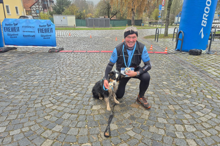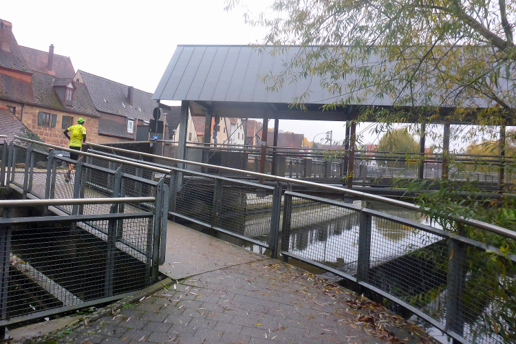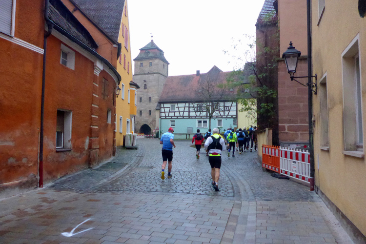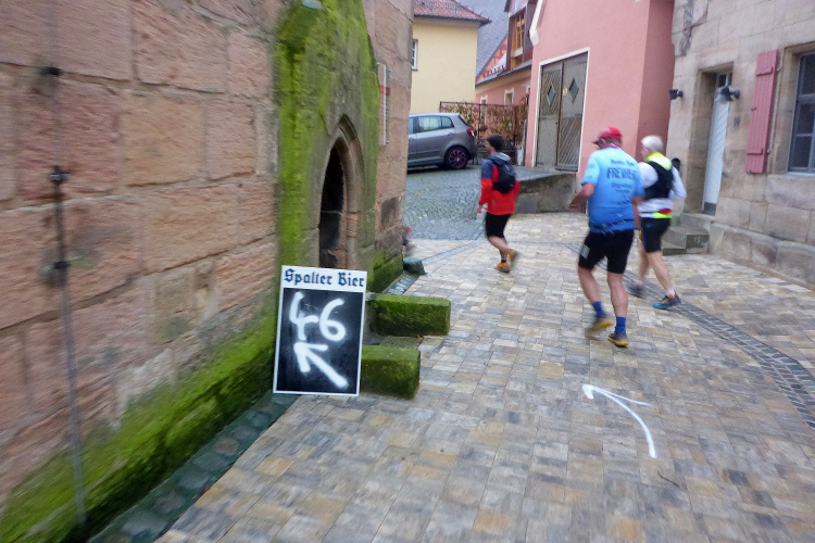 An der VP beginnt auch die neue Streckenführung des 46K, wir werden nach rechts auf die 6K-Schleife geleitet. Die letzten drei Kilometer unserer Runde führen uns kommod bergab nach Spalt. Oana geht no. Über eine überdachte Fußgängerbrücke überschreiten wir die Fränkische Rezat. Ich verpasse die scharfe Abzweigung, die uns ein Stück am Werkkanal entlang, eigentlich bis zum Zielbogen am Kornhaus führt. Stattdessen laufe ich eine Runde durch die Altstadt, an der Distanz ändert sich zwar nicht viel, aber mich ärgert es trotzdem. Wenn ich richtig zähle, war das jetzt bereits mein 6. Irrläufer. Immerhin in meinem gesteckten Zeitenziel von unter 3:15 Stunden kann ich meinen ersten Durchlauf beenden. Roland steht schon bereit zu Runde 2, er übernimmt jetzt seinen Hund, der ihn begleiten wird.