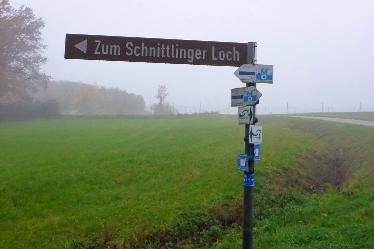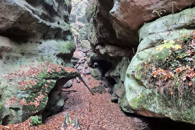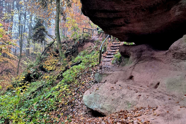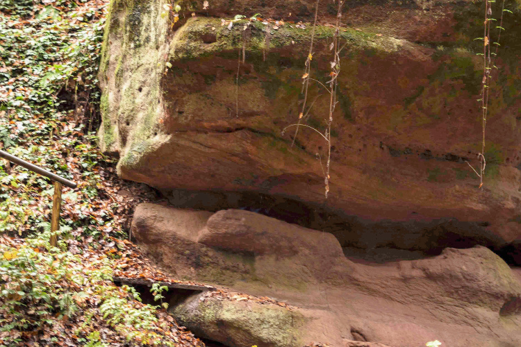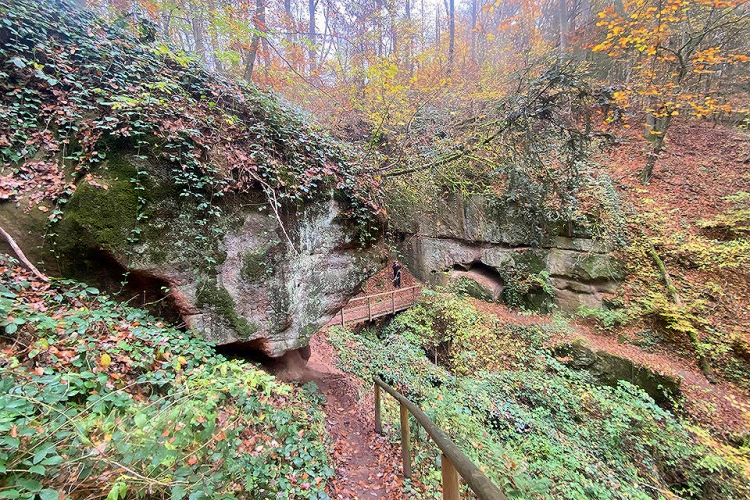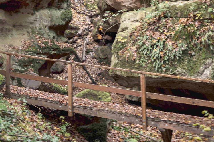 Über den Rücken des Galgenbergs führt unsere Strecke nach 3 km zum Schnittlinger Loch, einem ersten Höhepunkt unseres Kurses, wenn man mal von der ganzen Bierlandschaft absieht. Nein, im Ernst, wunderschön geht es durch die wildromantische Schlucht, die auch vom Bayerischen Landesamt für Umwelt als Naturdenkmal erfasst und als Geotop ausgewiesen ist. Fotografisch kann ich das heute leider nicht so festhalten, wie es die Schlucht verdient hätte. Meiner Kamera behagt das dunkle und feuchte Wetter leider überhaupt nicht, so dass ich nur ein paar vorzeigbare Bilder aufweisen kann, die mir zum Teil auch noch von Roland zur Verfügung gestellt wurden. Das Loch ist entstanden durch Unterwaschungen und Unterspülungen. Die Halbhöhlen und Felsabstürze mit einer Höhe von bis zu 15 m erstrecken sich über eine Länge von etwa 50 m. Zuerst geht es für uns kurz runter, über eine Brücke und direkt im Anschluss dürfen wir unter einer überhängenden Felswand wieder aufwärts klettern. Wirklich großartig.
