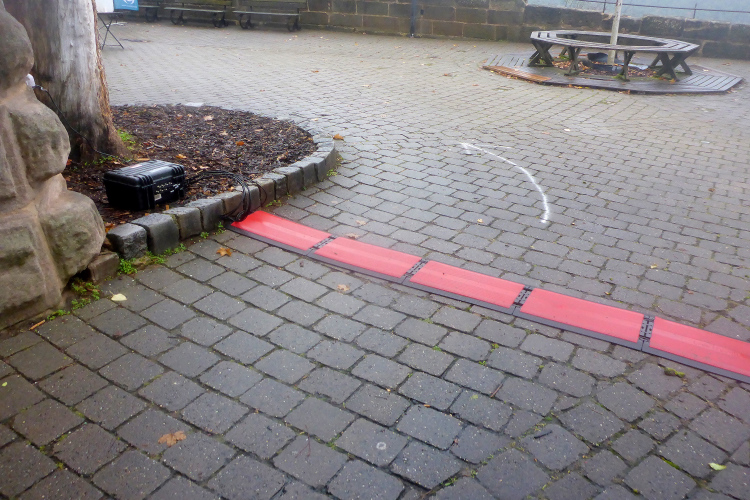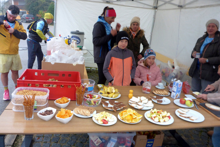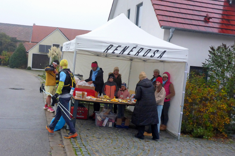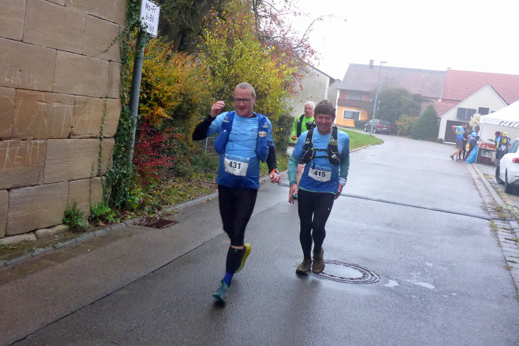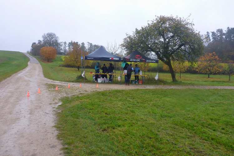 Weniger erfreulich hat sich mittlerweile die Wetterlage entwickelt. Immer wieder bekommen wir Wasser von oben ab, zum Glück nicht sonderlich stark, Fünf größere Aufstiege gibt es für uns pro Runde zu bewältigen, unser erster endet nach 5 Kilometern in Fünfbronn, wo zugleich auch unsere erste Versorgungsstelle eingerichtet ist. Hier gibt es für alle Teilnehmenden etwas Wichtiges zu beachten, auf die wir auch beim Briefing explizit hingewiesen wurden. Die Labestelle liegt etwa 50 Meter neben unserer Laufstrecke in einer Nebenstraße, nicht jeder möchte sich vielleicht nach 5 km bereits verpflegen und spielt mit dem Gedanken, den Besuch zu überspringen. Das ist nicht möglich, da unmittelbar vor der Station eine Zeitmessmatte ausgelegt ist und die muss passiert werden, sonst ist man raus aus der Wertung.