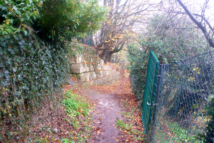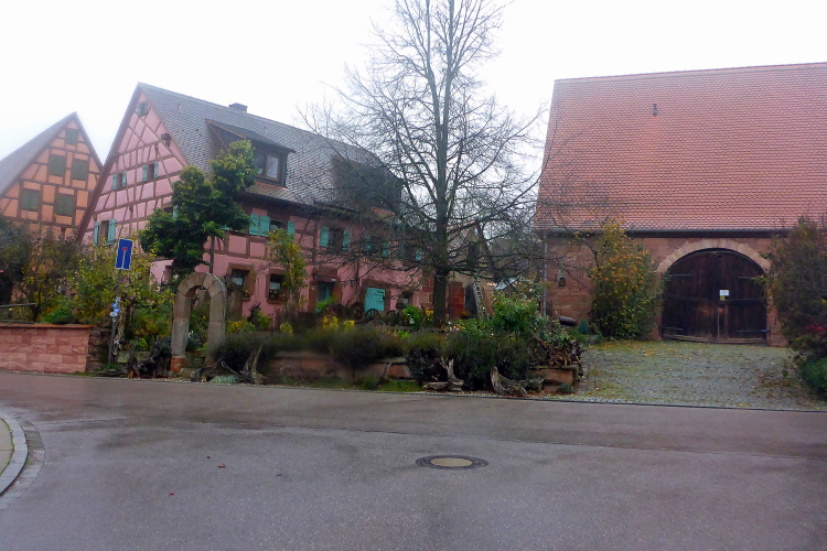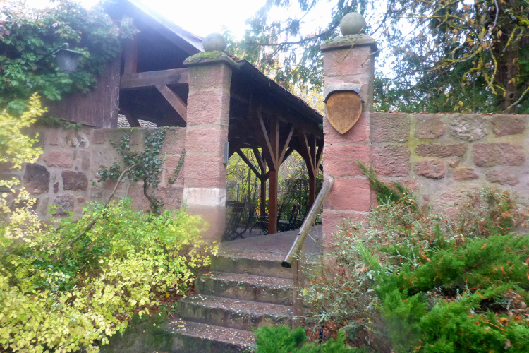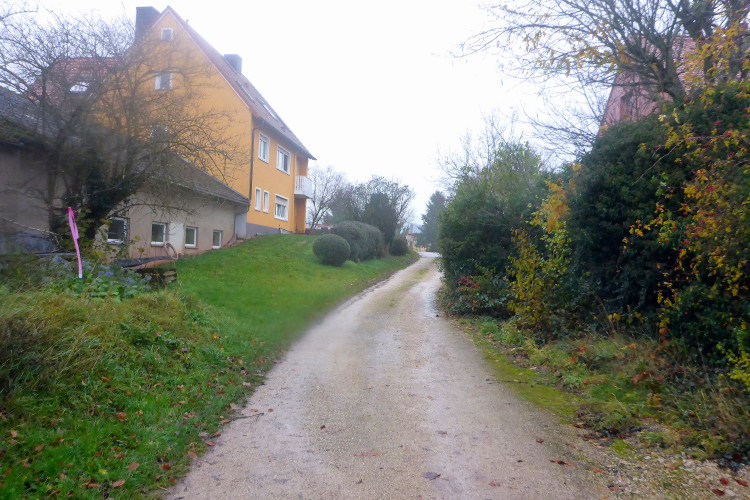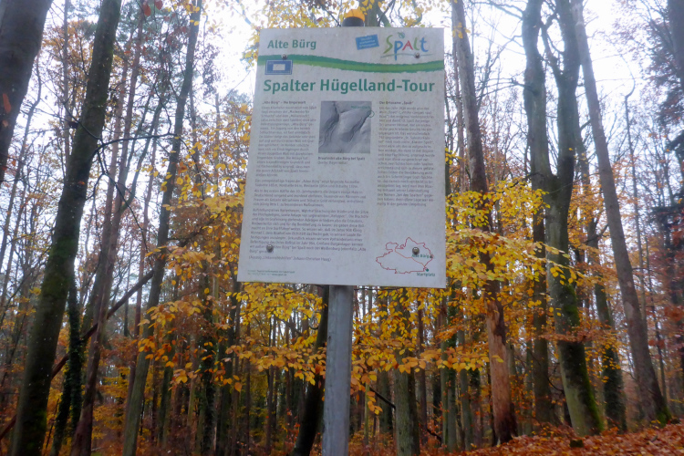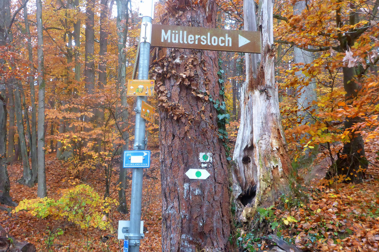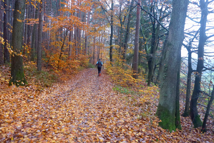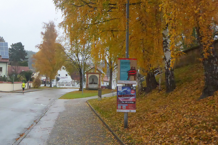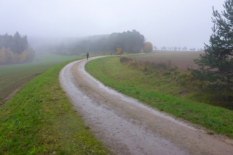 Am nördlichen Ortsende von Spalt werden wir von einem Helfer nach links eingewiesen, wo wir wenig später wieder in den Wald eintauchen. Ein Hohlweg führt uns Richtung Müllersloch, das wir aber nicht zu Gesicht bekommen. Vorher geht es nach links Richtung Massendorfer Schlucht. Ein schöner, leicht abwärts führender, mit Blättern übersäter Weg, lässt mich wieder etwas Tempo aufnehmen. Es läuft wirklich gut. Zu gut. An der nächsten Gabelung kann ich keine Markierungen entdecken. Ich erkunde beide Wege. Hier sind keine Pfeile oder ähnliches. Ich bewege mich auf dem hergekommenen Weg 200 Meter zurück. Nichts. Fünf Minuten irre ich umher. F… Der Wald muss einige laute Flüche schlucken. Ich bin vollkommen frustriert. Es wird mir nie wieder passieren, keinen Track auf meine Uhr zu laden. Plötzlich taucht meine Rettung auf. Karl winkt mir und dirigiert mich wieder bis zum richtigen Abzweig zurück. Zwischen den vielen Blättern ist am Boden tatsächlich ein Schild mit Pfeil platziert. Könnte man schon sehen, wenn man aufmerksam ist.