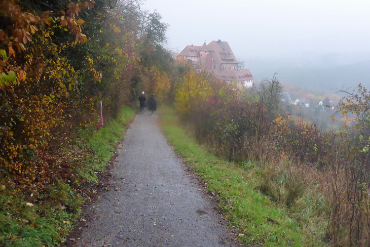 Beim Verlassen der Burg kommt mir Roland entgegen, ihn habe ich schon vor 10 Kilometern aus den Augen verloren, auch er hat in Theilenberg die Abzweigung übersehen. Hat es aber nicht so schnell bemerkt und ist weitergelaufen, so musste er einen weiten Bogen Umweg einlegen. Und jetzt kommt auch noch Larissa, vom Leistungsniveau müsste sie weit vor mir liegen, schätze ich. Sie ist auch ganz verzweifelt wegen ihrer Irrläufer und will sich daher heute mit der halben Strecke begnügen.