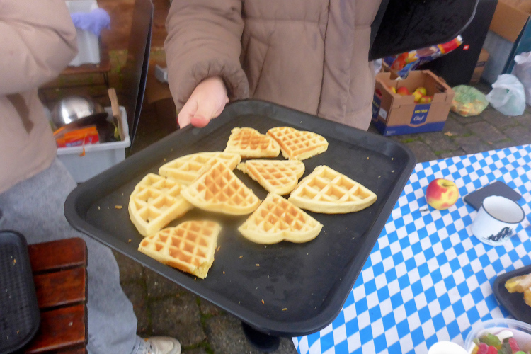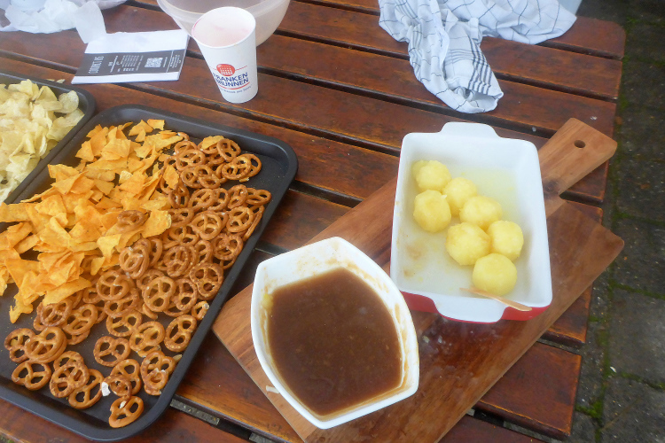 An der VP im Hinterhof werden mir gleich frische Waffeln angeboten. Das Angebot ist wieder derart reichlich, dass man gar nicht weiß wo man hinlangen soll. Es gibt jede Menge Obst, belegte Brotschnitten (auch Vegan), Nüsse, Gummibärchen, Schoki und vieles mehr. Als Device hat man hier: Gels werdet Ihr bei uns nicht finden. Die machen nur unnötigen Müll und schmecken nur bedingt. Um den Abfall zu vermeiden, ist auch jeder dazu angehalten, seinen eigenen Trinkbecher mitzuführen. Diesen packe ich jetzt auch aus und lasse ihn mir mit „Spalter Freiheit“ füllen. Schmeckt super.