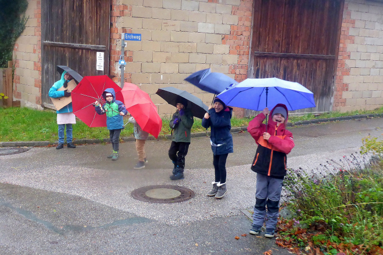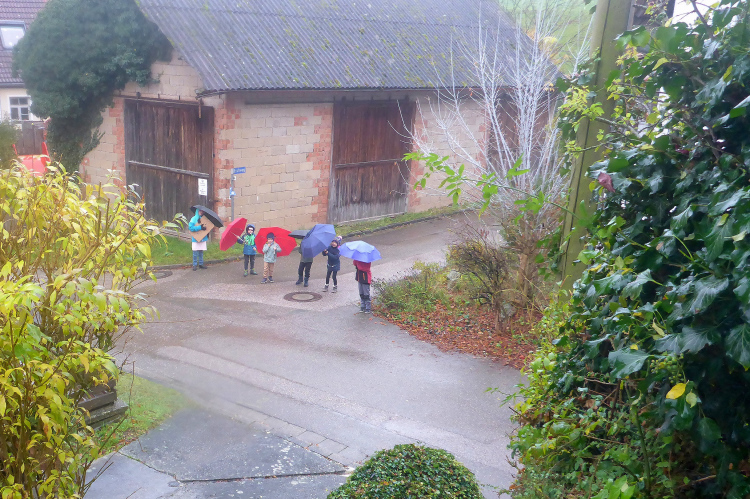 Wie schon erwähnt, ist die Streckenführung rund um die Burg nicht ganz einfach, ich muss mich richtig konzentrieren, um den richtigen Weg durch die vielen Pylonen und Pfeilmarkierung zu finden. Aber es klappt …ausnahmsweise und ich finde den richtigen Weg seitlich der Burgmauern entlang. Steil geht es auf schmalen Pfaden nach unten. Eine Gruppe von Kindern empfängt mich fast im Tal unter ihren Regenschirmen mit Jubel.