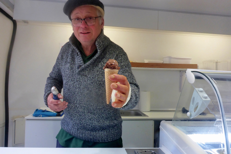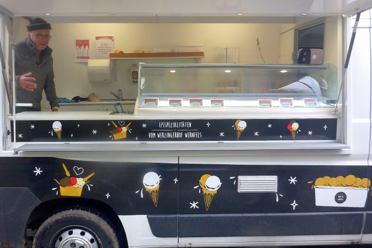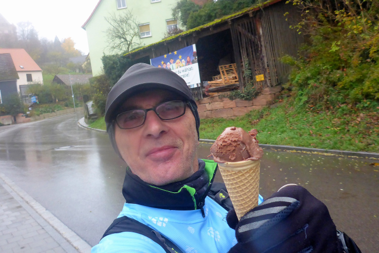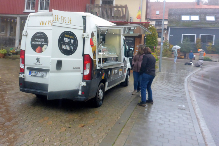 Hundert Meter weiter steht am Hof der Familie Pfahler der Eiswagen. Ja, wirklich, er gehört zum Verpflegungskonzept der Veranstaltung. Ich weiß nicht, wie viele Kugeln selbstgemachtes Bauernhofeis er heute schon an den Mann bzw. Frau gebracht hat - eigentlich ist mir bei dem Wetter ja auch nicht danach - aber ich opfere mich, Eine Kugel Schoko in der Waffel kann man auch im Laufen genießen.