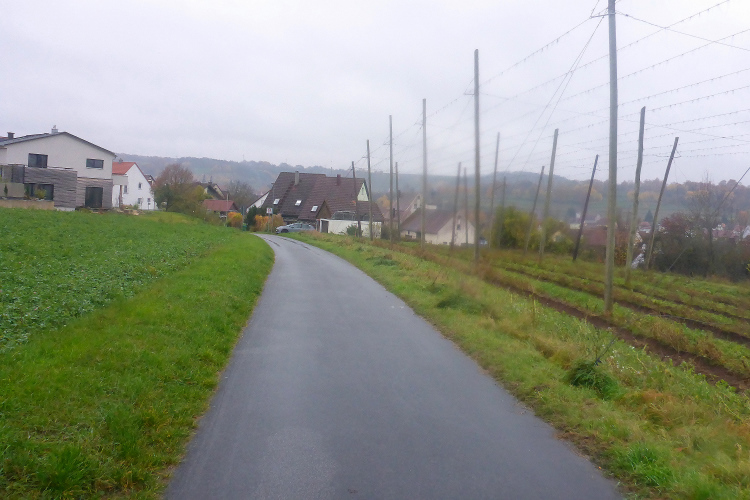An der ehemaligen Stadtmauer und dem Reifenturm verlassen wir den Ort immer noch leicht aufwärts. Auf dem Galgenberg streifen wir nun die ersten Hopfenfelder. Hier wird der hochfeine Edelaromahopfen angebaut, der dem Spalter Bier seinen besonderen Geschmack verdankt. Er ist fünfmal wertvoller als viele andere Hopfensorten.