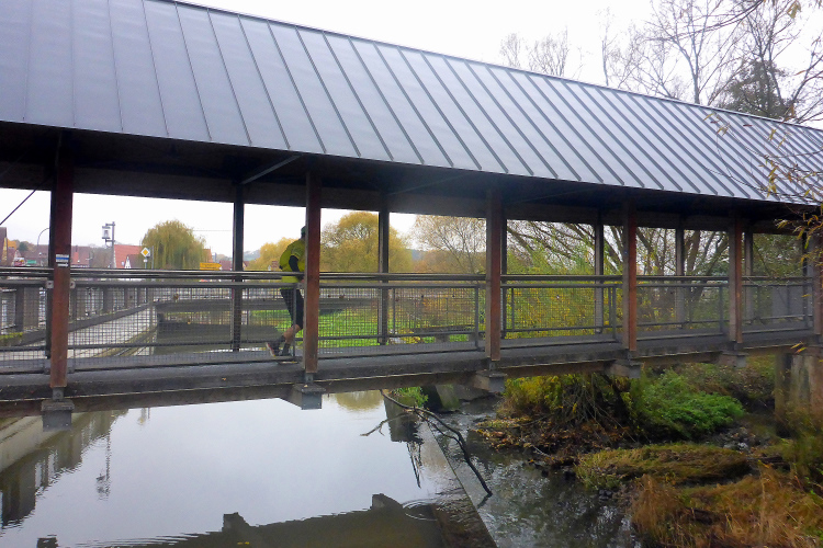 Nach nur einer ganz schnellen Verpflegungspause vor dem Kornhaus begebe ich mich umgehend ebenfalls auf die zweite Runde. Diesmal verfehle ich den Weg über den Werkskanal nicht. Zu meiner Verwunderung kommt mir Karl entgegen. Jetzt verstehe ich gar nichts mehr, er müsste eigentlich auch ein gutes Stück vor mir liegen, schon lange habe ich ihn aus den Augen verloren. Ich kann nur mutmaßen: noch einer der vom rechten Weg abgekommen ist. Dazu überholt mich auch noch ein weiterer Mitläufer, mit dem ich auf den Anfangskilometern kurz unterwegs war. Das scheint heute wohl nicht nur für mich nicht ganz so einfach zu sein, den richtigen Kurs zu finden.