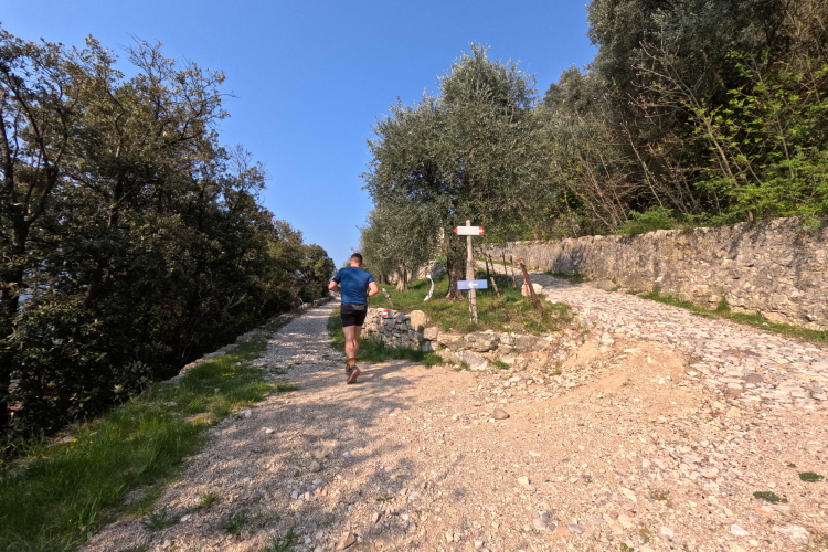 Über die Uferpromenade durchmessen wir das wunderschöne Örtchen und werden auf den ersten zwei km, gestern haben wir das ja schon ermitteln können, etwa 75 Höhenmeter nehmen. Vorbei an Olivenbäumen, Privat- und Feriendomizilen genießen wir bereits jetzt die grandiose Aussicht auf den See. Einen, vielleicht sogar den absoluten Höhepunkt des Laufs, erleben wir auf den km 3 und 4.
