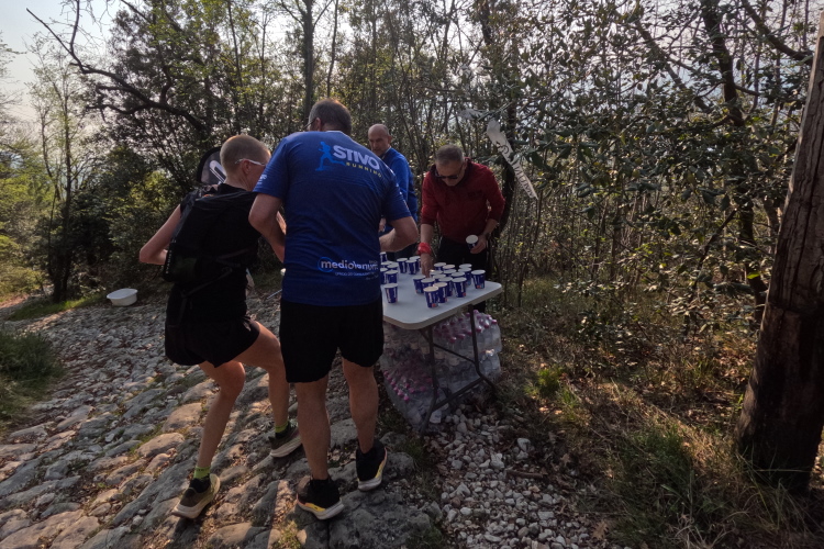Nach guten sieben km ist, schweißgebadet, endlich der Scheitelpunkt erreicht, wo man mich mit einem nicht angekündigten VP überrascht. Das Bergab ernüchtert mich etwas, da es mir wieder mal brutal meine technischen Unzulänglichkeiten bewusstwerden lässt. Witzigerweise führt uns der letzte km die Via Monti hinab, unmittelbar an unserem Ferienhaus vorbei. Gute 500 m muss ich aber noch weiter, wo uns unsere Frauen nach 9,6 km und 529 HM beglückwünschen und wir uns gemeinsam der After-Run-Party hingeben. Wir, auch unsere Begleiterinnen, genießen eine Zielverpflegung, die selbst die Rewe-Dörfer in Bonn und Köln in den Schatten stellt. Wo bitte gibt’s denn nach dem Lauf z.B. Aperol Spritz bis zum Abwinken und das auch noch mit richtig Bums?