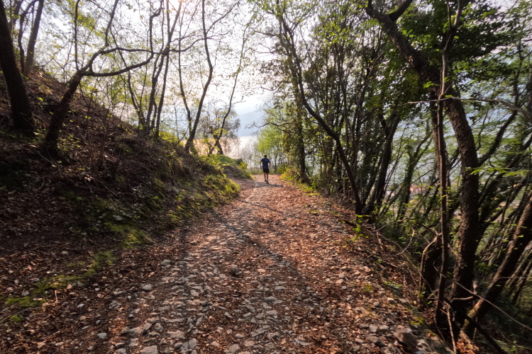 Aus dem malerischen Ort geht es für meinen Freund Günther aus Tirol, mich und alle anderen ohne Zeitnahme, deshalb aber kaum weniger flott, ans Seeufer Richtung Norden. Einen flachen guten km wiegt man uns in trügerischer Sicherheit, bevor es ins Eingemachte geht. Und wie! Gute fünf km jagt man uns auf unterschiedlichsten Untergründen in fast nur eine Richtung: Steil aufwärts! Vieles ist für mich und meinesgleichen kaum bis nicht laufbar, was dem Trailvergnügen aber in keinster Weise schadet. Die Wegebeschaffenheit erinnert mich teilweise an meine nicht wenigen hochalpinen Läufe.