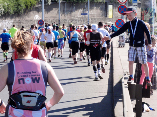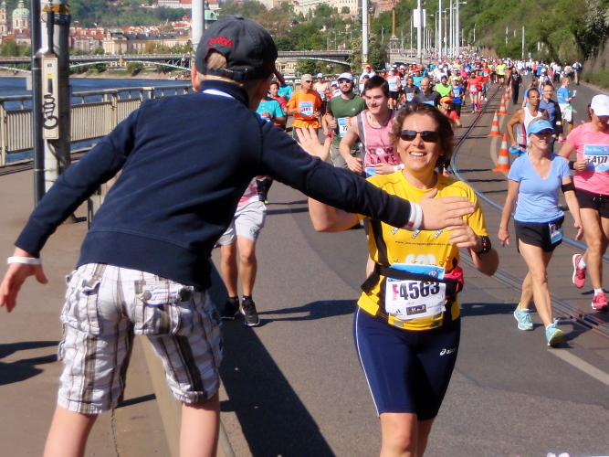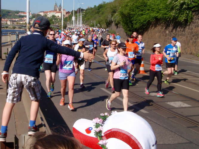 Nach der „Triumphsymphonie“ der Sehenswürdigkeiten in der Prager Innenstadt ist jetzt läuferische Entspannung angesagt. Es ist schön, fast immer am Moldauufer mit Blick auf den Fluss zu laufen und endlich auch zu seinem Rhythmus zu finden. Kurz vor Kilometer 6 beeindruckt ein etwa neunjähriger Junge, der freihändig auf einer Leitplanke balancierend die Läufer abklatscht – und dabei gleichwohl nicht das Gleichgewicht verliert. Seine offenkundige Freude macht spontan so gute Laune, dass ich kurz stehen bleibe, um ihn von allen Seiten zu fotografieren. Auch einer Läuferin bereitet das Abklatschen offensichtlich große Freude. Die Szene ist bezeichnend für den gesamten Marathon, denn immer wieder gibt es viele Zuschauer an der Strecke, viele Kinder wollen abklatschen und die Stimmung ist super gut. Es ist wirklich schön, heute Prag zu erleben, sei es als Läufer oder als Zuschauer. In der Altstadt und an den Moldauufern sind alle in ausgelassener Festtagsstimmung! Und besonders schön: Prag ist heute auf der Laufstrecke autofrei zu genießen!